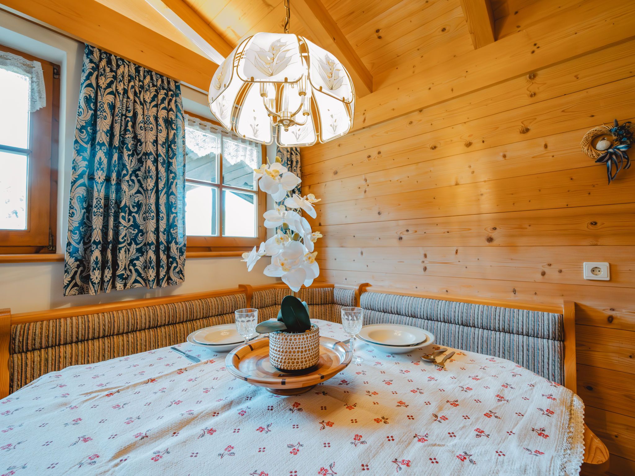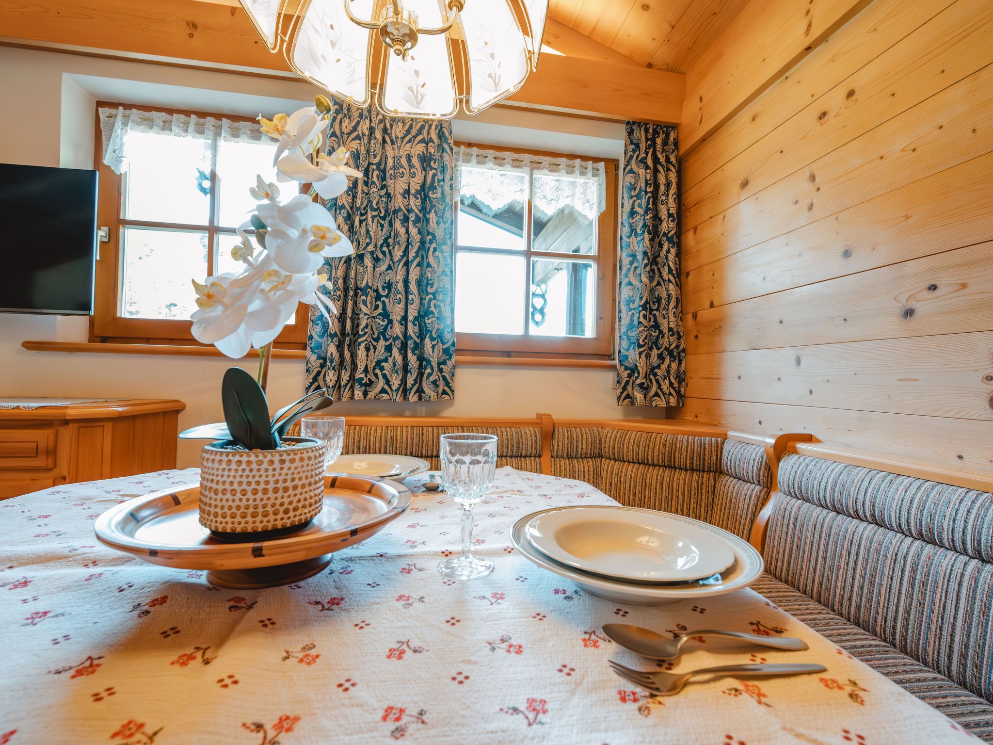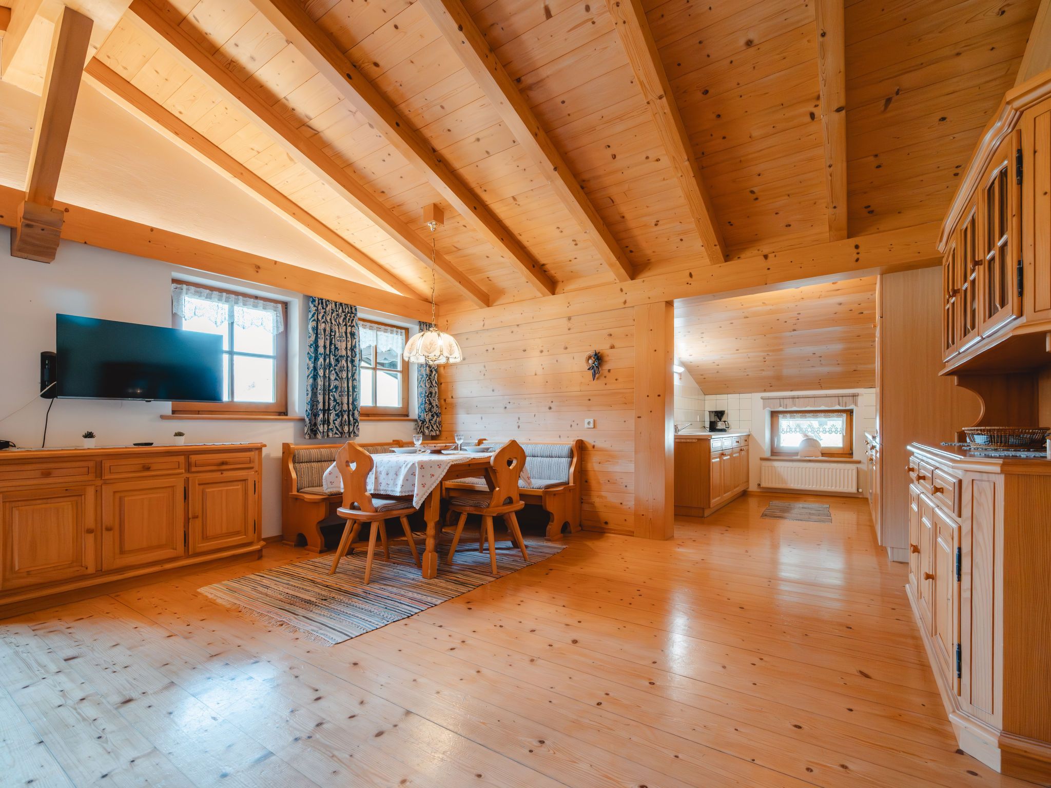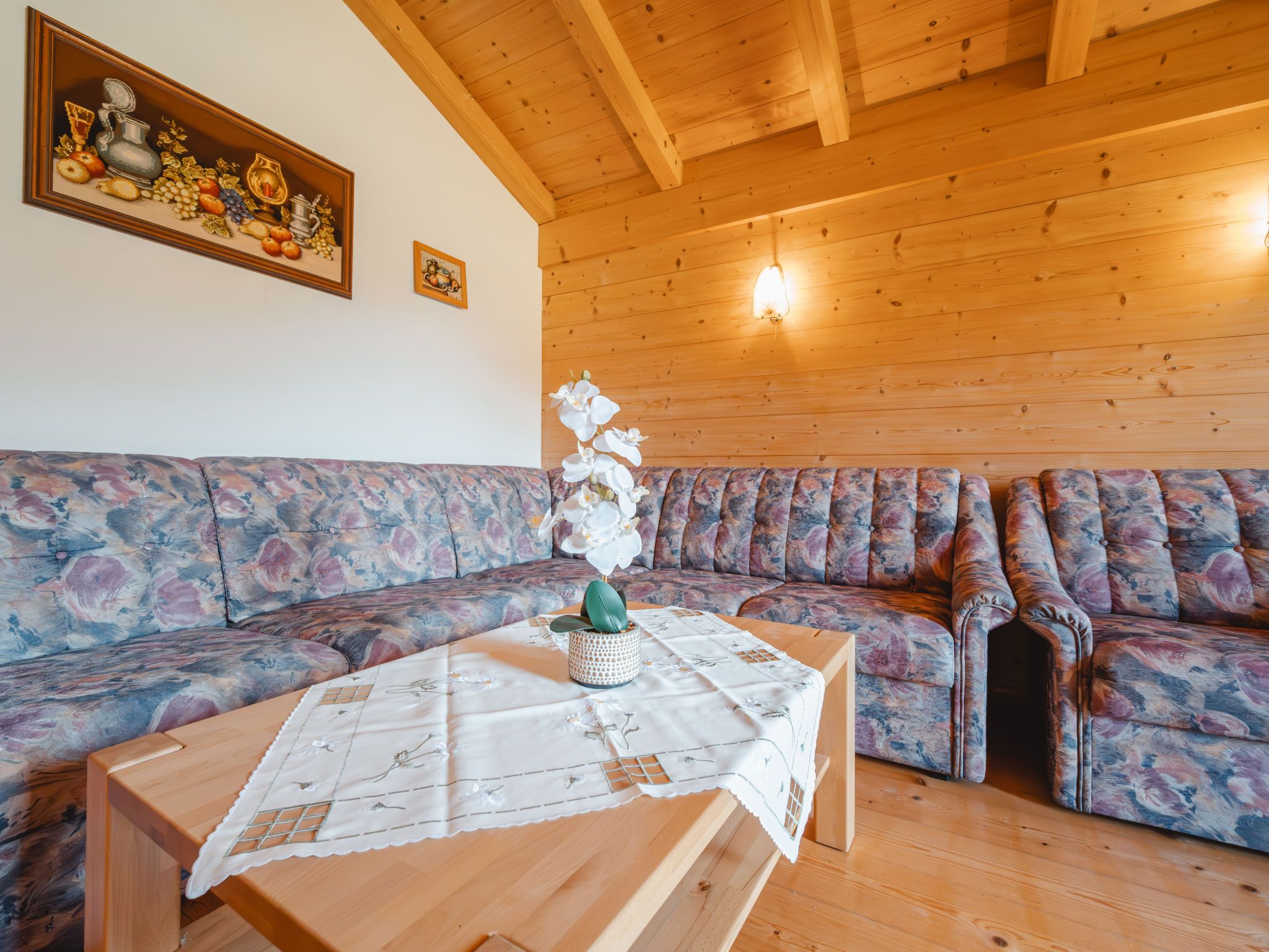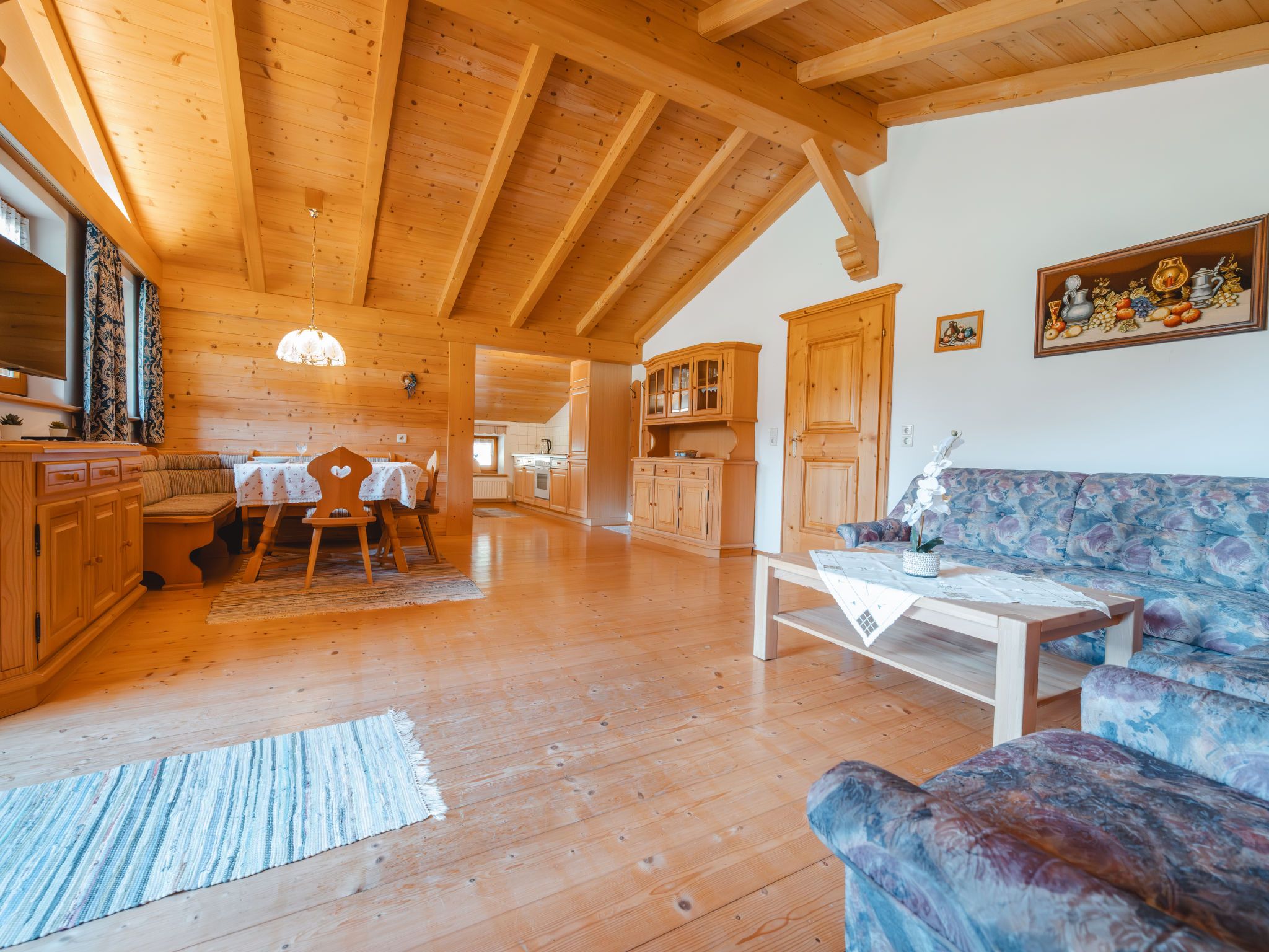 Spielberg, 2-Zimmer-Wohnung 63 m2 im 2. Stock. Gemütlich und mit viel Holz eingerichtet: Wohn-/Esszimmer mit 1 Diwanbett, Esstisch, Essecke, Sat-TV und E-Heizung. Ausgang zum Balkon. 1 Doppelzimmer. Grosse, offene Küche (4 Kochplatten, Backofen, Geschirrspüler, Toaster, Tiefkühler, elektrische Kaffeemaschine) mit Esstisch, Essecke und Sat-TV. Dusche/WC. Heizung. Parkettboden. Grosser Balkon. Balkonmöbel. Sehr schöne Panoramasicht. 50620-000788-2022