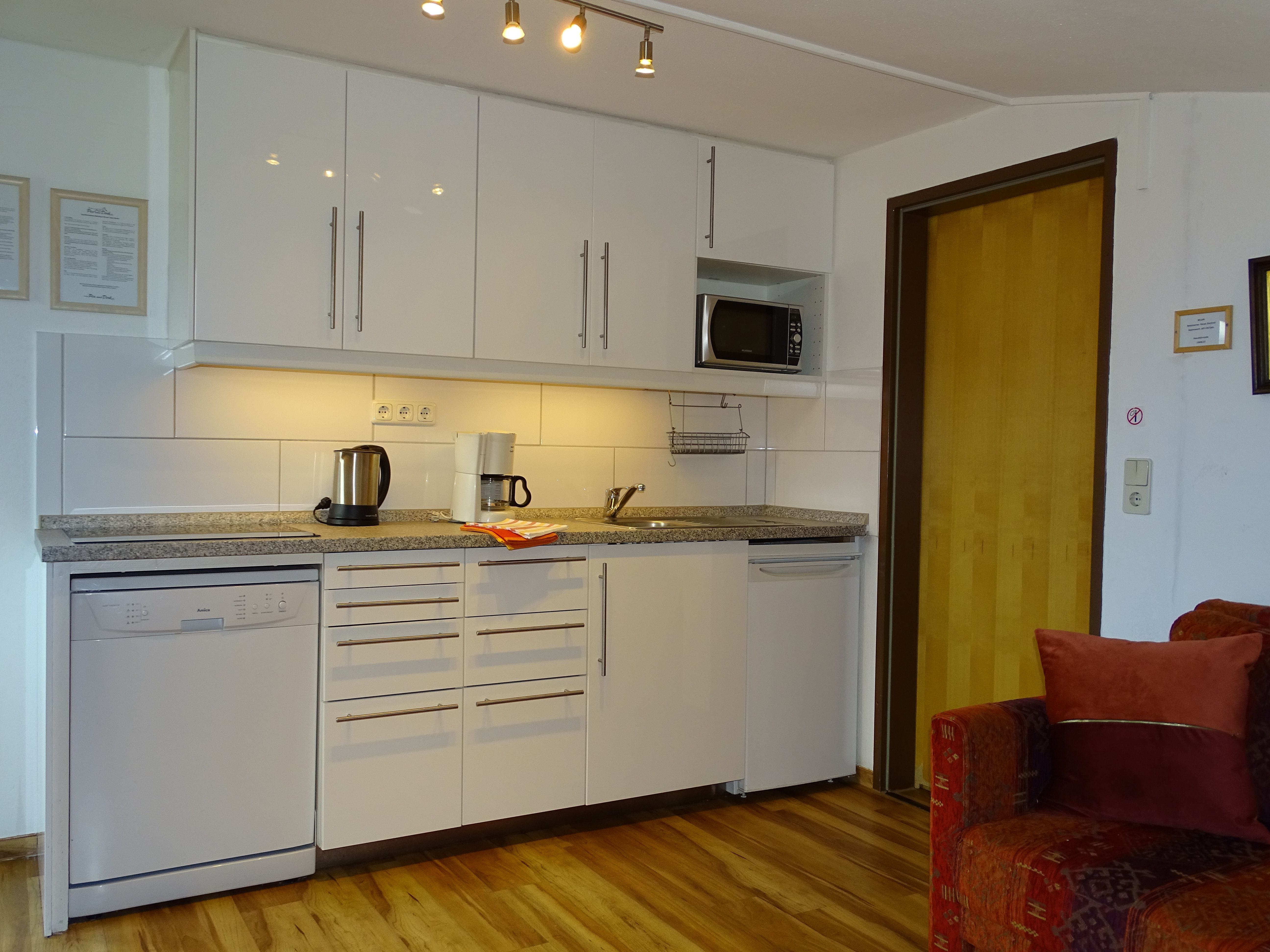 - Neue Küchenzeile mit Spülmaschine, Kühlschrank, Cerankochfeld mit 4 Platten, meist Kombi-Backofen/Mikrowelle, Kaffeemaschine, Ess- und Kochgeschirr