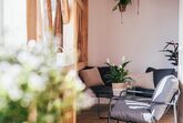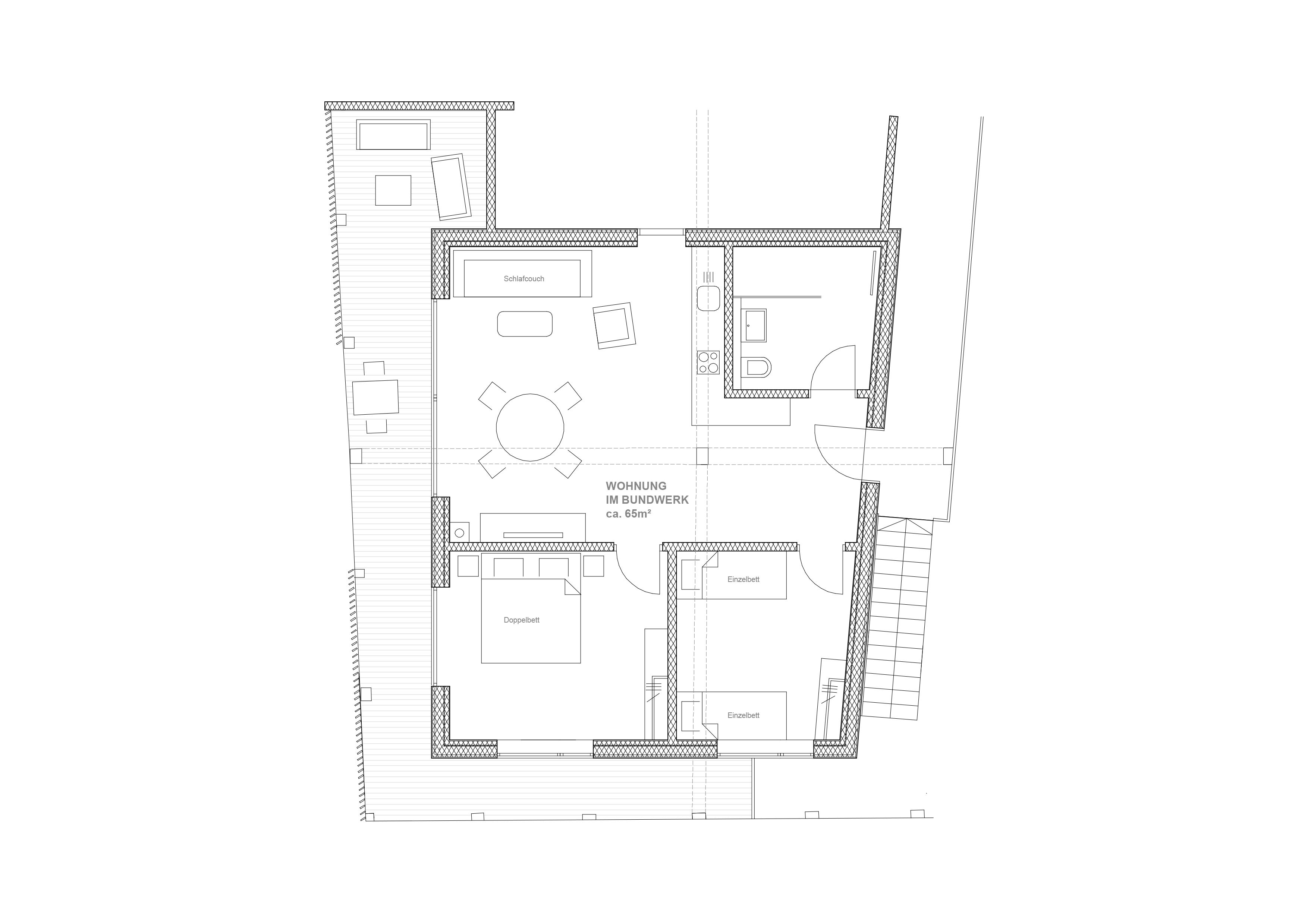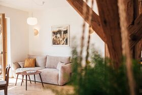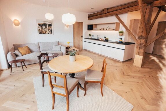 Wohnung. Hier wohnt ihr direkt zwischen den fast 150 Jahre alten Balken, die mitten durch die Wohnung gehen.