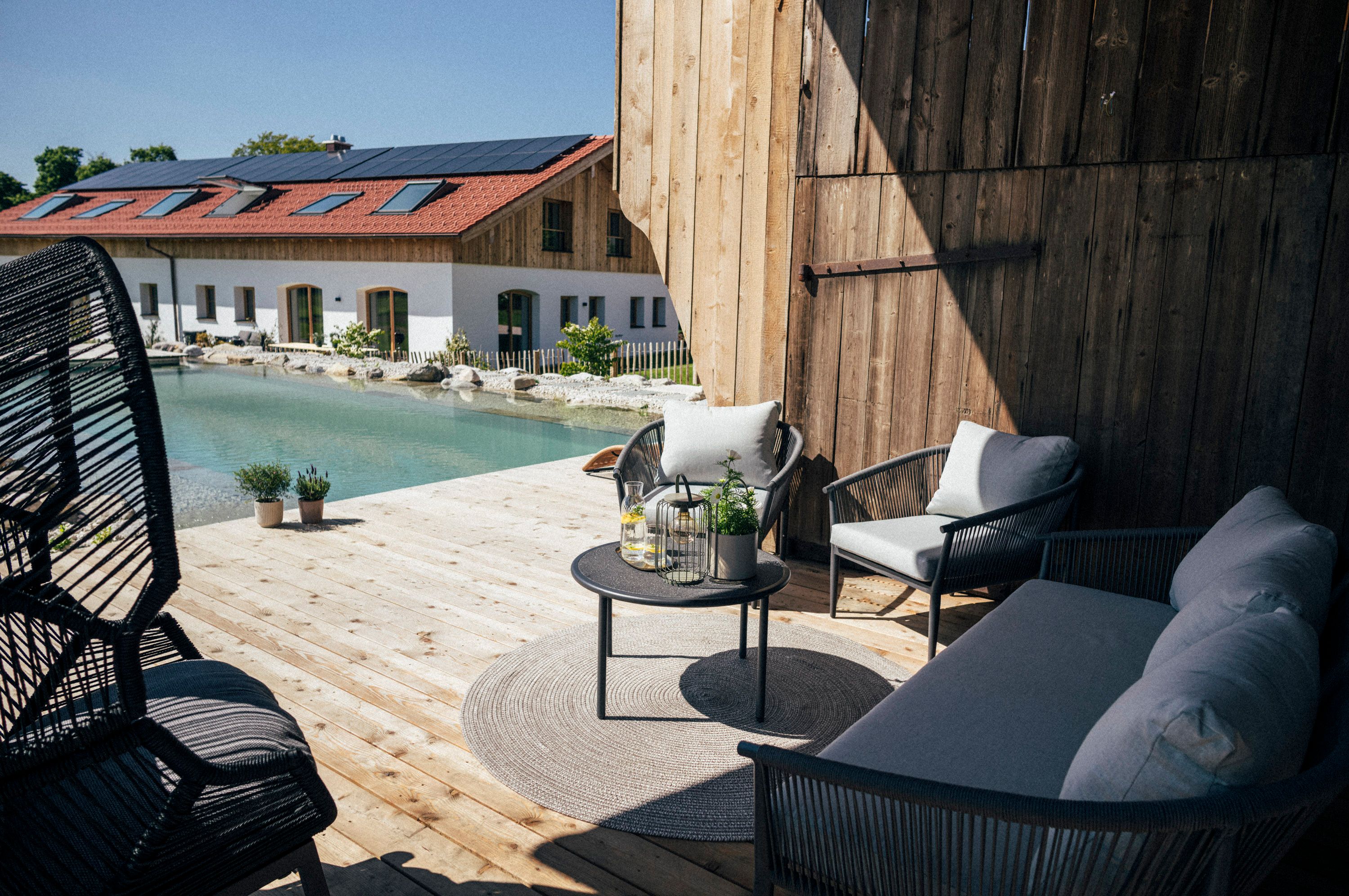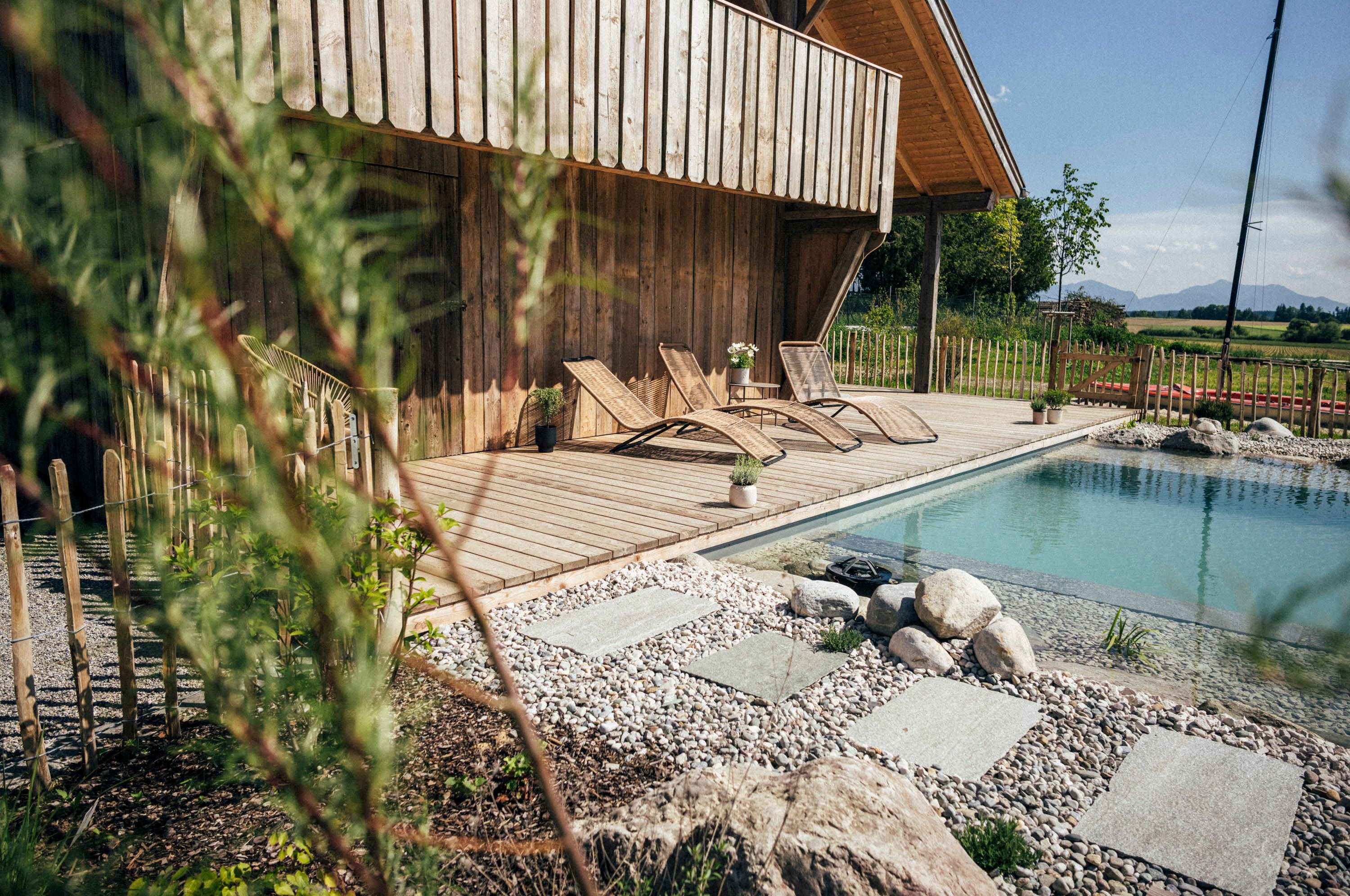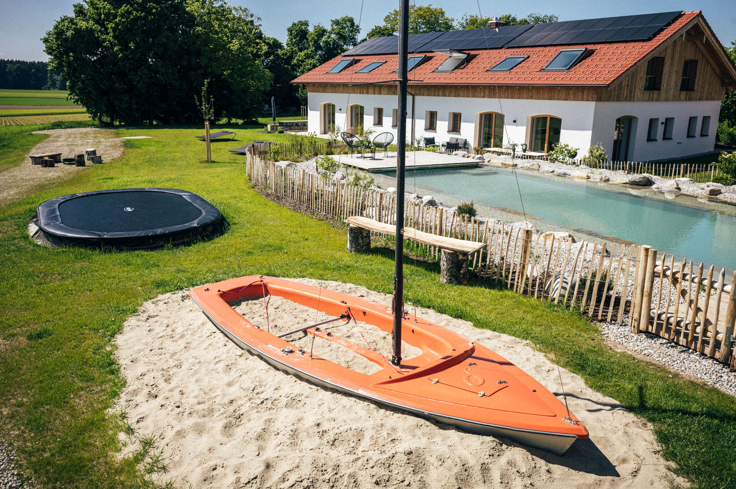 In unseren Grünflächen am Hof können groß und klein im schönen neuen Naturpool und den Wiesen rundherum Erholung finden, oder sich an Trampoin, Schaukel und Sandspielbereich austoben.