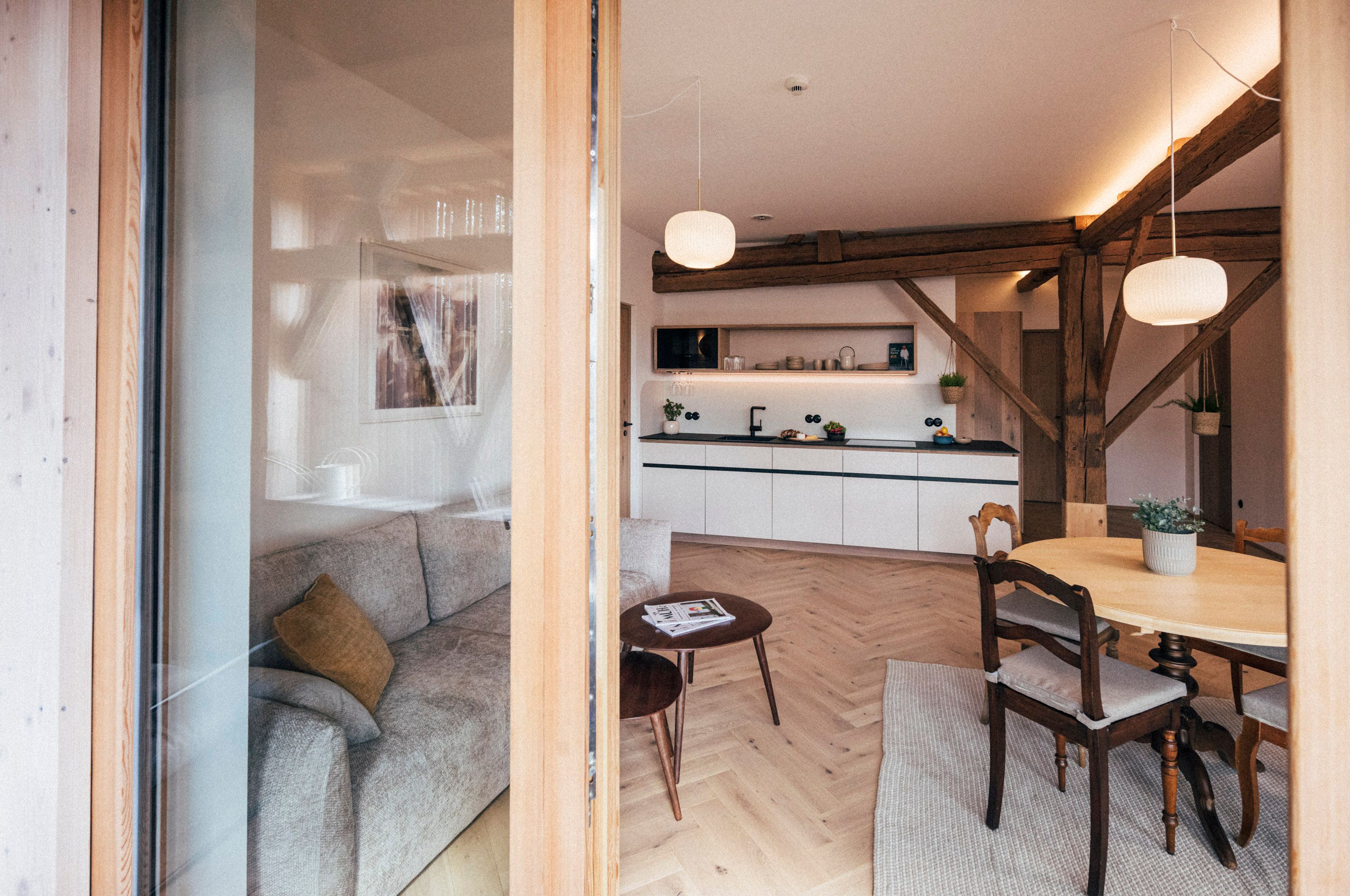 Der gemütliche Hauptraum lädt Euch ein zum Verweilen, Kochen, Spielen und beisammen sein. Die Couch und das Flachbild TV Gerät mit Magenta TV bietet alles für einen entspannten Fernsehabend. Am runden Esstisch könnt ihr lustige Spielerunden verbringen. Vom Wohnraum aus habt ihr Blick über den Garten und Schwimmteich Richtung Berge. Öffnet die großen Terrassentüren und macht den Innenraum zum Aussenbereich. Der im inneren der historischen Holzfassade, aber ausserhalb der Wohnung liegende Balkon und Loggiabereich bietet Euch einen Aussenbereich besonderer Art, in dem ihr ruhige Stunden mit der goldenen Abendsonne im Gesicht verbringen könnt.