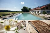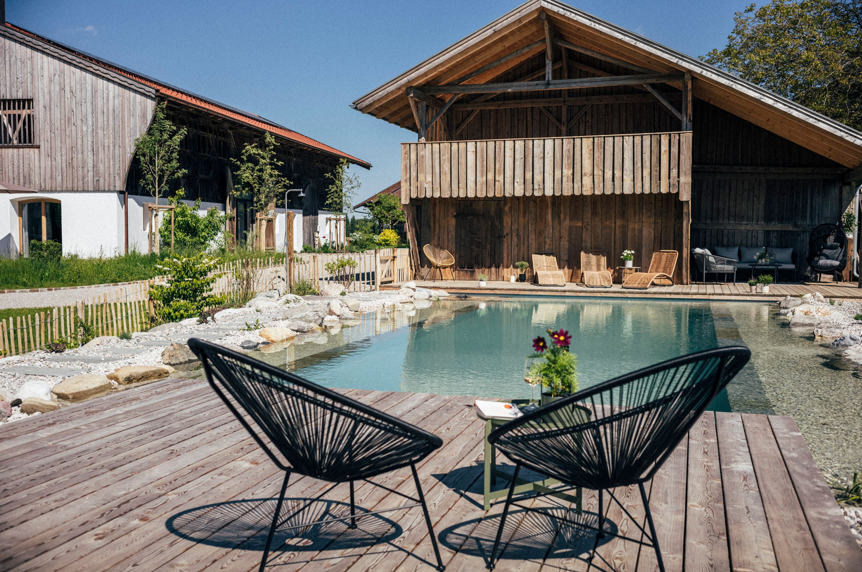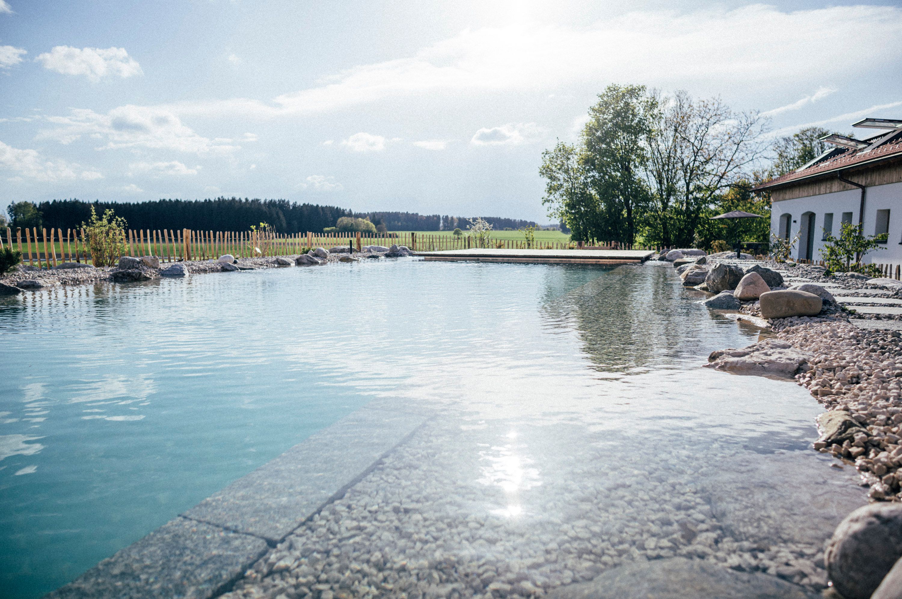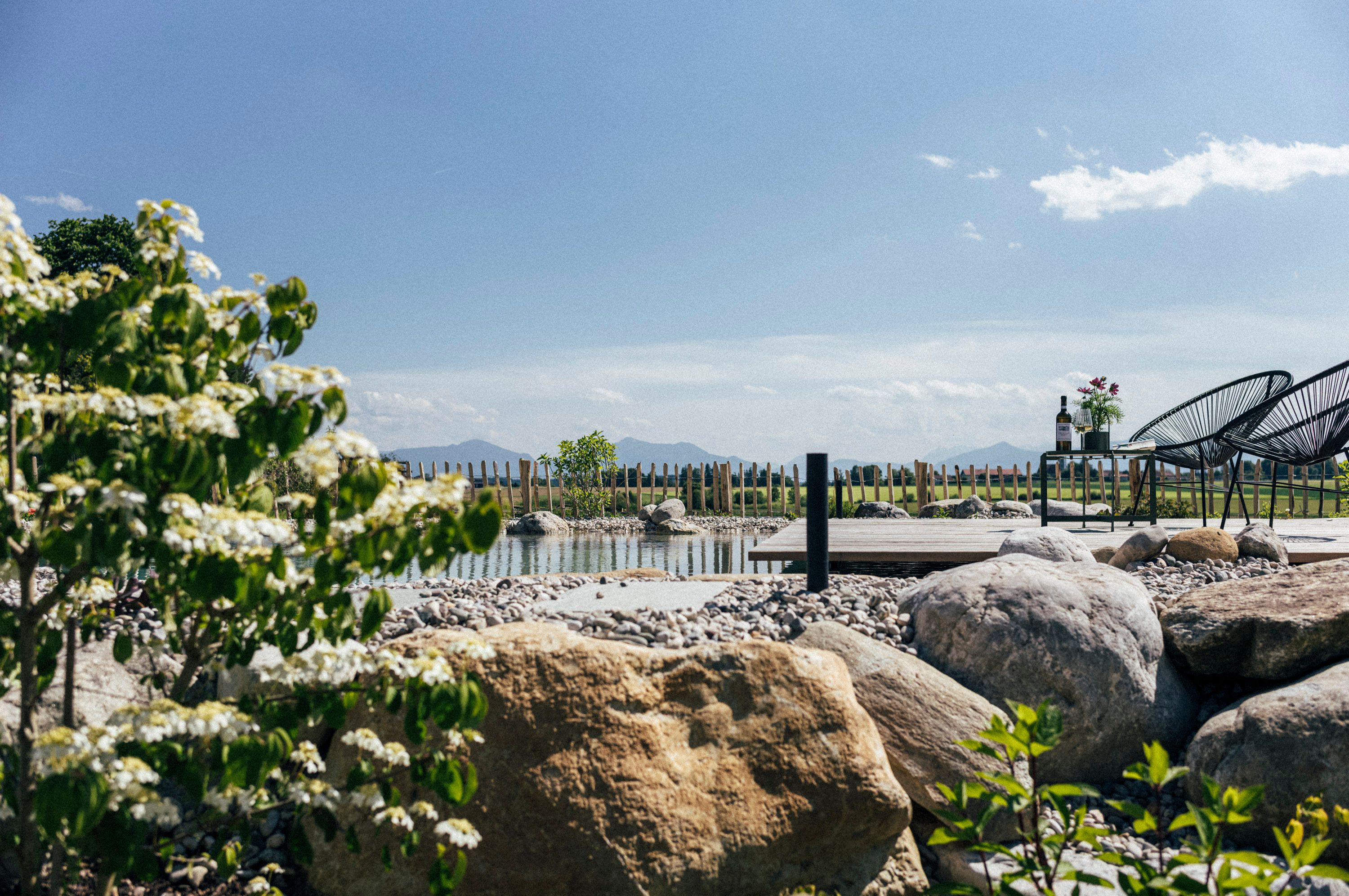 In unseren Grünflächen am Hof können groß und klein im schönen neuen Naturpool und den Wiesen rundherum Erholung finden, oder sich an Trampoin, Schaukel und Sandspielbereich austoben.