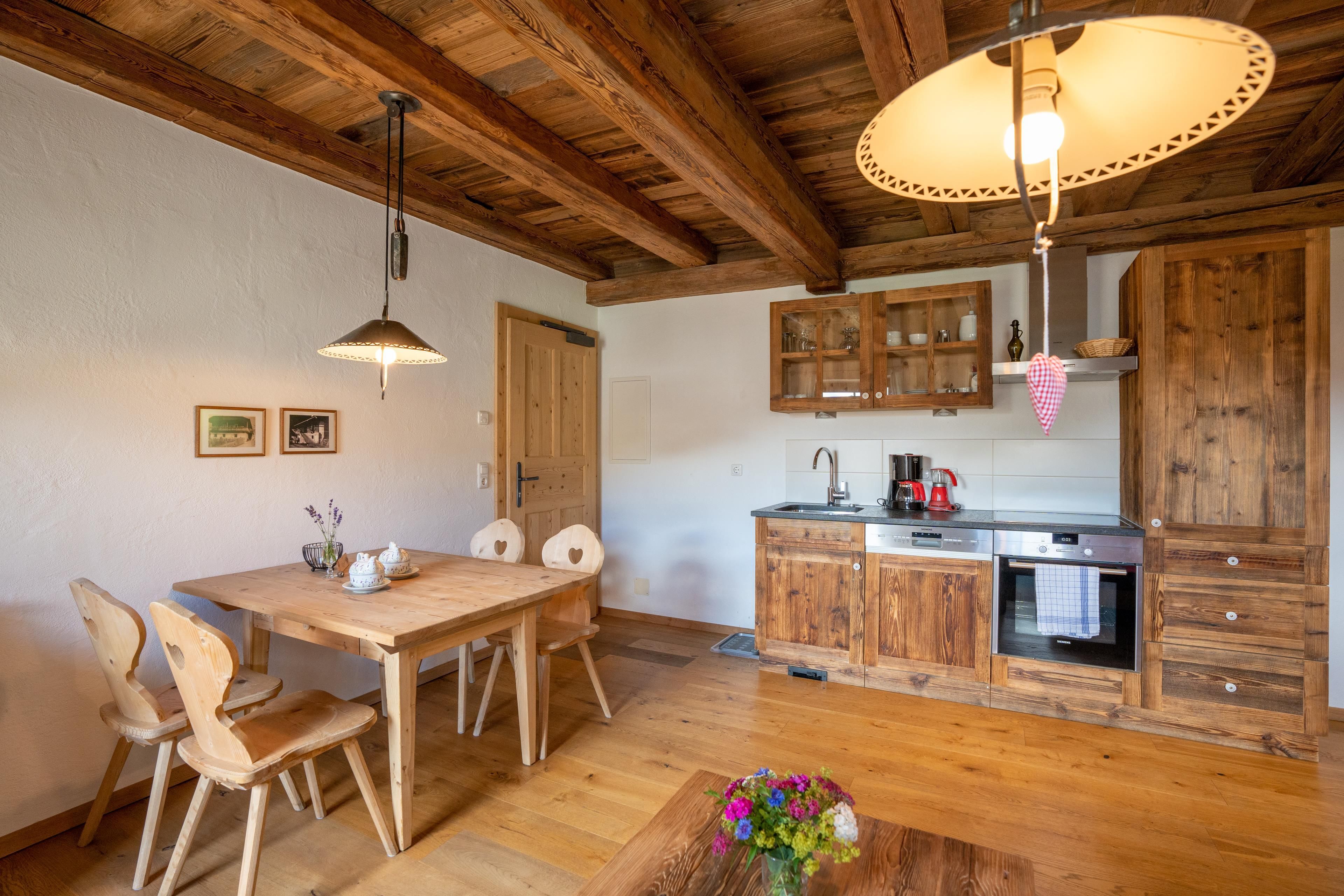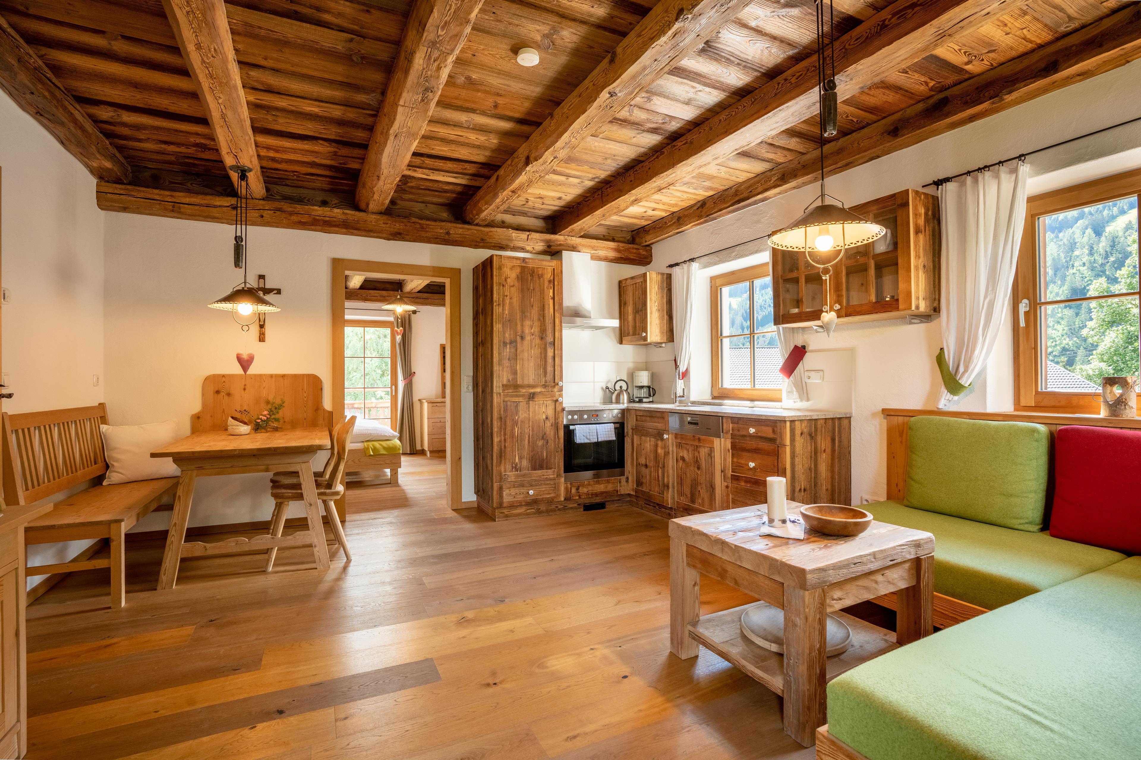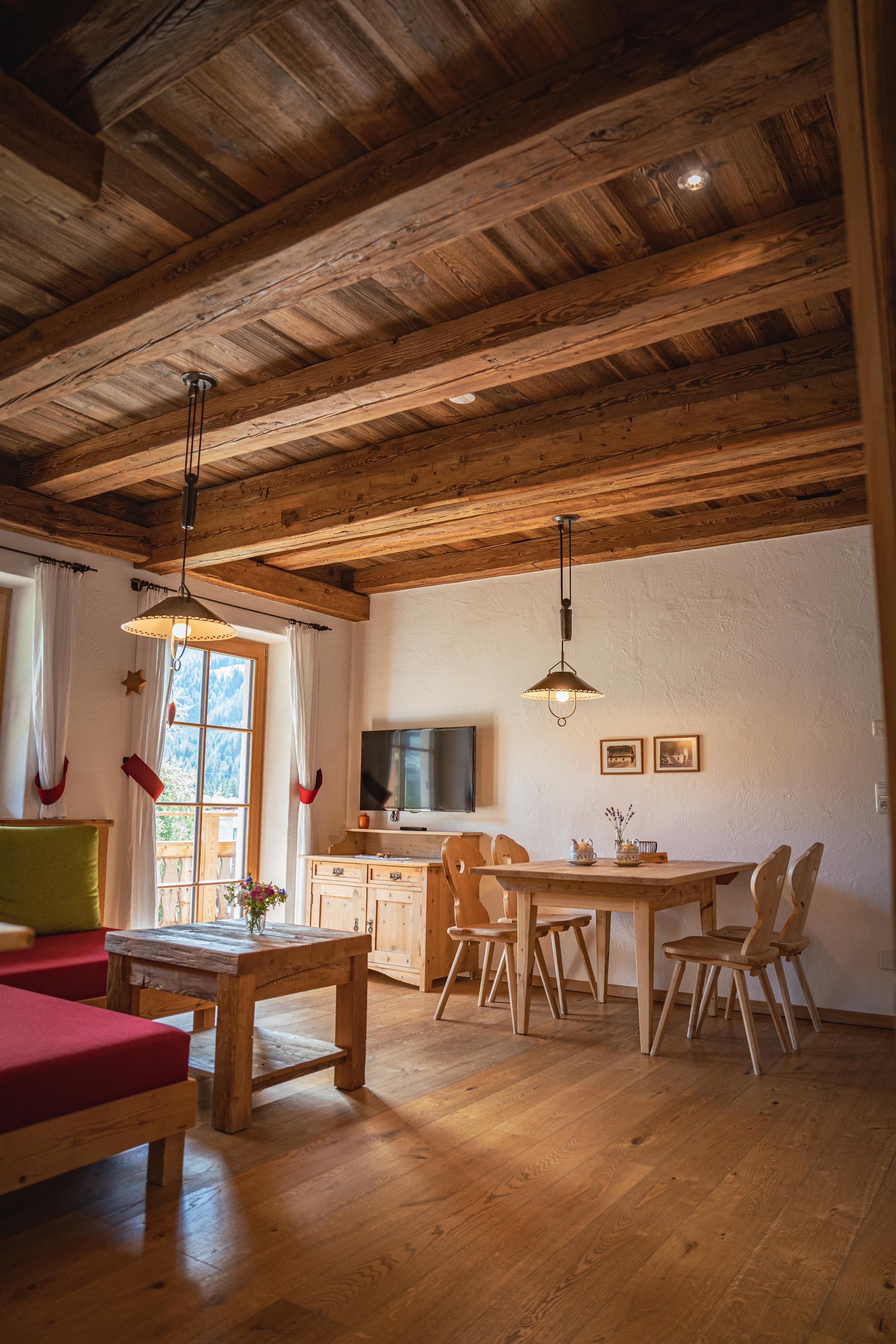 Apartment im Chalet Stil hochwertig mit natürlichen Materialien wie z.B. Holztramdecken, heimischem Holz, Naturstein & Loden ausgestattet.
