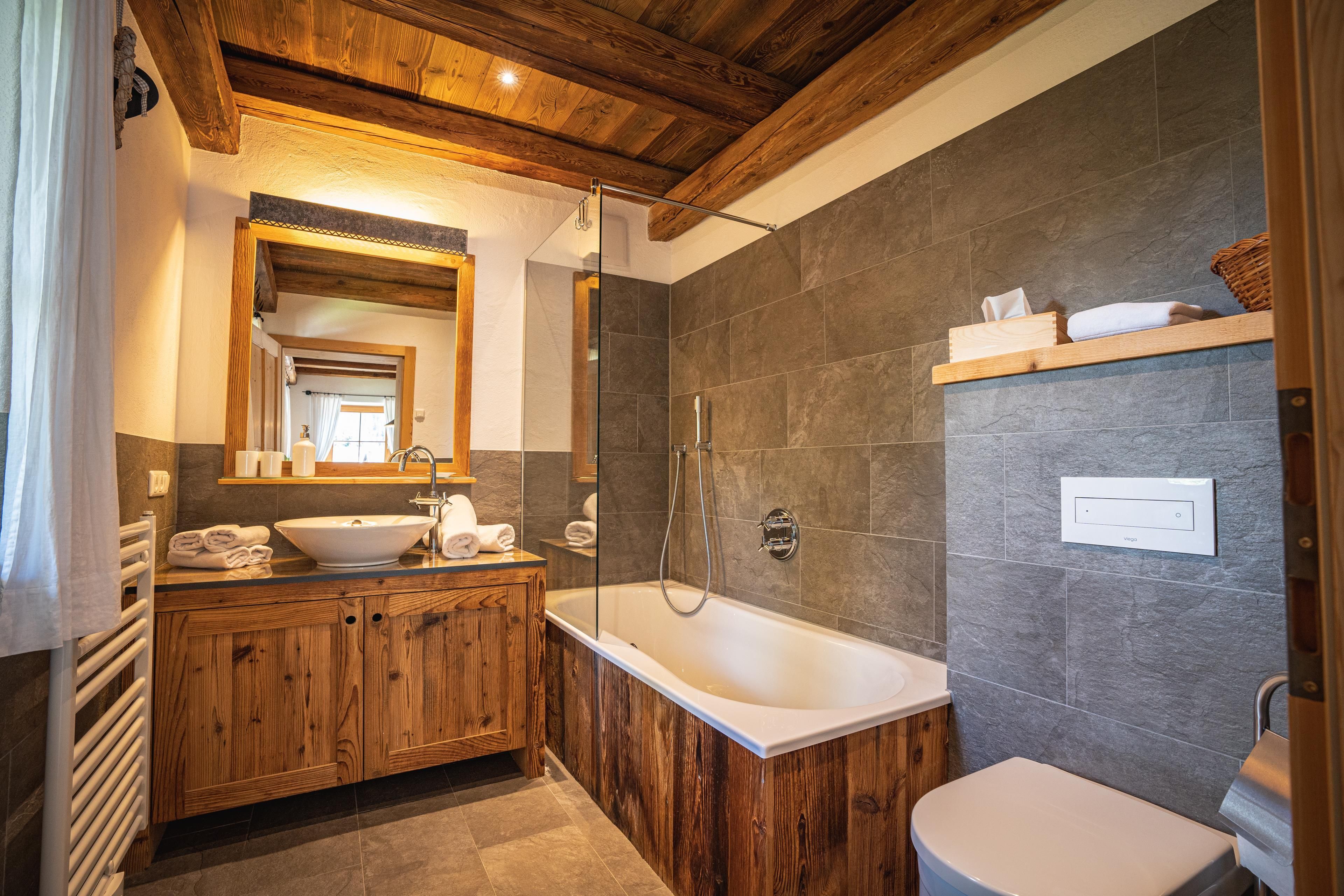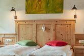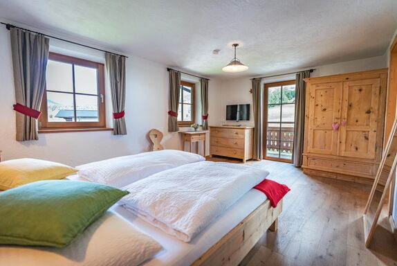 Doppelzimmer im Alpin-Chalet-Stil ist hochwertig mit natürlichen Materialien (Altholz, Lärchenholz, Naturstein, Loden), Doppelbett, Massivmöbel, Badezimmer (Dusche, WC, Handtuchtrockner), Flat TV (über 100 Programme), Wlan, Balkon ausgestattet.