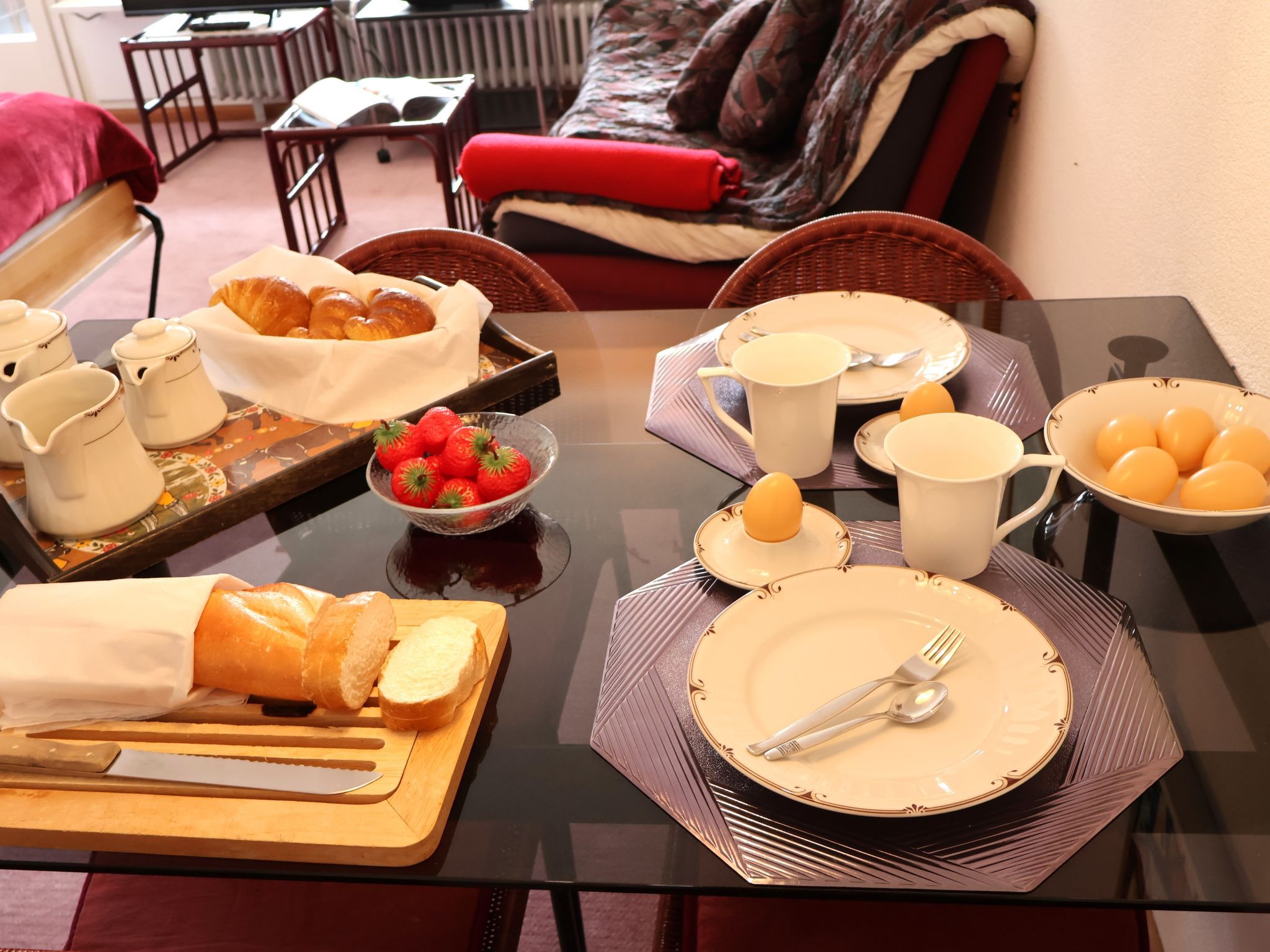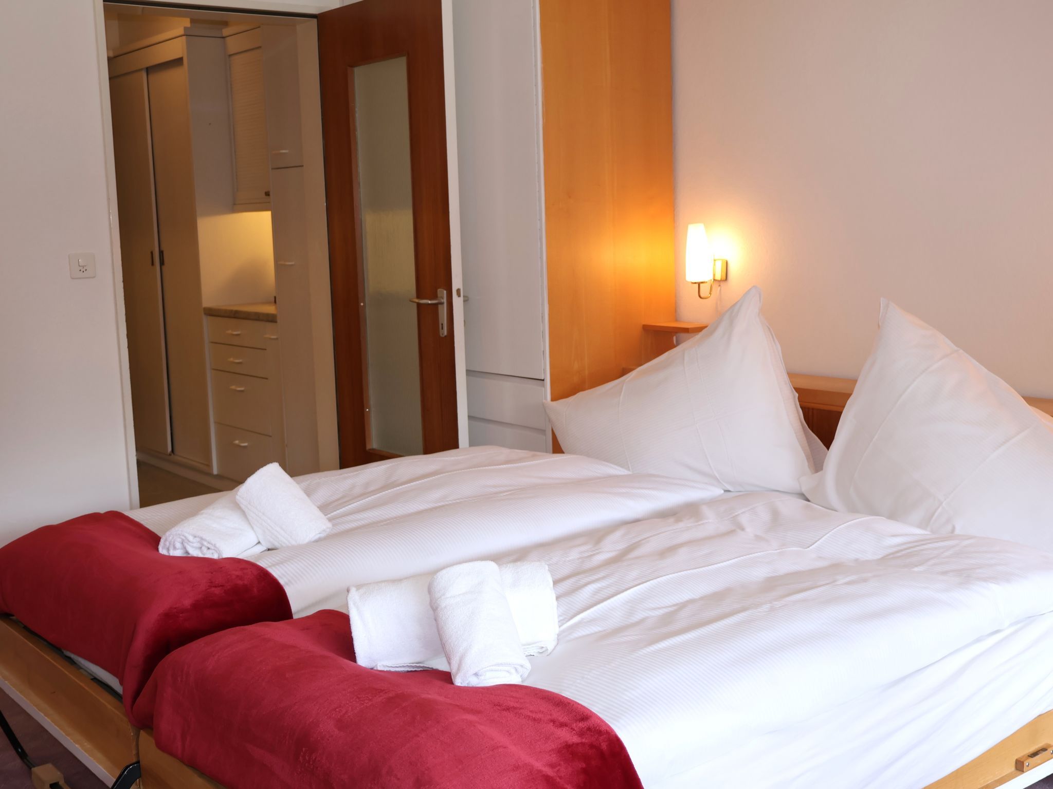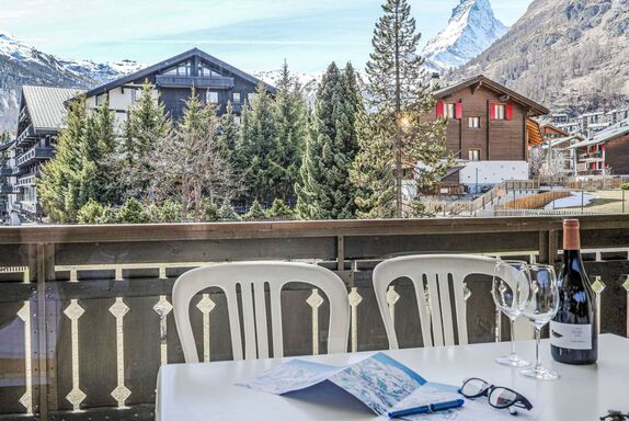 1-Zimmer-Wohnung 33 m2, Südlage. Hell, einfach und gemütlich eingerichtet: Wohn-/Schlafzimmer mit 2 Wandschrankbetten (90 cm, Länge 200 cm), Esstisch und Digital-TV. Ausgang zum Balkon, Richtung Süden. Küche (2 Kochplatten, Backofen, Geschirrspüler, Mikrowelle, Tiefkühler, elektrische Kaffeemaschine). Bad/WC. Heizung. Balkon, Südlage. Balkonmöbel. Schöne Sicht auf das Matterhorn. Bitte beachten: Nichtraucher-Unterkunft.