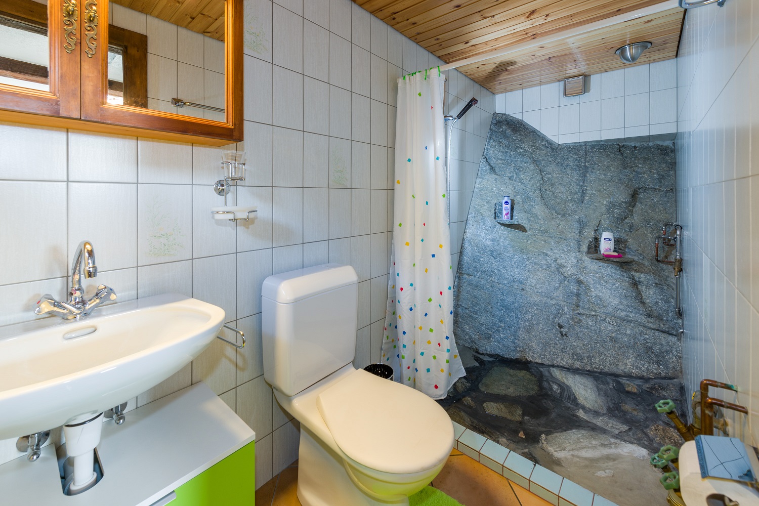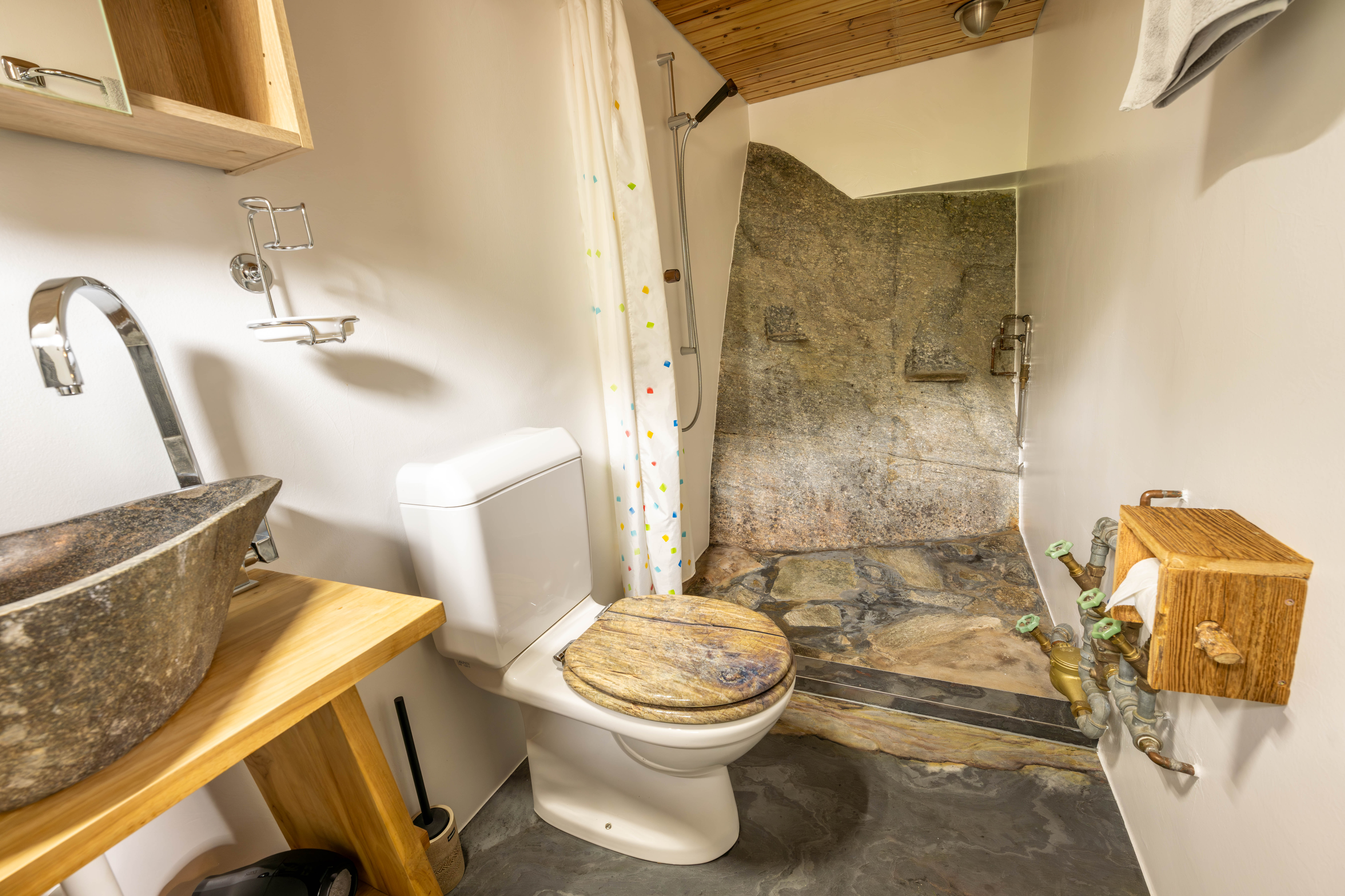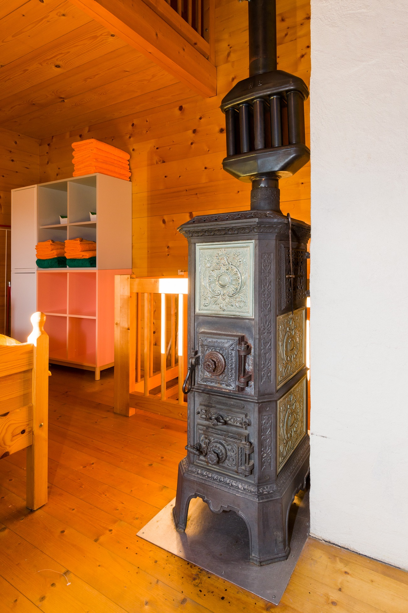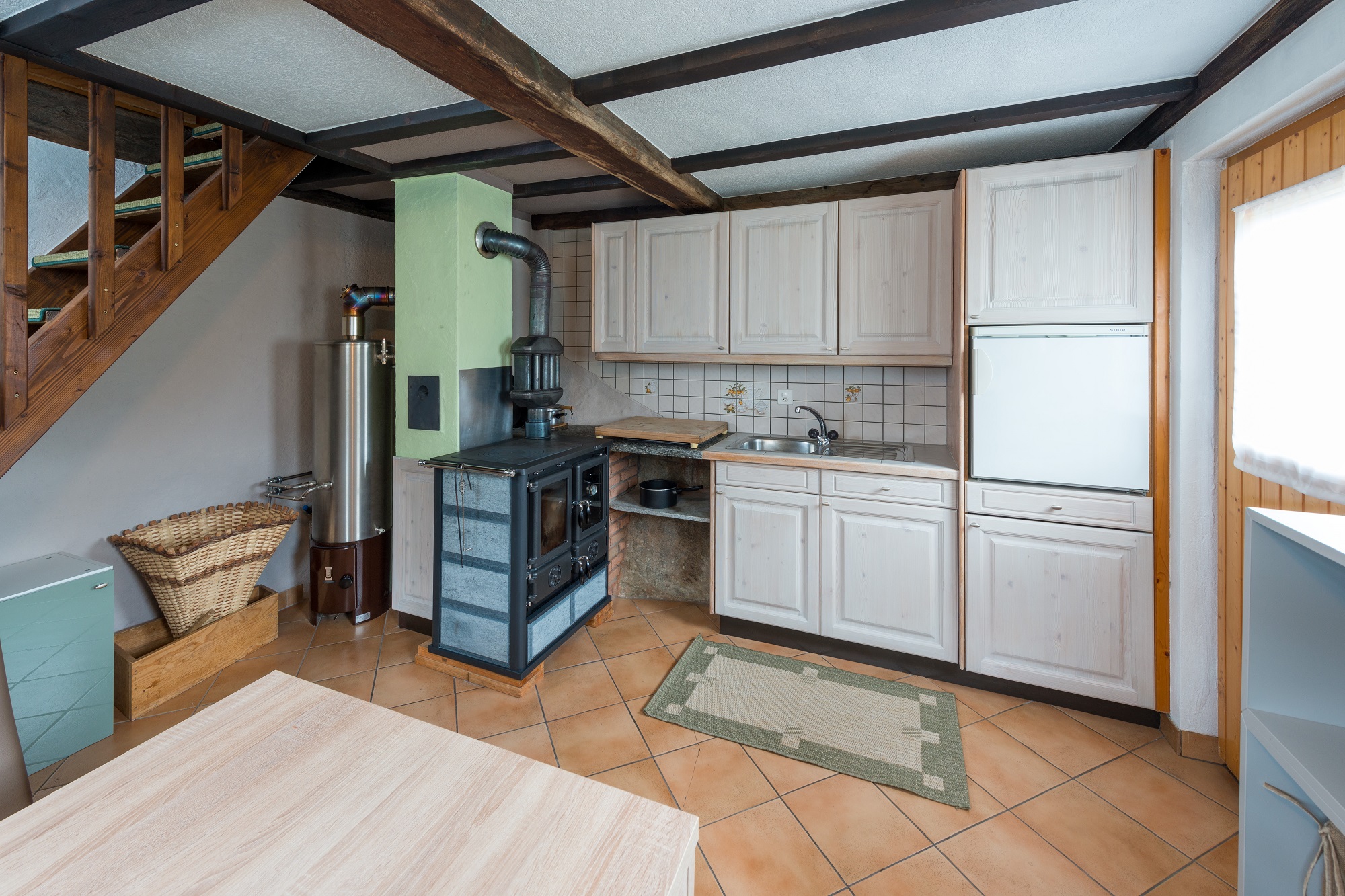 Im Erdgeschoss befindet sich die Küche mit Holzofen-Herd, Warmwasser-Holzofenboiler sowie die Dusche / WC.