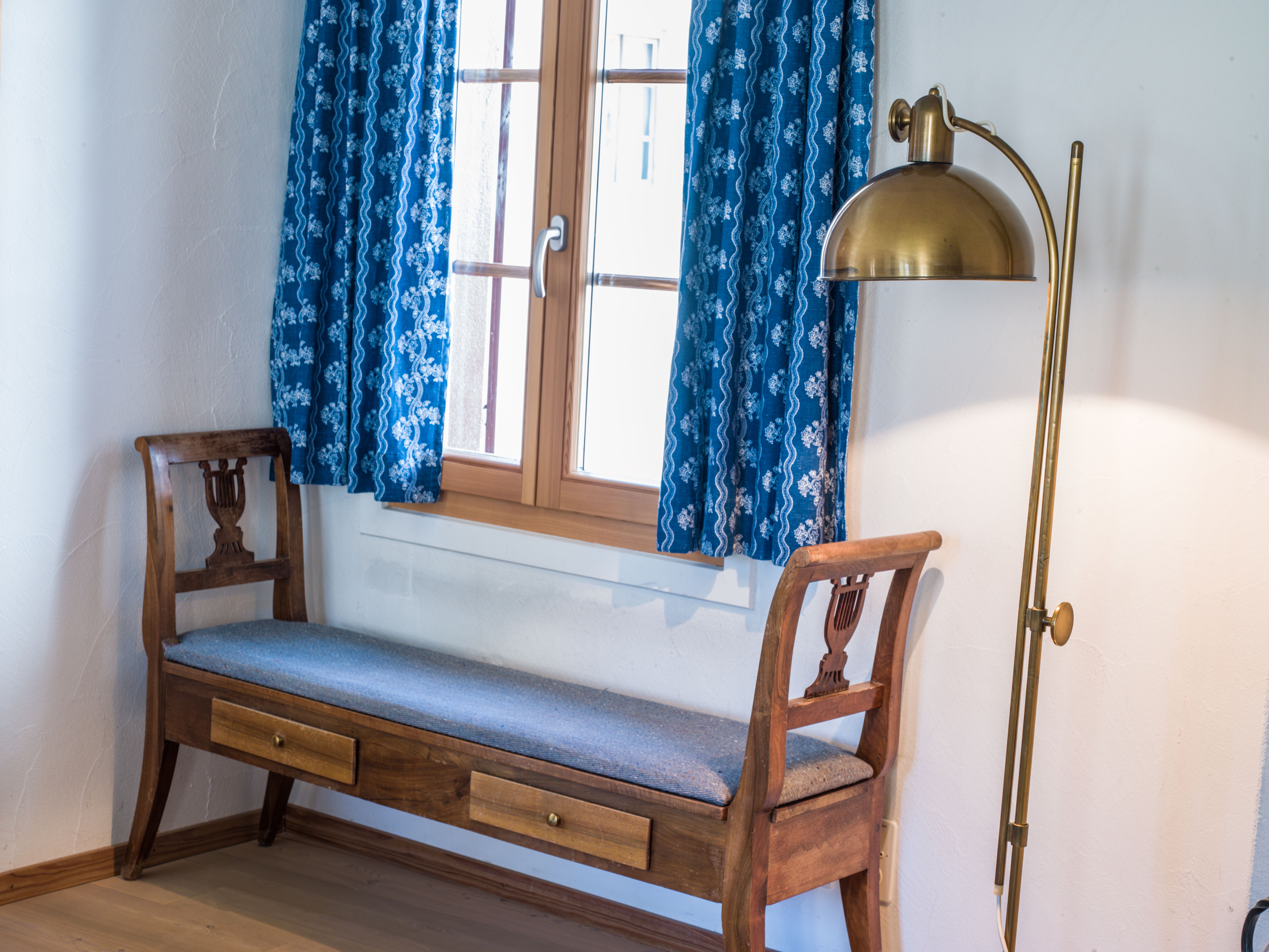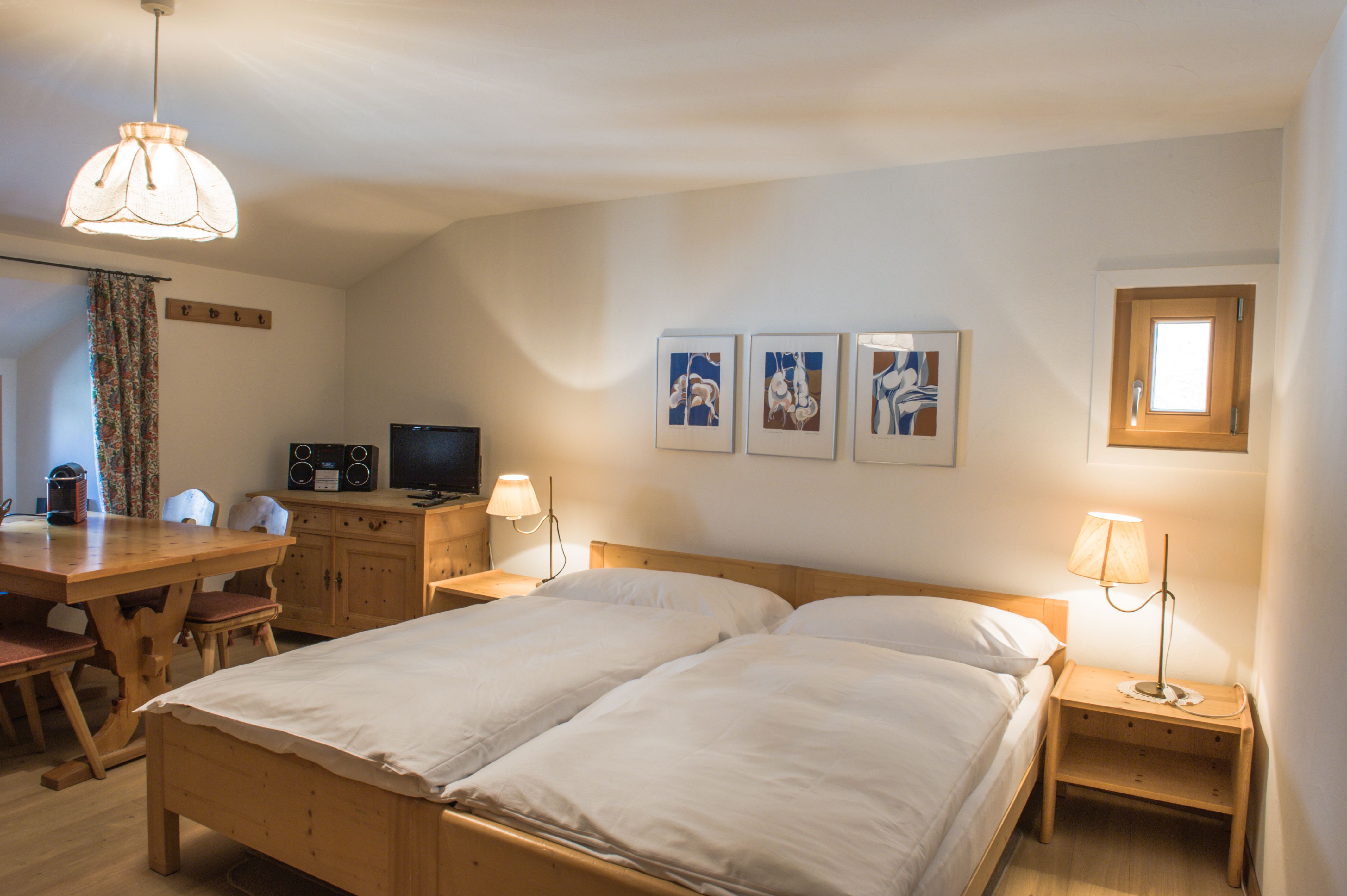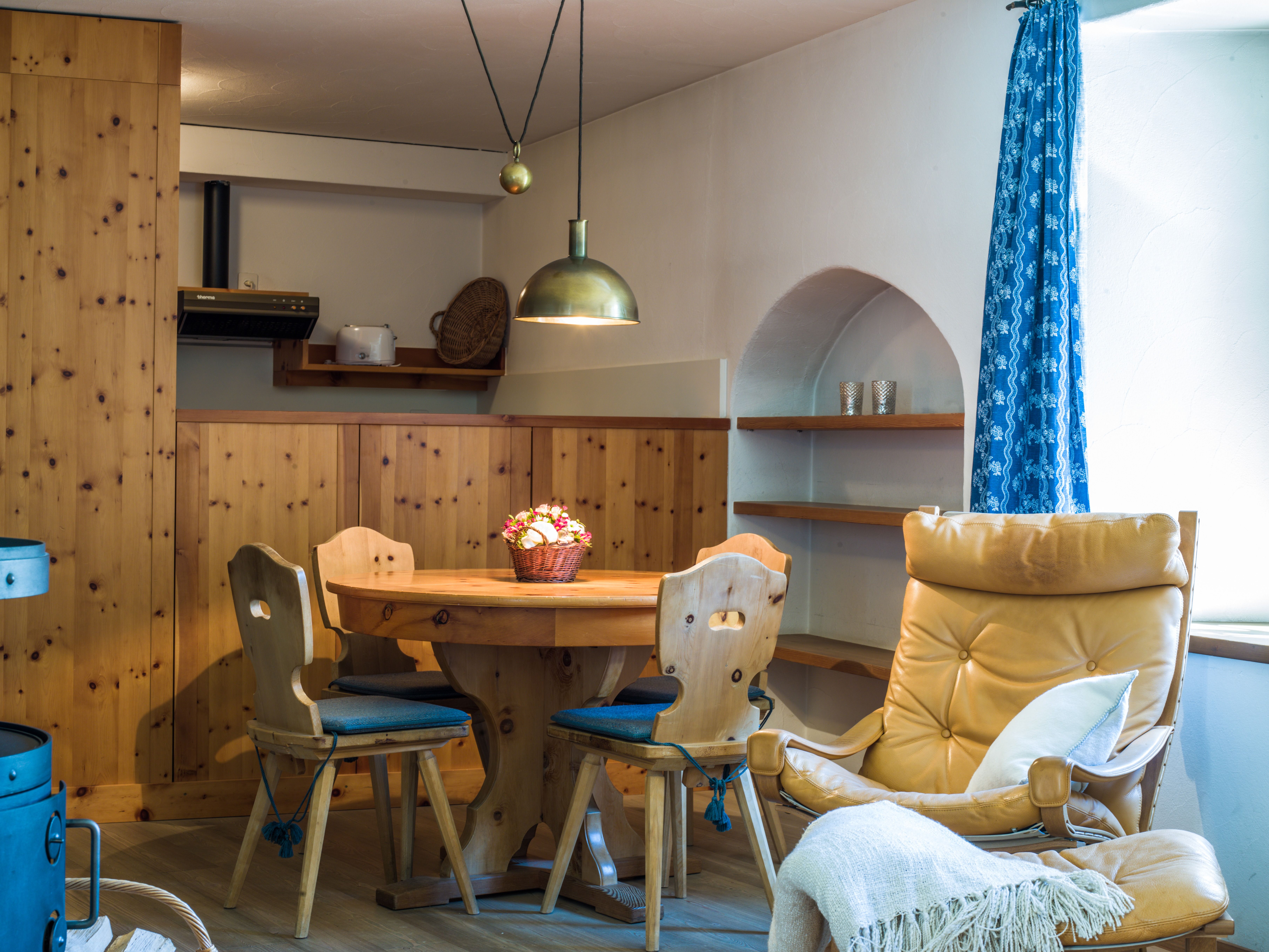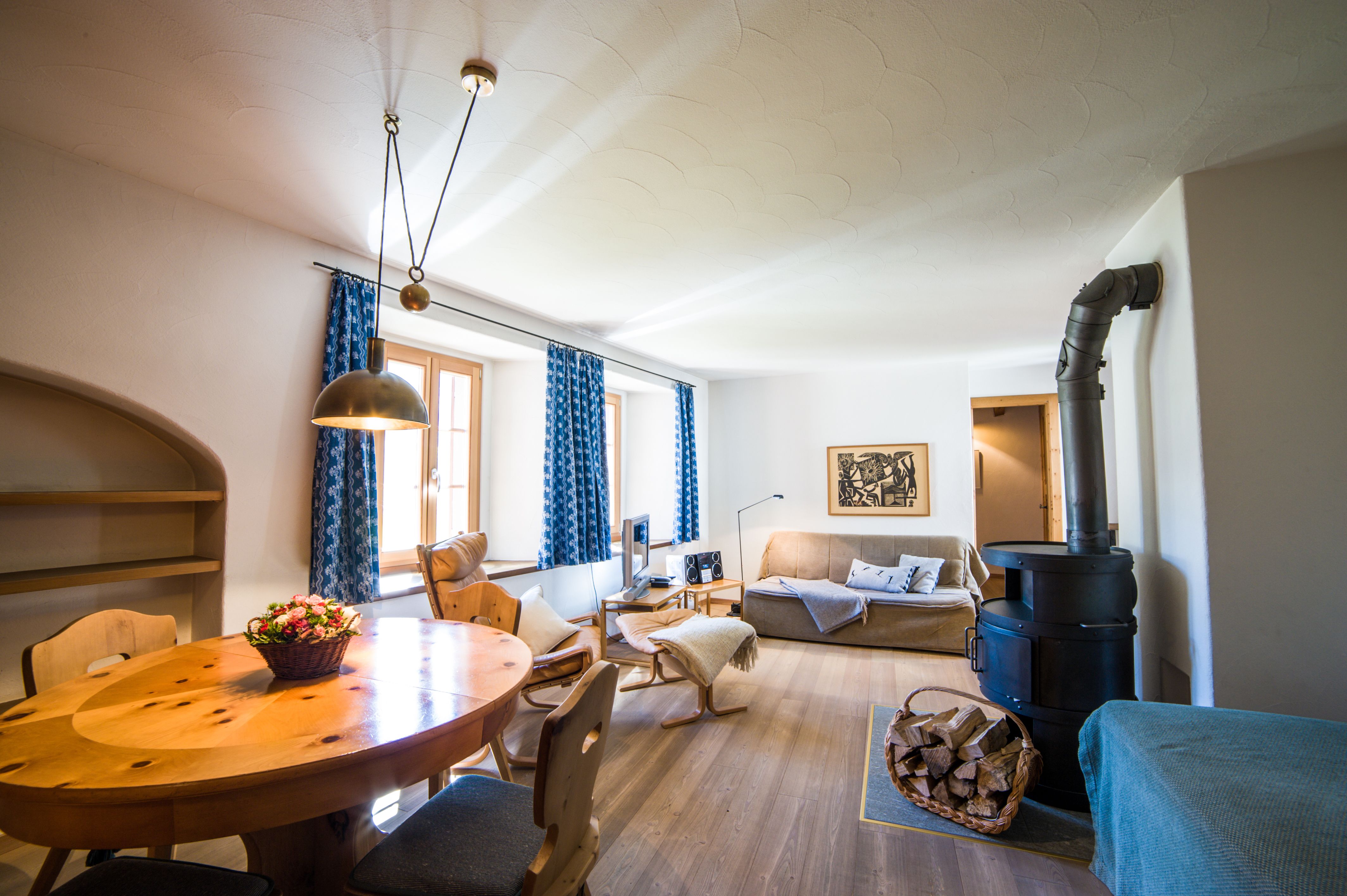 Die Innenausstattung spiegelt den traditionellen Engadinerstil wider, mit Parkettböden und Arvenholzmöbeln, ergänzt durch historische Fotografien. Für einen angenehmen Aufenthalt sorgen Annehmlichkeiten wie Bodenheizung, WLAN und ein Flachbild-TV. Des Weiteren steht Ihnen praktische Gemeinschaftseinrichtungen wie ein Skiraum sowie eine Waschmaschine und ein Tumbler zur Mitbenutzung zur Verfügung.
