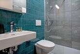 Das Badezimmer ist mit einer eleganten Dusche und einem WC ausgestattet. Die modernen Fliesen und die hochwertige Ausstattung verleihen dem Raum eine angenehme Atmosphäre.