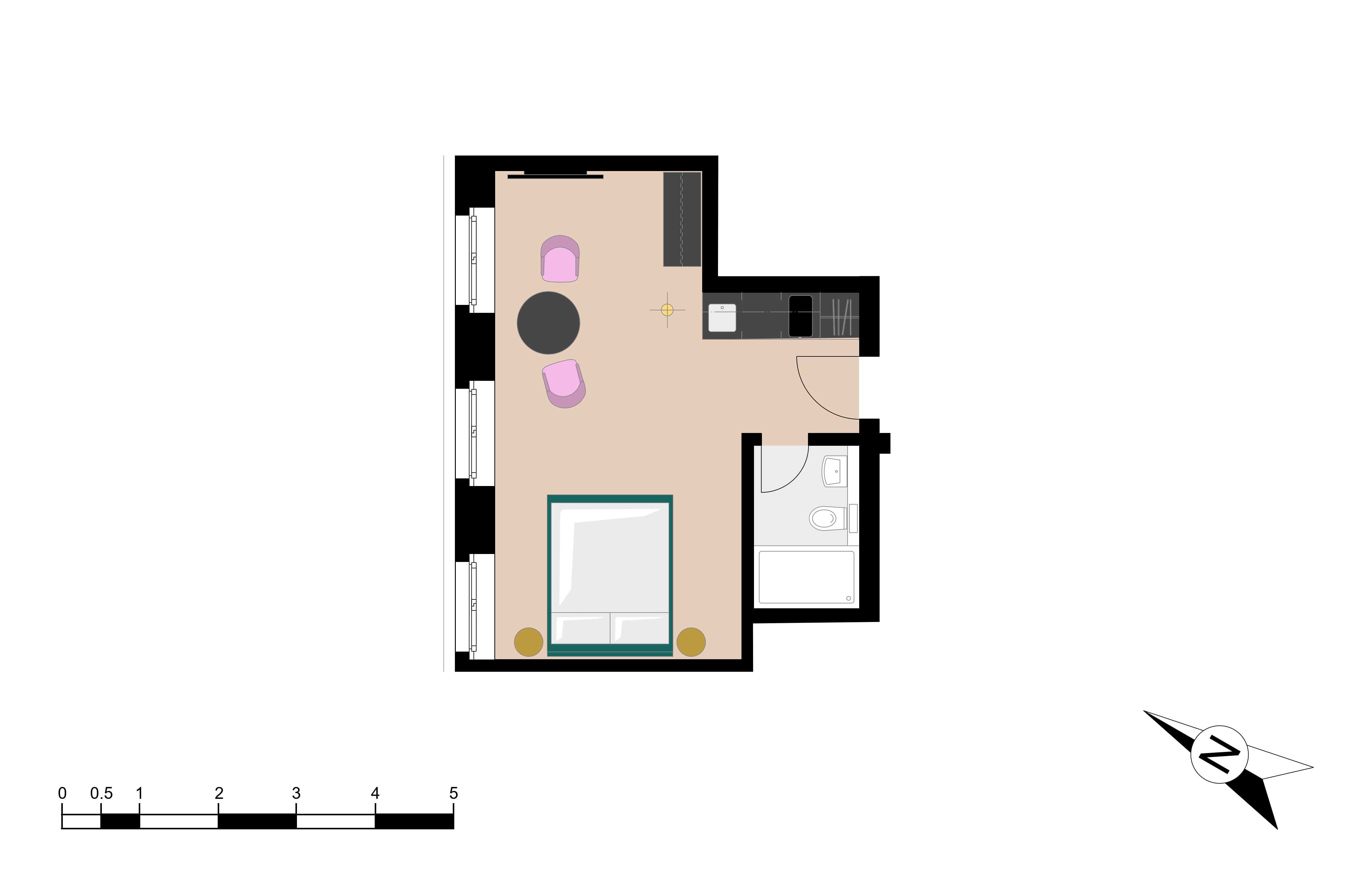 Das offene und grosszügig gestaltete Studio vereint den Schlafbereich mit dem Wohn- und Essbereich in einer harmonischen und gemütlichen Atmosphäre. Der Schlafbereich bietet ein bequemes Doppelbett (160cm x 200cm), das zu erholsamen Nächten einlädt. Der angrenzende Wohnbereich ist einladend und bietet Platz für eine kleine Sitzecke sowie einen Esstisch – ideal für entspannte Stunden. Die moderne Küche mit Kochmöglichkeit, Mikrowelle, Geschirrspüler und Nespresso Kaffeemaschine ist komplett ausgestattet und lässt keine Wünsche offen. Die Unterkunft bietet kostenlose, mitbenutzte Wäschemöglichkeiten.
