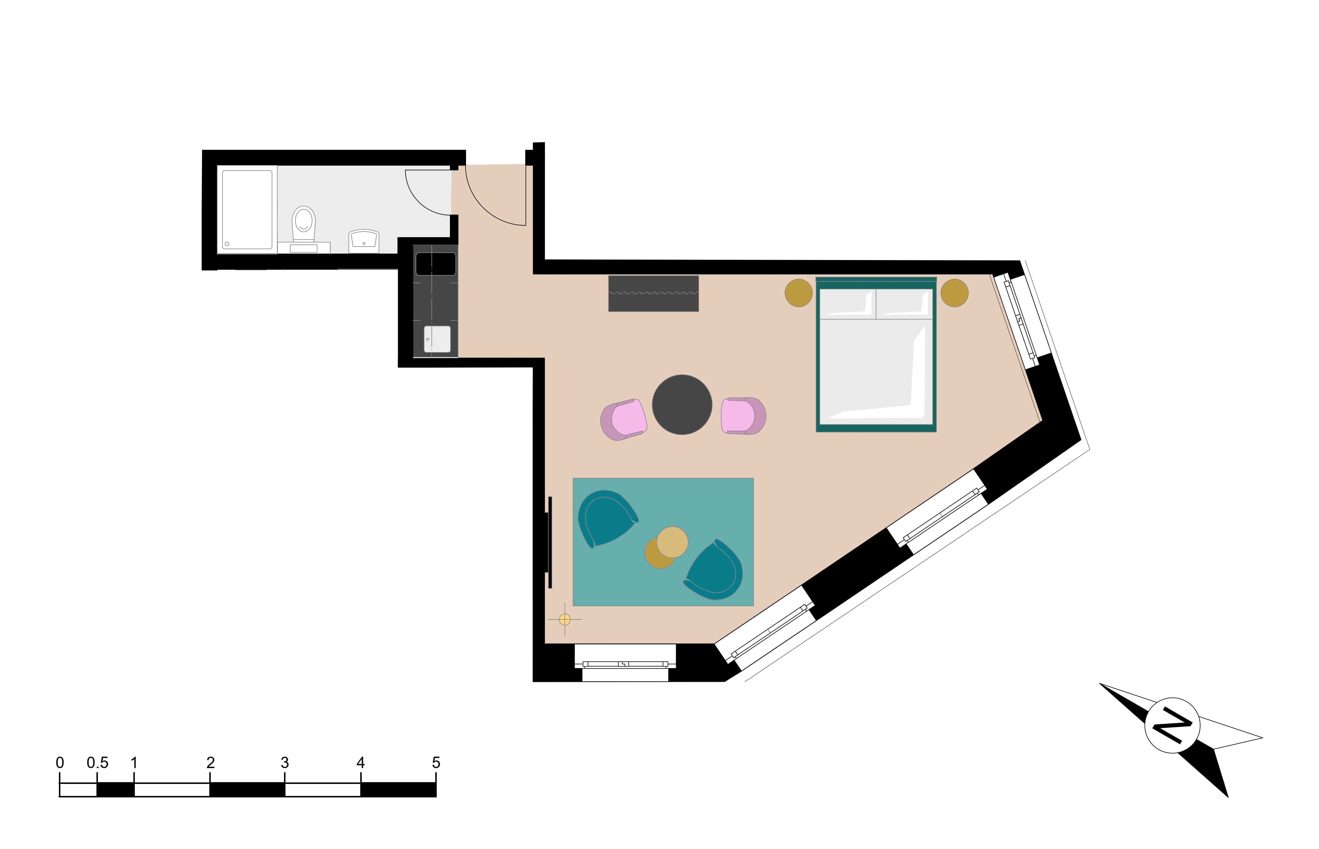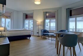 Das offene und grosszügig gestaltete Studio vereint den Schlafbereich mit dem Wohn- und Essbereich in einer harmonischen und gemütlichen Atmosphäre. Der Schlafbereich bietet ein bequemes Doppelbett (160cm x 200cm), das zu erholsamen Nächten einlädt. Der angrenzende Wohnbereich ist einladend und bietet Platz für eine kleine Sitzecke sowie einen Esstisch – ideal für entspannte Stunden. Die moderne Küche mit Kochmöglichkeit, Mikrowelle, Geschirrspüler und Nespresso Kaffeemaschine ist komplett ausgestattet und lässt keine Wünsche offen. Die Unterkunft bietet kostenlose, mitbenutzte Wäschemöglichkeiten.