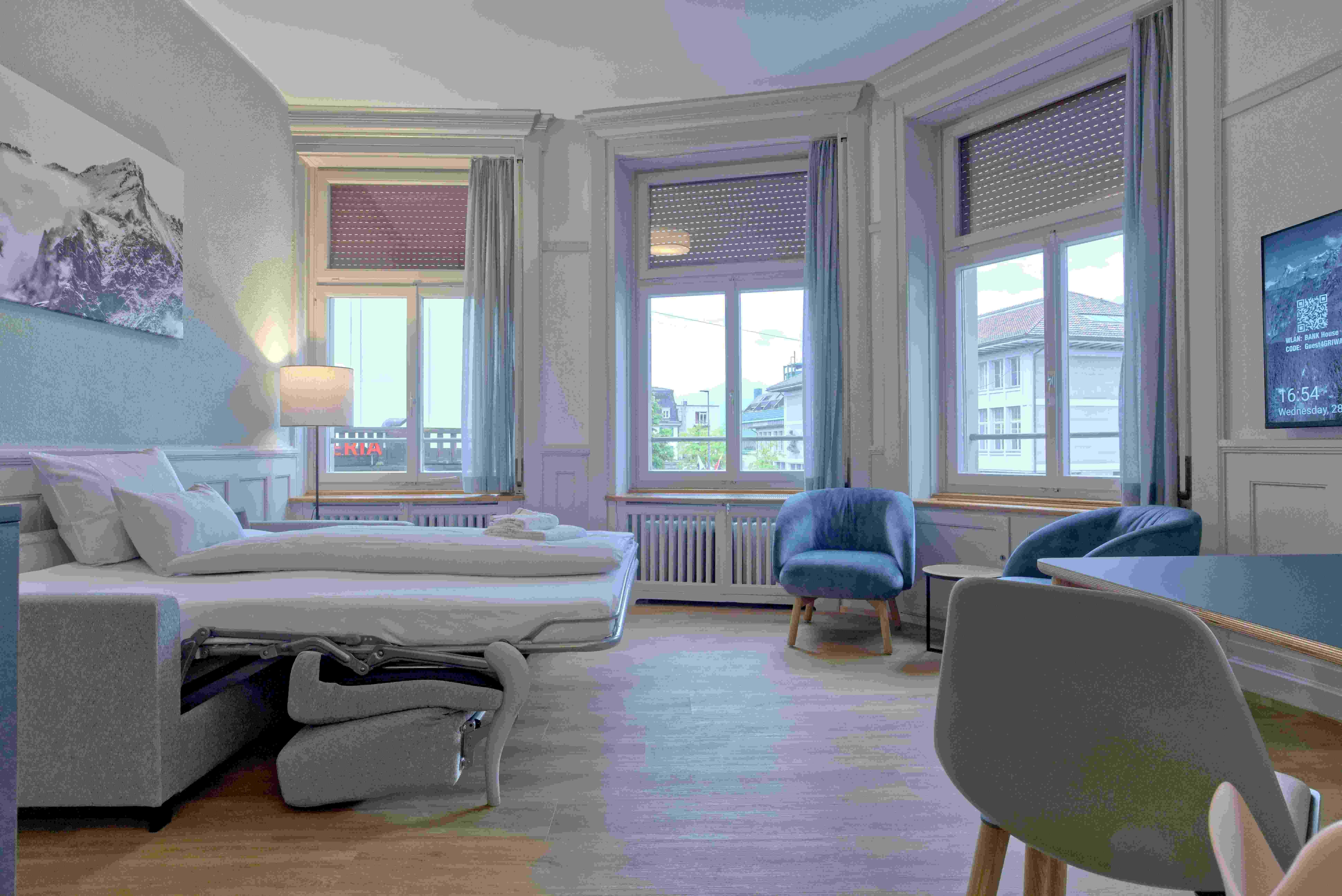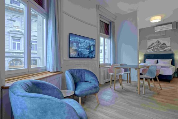 Das historische Gebäude, einst ein imposantes Bankhaus, befindet sich inmitten des pulsierenden Zentrums von Interlaken und ist nur wenige Schritte vom Bahnhof Interlaken West entfernt. Die Busstation ist nur wenige Meter vom Eingang entfernt.