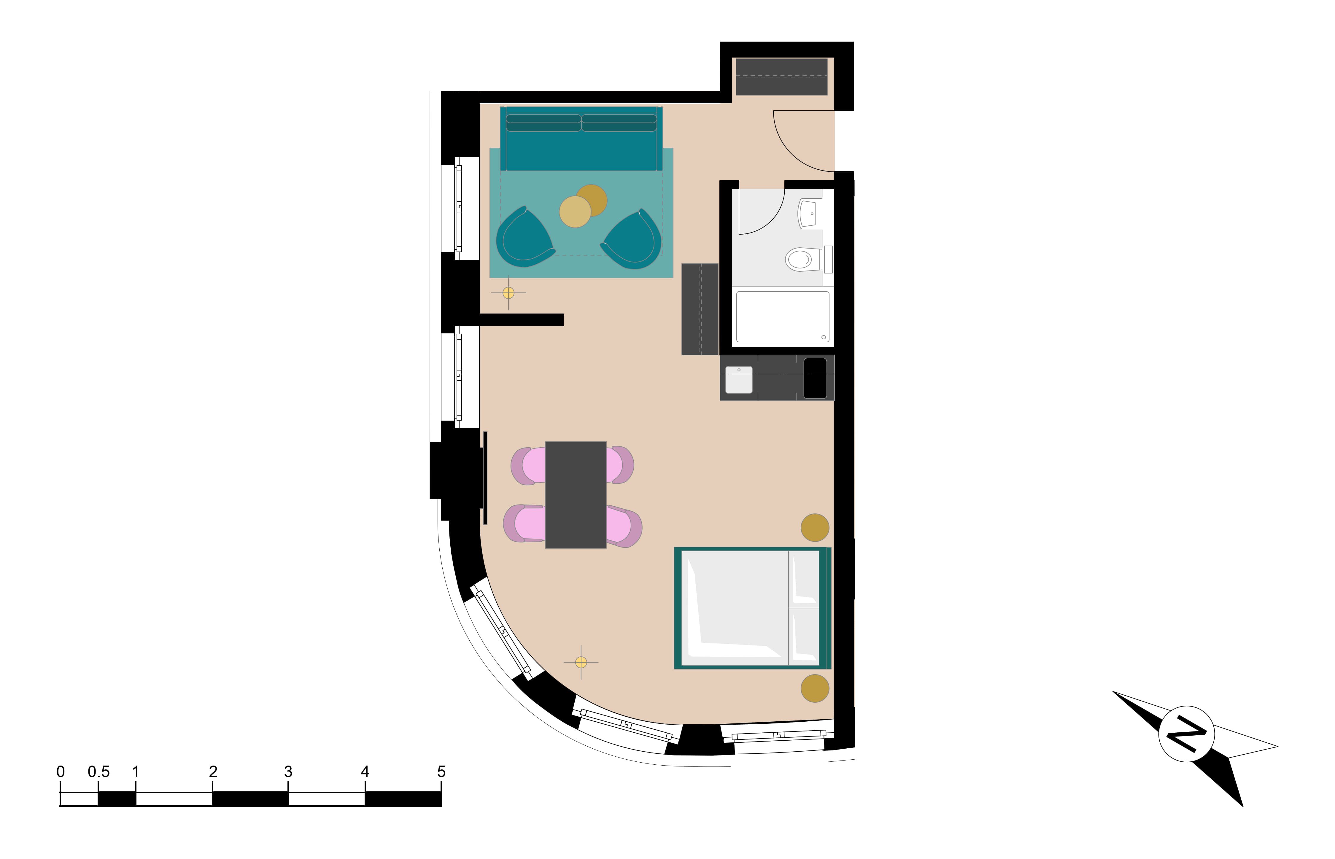 Das Apartment besticht durch seine Helligkeit, die durch die großen Fenster und die ausgewählte Farbgestaltung noch verstärkt wird. Die geschmackvolle und hochwertige Einrichtung sorgt für eine perfekte Mischung aus Funktionalität und Wohlfühlcharakter.