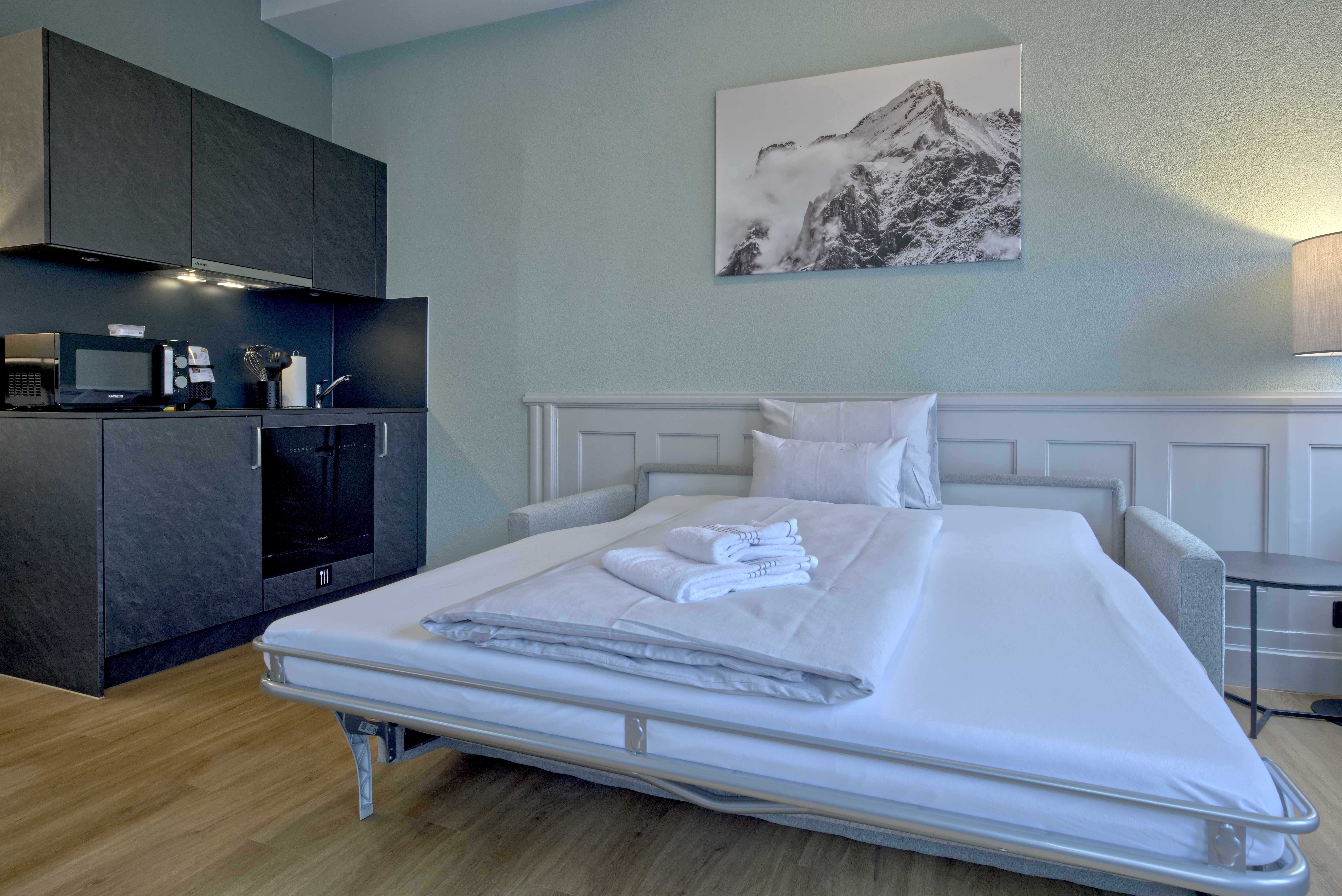 Der gemütliche Wohnbereich ist liebevoll eingerichtet und lädt zum Verweilen ein. Hier findest Du eine bequeme Sofaecke und einen kleinen Essbereich, an dem Du deine Mahlzeiten geniessen kannst. Das Schlafsofa bietet Platz für eine weitere Person, sodass auch kleinere Gruppen oder Familien einen angenehmen Aufenthalt haben. Die moderne Küche mit Kochmöglichkeit, Mikrowelle, Geschirrspüler und Nespresso Kaffeemaschine ist komplett ausgestattet mit allem, was Du für deinen Aufenthalt benötigst. Die Unterkunft bietet kostenlose, mitbenutzte Wäschemöglichkeiten.