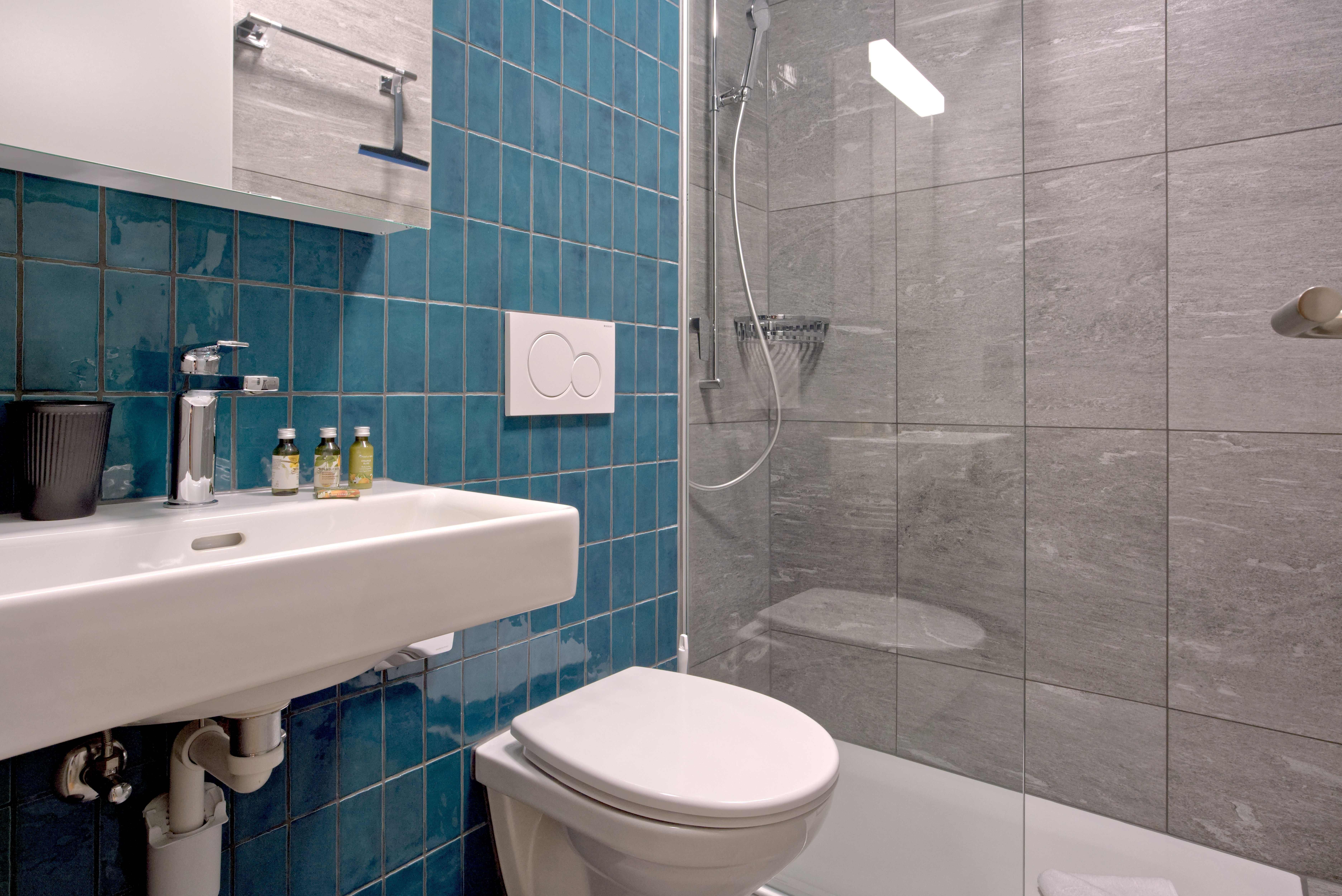 Das Badezimmer ist mit einer eleganten Dusche und einem WC ausgestattet. Die modernen Fliesen und die hochwertige Ausstattung verleihen dem Raum eine angenehme Atmosphäre.
