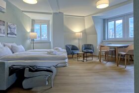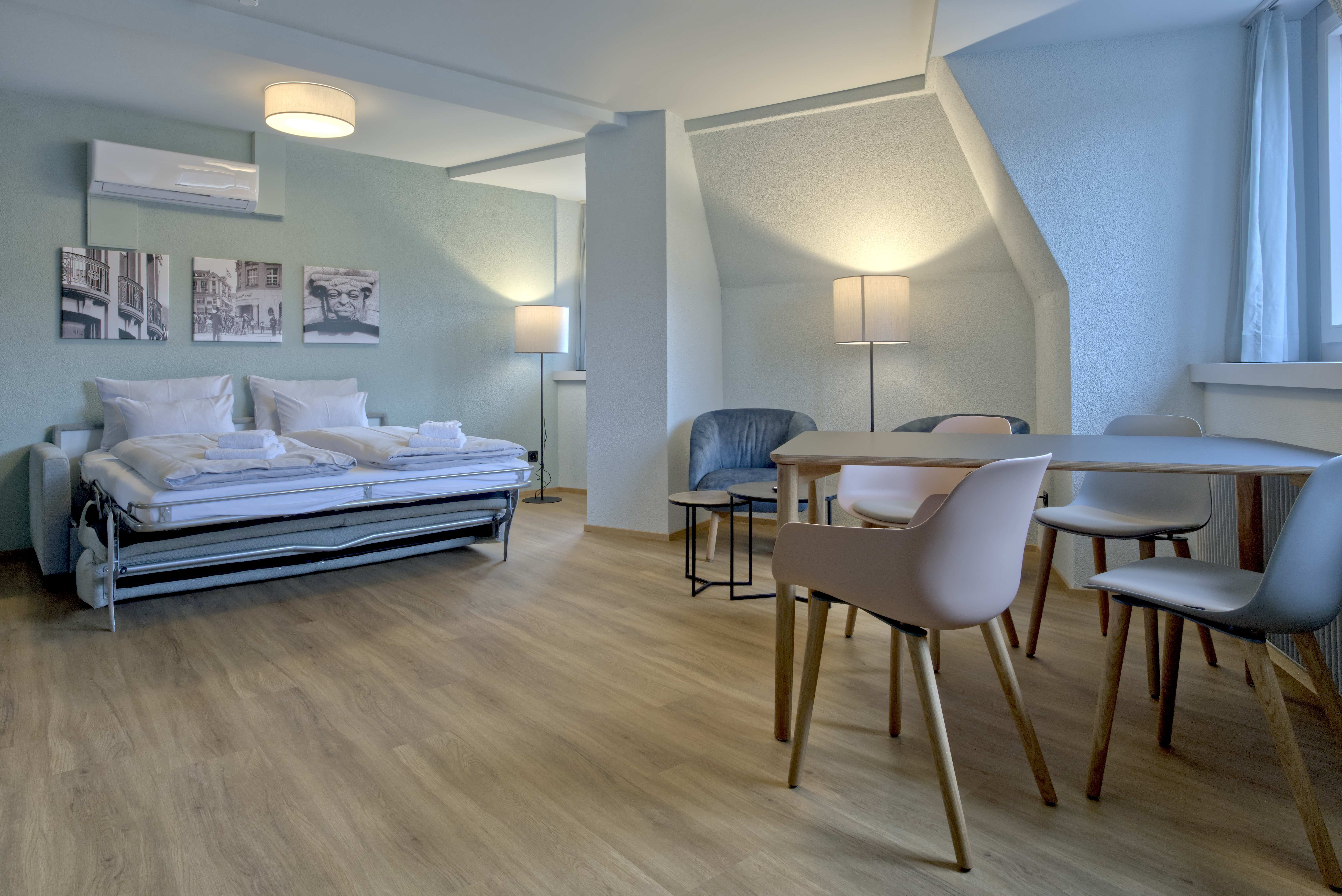 Der gemütliche Wohnbereich ist liebevoll eingerichtet und lädt zum Verweilen ein. Hier findest Du eine bequeme Sofaecke und einen kleinen Essbereich, an dem Du deine Mahlzeiten geniessen kannst. Das Schlafsofa bietet Platz für zwei weitere Personen, sodass auch kleinere Gruppen oder Familien einen angenehmen Aufenthalt haben. Die moderne Küche mit Kochmöglichkeit, Mikrowelle, Geschirrspüler und Nespresso Kaffeemaschine ist komplett ausgestattet mit allem, was Du für deinen Aufenthalt benötigst. Die Unterkunft bietet kostenlose, mitbenutzte Wäschemöglichkeiten.