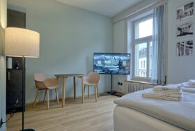 Das offene und grosszügig gestaltete Studio vereint den Schlafbereich mit dem Wohn- und Essbereich in einer harmonischen und gemütlichen Atmosphäre. Der Schlafbereich bietet ein bequemes Doppelbett (160cm x 200cm), das zu erholsamen Nächten einlädt. Der angrenzende Wohnbereich ist einladend und bietet Platz für eine kleine Sitzecke sowie einen Esstisch – ideal für entspannte Stunden. Die moderne Küche mit Kochmöglichkeit, Mikrowelle, Geschirrspüler und Nespresso Kaffeemaschine ist komplett ausgestattet und lässt keine Wünsche offen. Die Unterkunft bietet kostenlose, mitbenutzte Wäschemöglichkeiten.