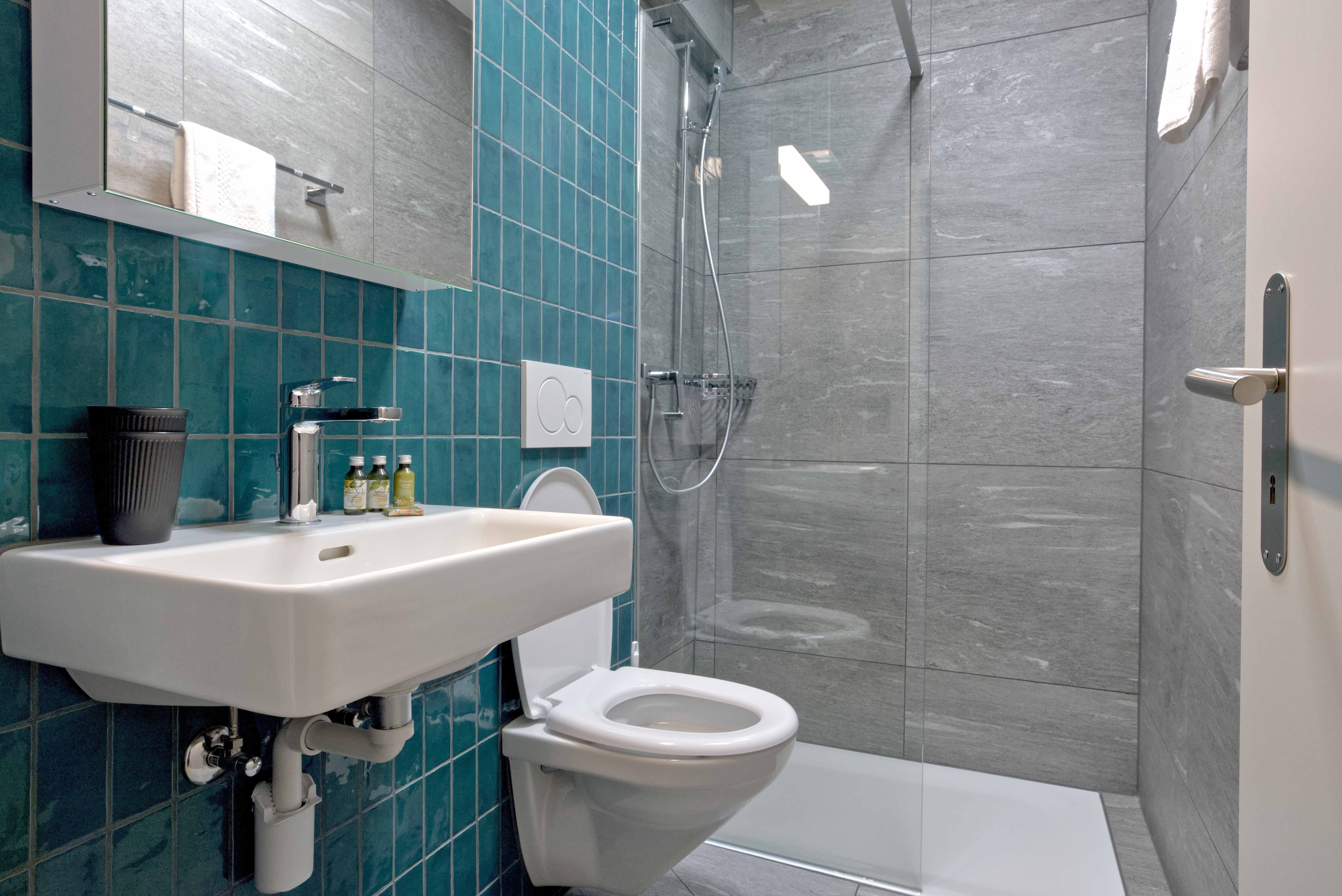 Das Badezimmer ist mit einer eleganten Dusche und einem WC ausgestattet. Die modernen Fliesen und die hochwertige Ausstattung verleihen dem Raum eine angenehme Atmosphäre.