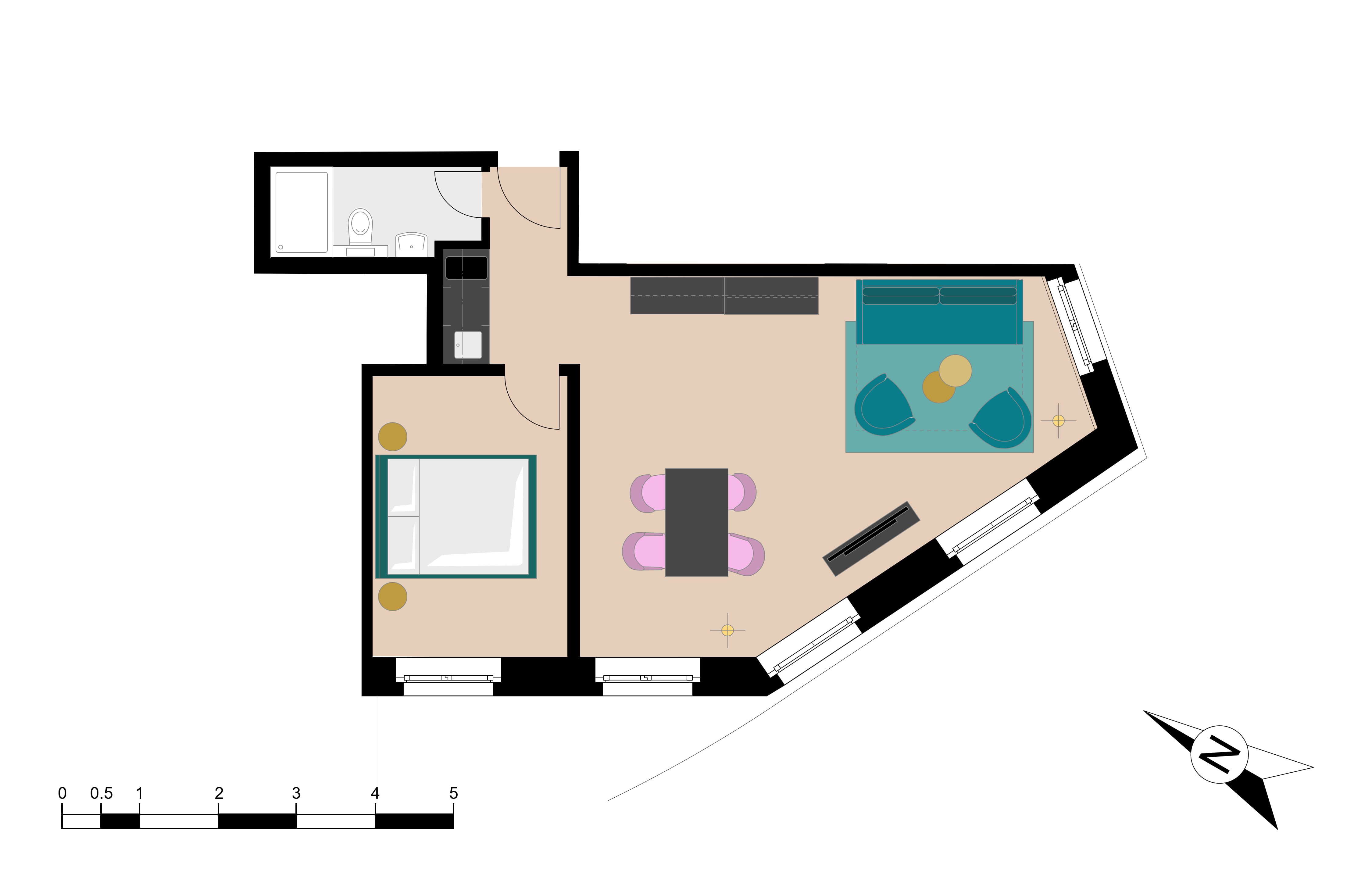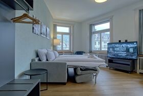 Das Apartment besticht durch seine Helligkeit, die durch die großen Fenster und die ausgewählte Farbgestaltung noch verstärkt wird. Die geschmackvolle und hochwertige Einrichtung sorgt für eine perfekte Mischung aus Funktionalität und Wohlfühlcharakter.