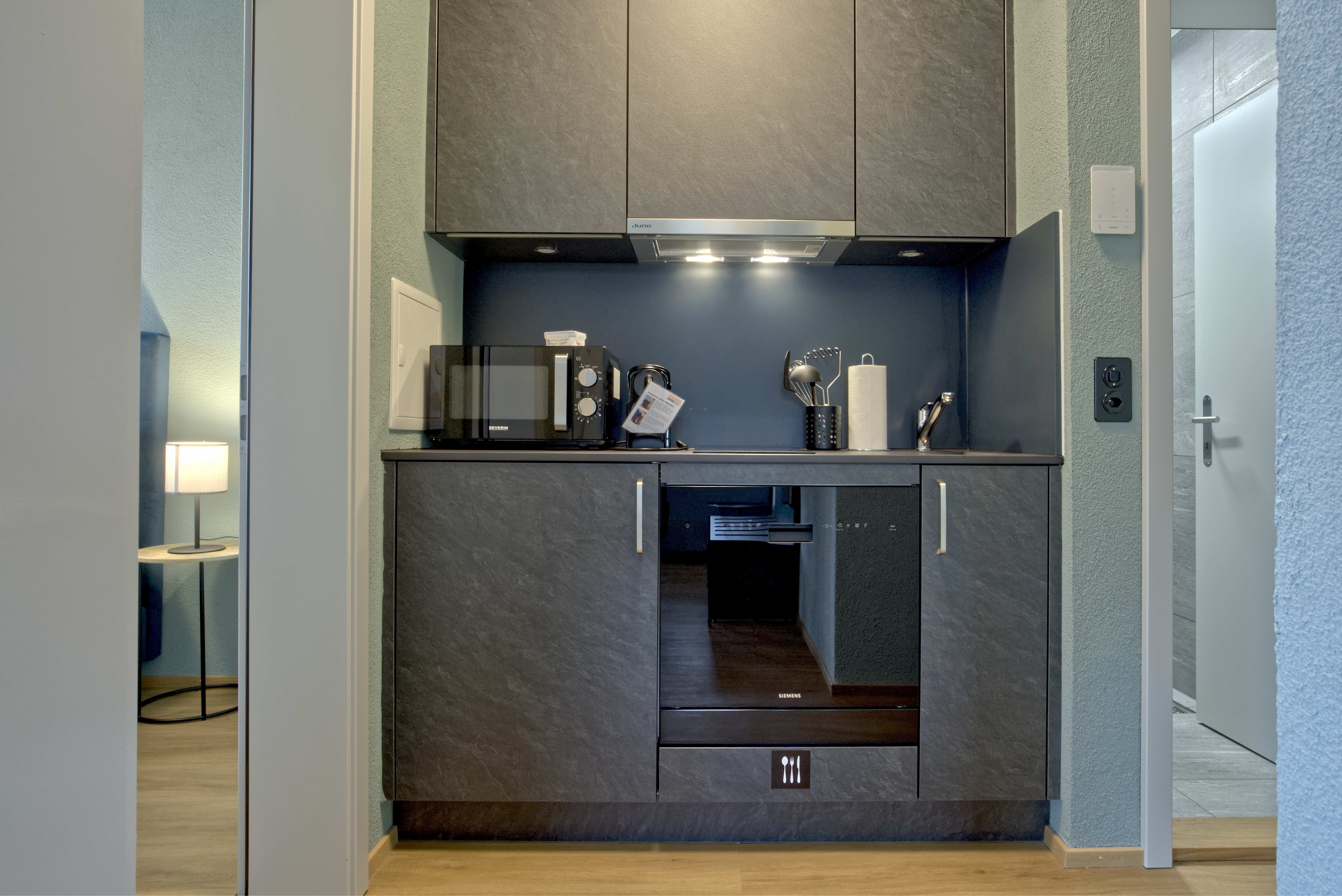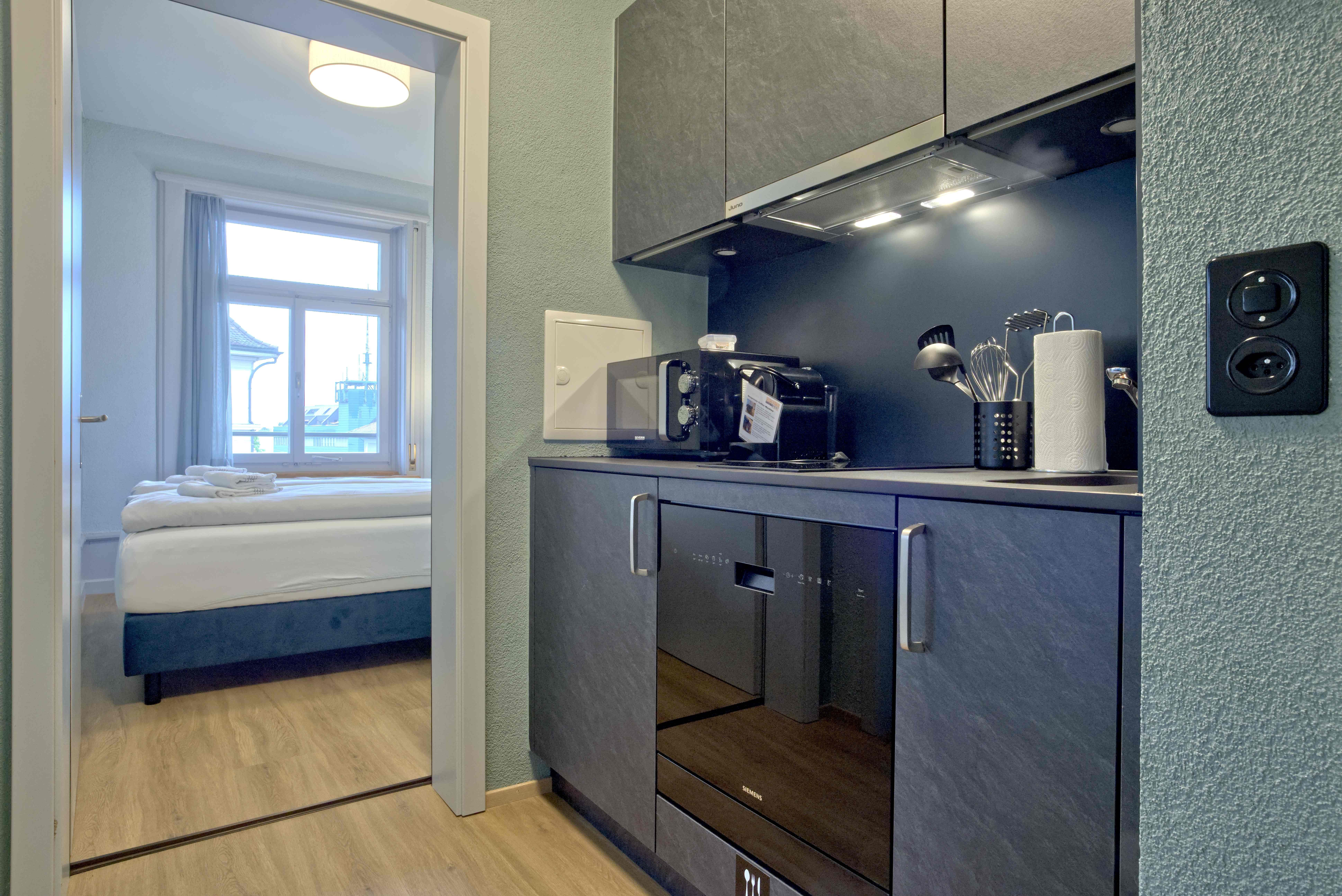 Der gemütliche Wohnbereich ist liebevoll eingerichtet und lädt zum Verweilen ein. Hier findest Du eine bequeme Sofaecke und einen kleinen Essbereich, an dem Du deine Mahlzeiten geniessen kannst. Das Schlafsofa bietet Platz für zwei weitere Personen, sodass auch kleinere Gruppen oder Familien einen angenehmen Aufenthalt haben. Die moderne Küche mit Kochmöglichkeit, Mikrowelle, Geschirrspüler und Nespresso Kaffeemaschine ist komplett ausgestattet mit allem, was Du für deinen Aufenthalt benötigst. Die Unterkunft bietet kostenlose, mitbenutzte Wäschemöglichkeiten.