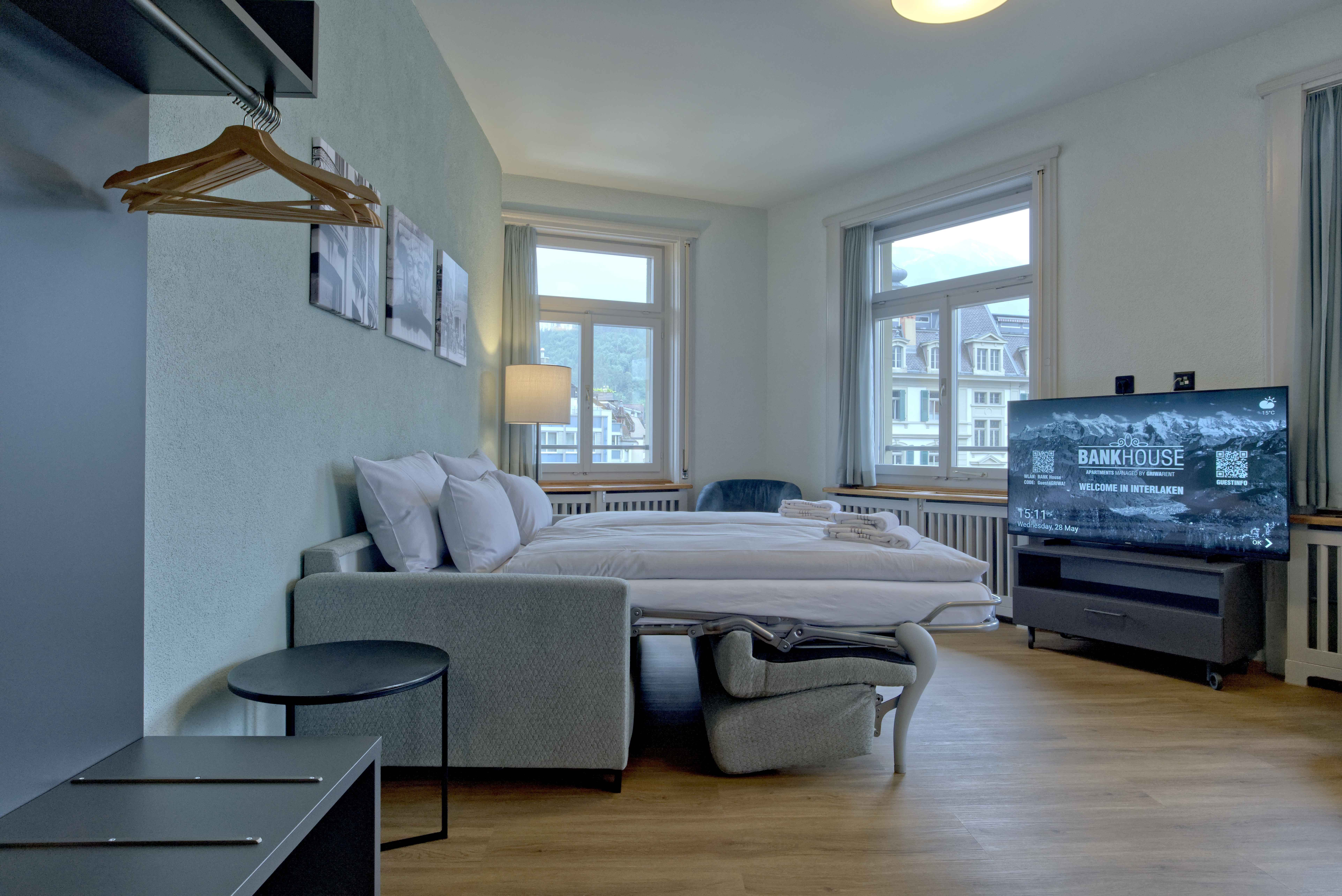 Das historische Gebäude, einst ein imposantes Bankhaus, befindet sich inmitten des pulsierenden Zentrums von Interlaken und ist nur wenige Schritte vom Bahnhof Interlaken West entfernt. Die Busstation ist nur wenige Meter vom Eingang entfernt.