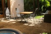 Der Außenbereich dieser Ferienwohnung ist ein wahres Highlight. Der private Garten zur alleinigen Nutzung lädt mit einer Palme sowie komfortablen Liegestühlen zum Entspannen ein. Ein Tisch und Stühle bieten die perfekte Kulisse für Mahlzeiten im Freien oder entspannte Stunden unter freiem Himmel. Für Ihren vierbeinigen Freund steht zudem genügend Platz zur Verfügung, um sich wohlzufühlen.