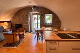 Die Innenausstattung der Wohnung vermittelt sofort ein willkommenes Gefühl von Zuhause und Komfort. Im ehemaligen Weinkeller gelegen, lädt das gemütliche Wohnzimmer mit seiner gewölbten Decke zum Verweilen ein, direkt verbunden mit einer modern ausgestatteten Küche, die neben einem Geschirrspüler auch einen Tisch für 6 Personen umfasst. Zum Entspannen und Erholen stehen ein Schlafzimmer mit einem 180 cm breiten Doppelbett sowie ein weiteres Schlafzimmer mit zwei 160 cm breiten Doppelbetten bereit. Komplettiert wird das Innenangebot durch ein Badezimmer, das sowohl über eine Badewanne als auch eine Dusche und einen Waschtisch verfügt.
