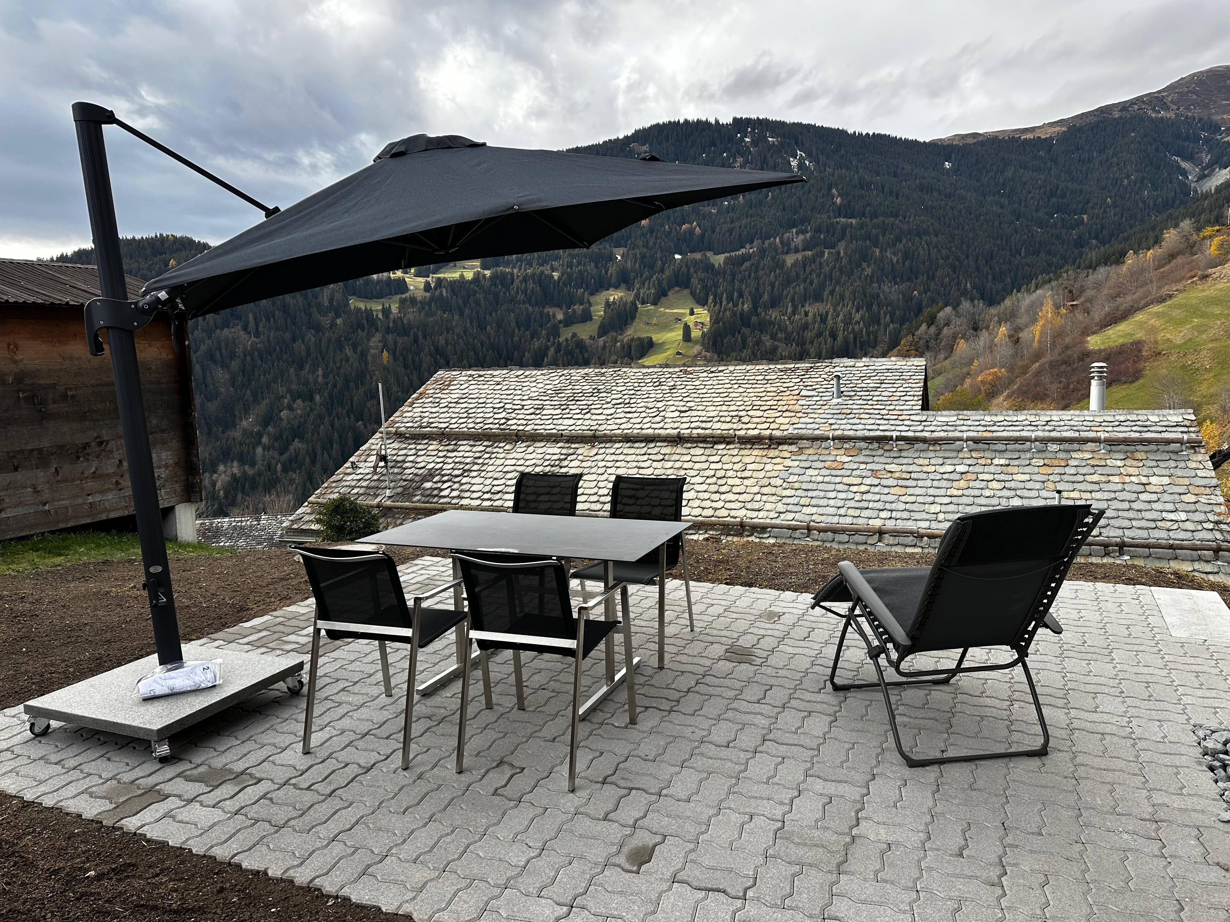 Von der Terrasse aus geniessen Sie eine herrliche Aussicht auf die Bergwelt - diese steht Ihnen zusammen mit den Gästen der Wohnung Casa Ladina 4 für Barbeques zur Verfügung.