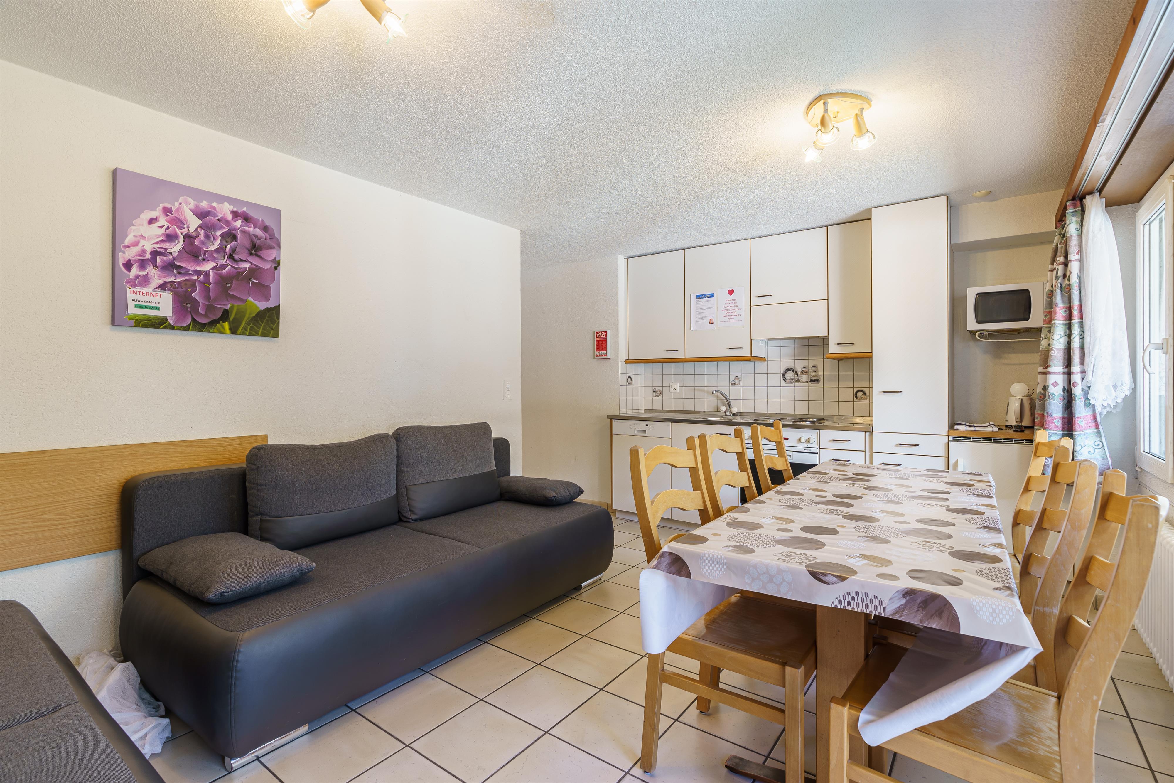 Die 70 m² große Ferienwohnung im Haus Alfa bietet Platz für bis zu 8 Personen und ist ideal für Familien oder Gruppen, die die atemberaubende Natur von Saas-Fee genießen möchten.