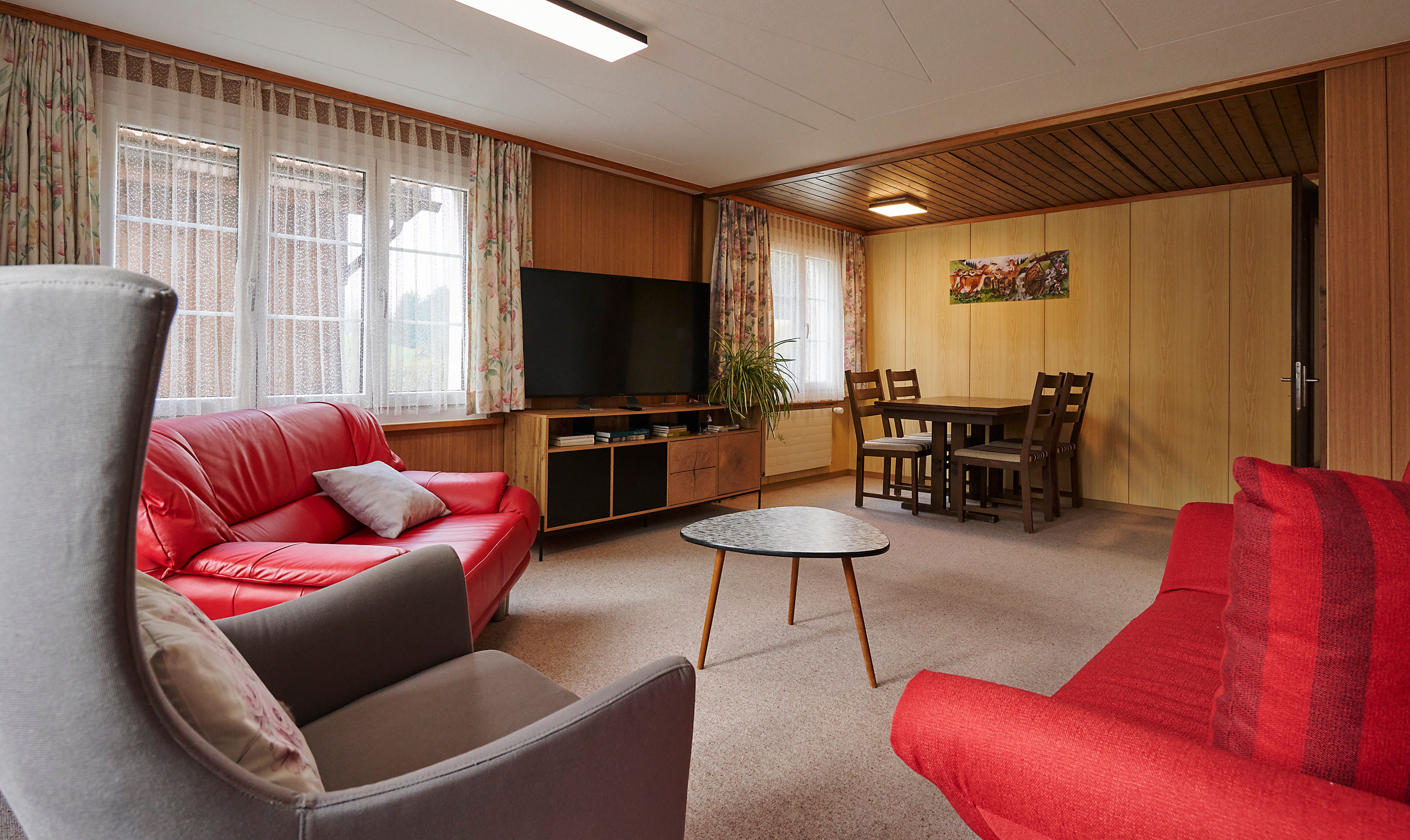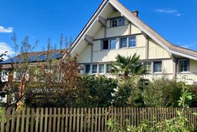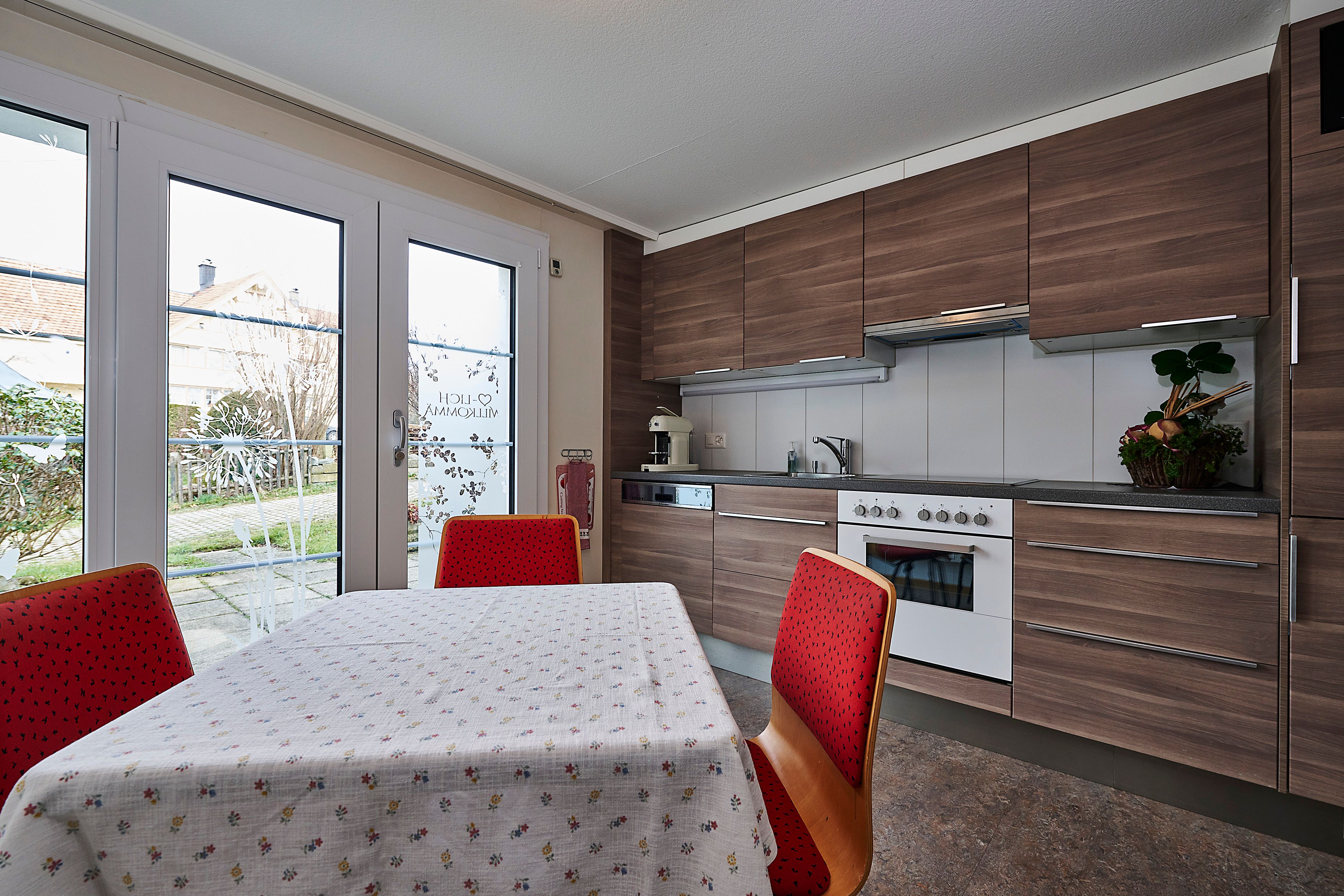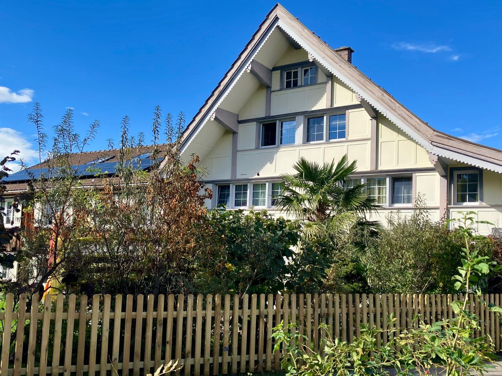 Draußen lädt der zur gemeinschaftlichen Nutzung bestimmte Garten zu ruhigen Stunden inmitten grüner Natur ein. Die Terrasse bietet Ihnen den perfekten Ort, um mit Ihren Liebsten zusammenzusitzen und die ruhige Atmosphäre zu genießen. Hier können Sie nach einem erlebnisreichen Tag entspannen und die frische Luft des Schweizer Mittellands einatmen.