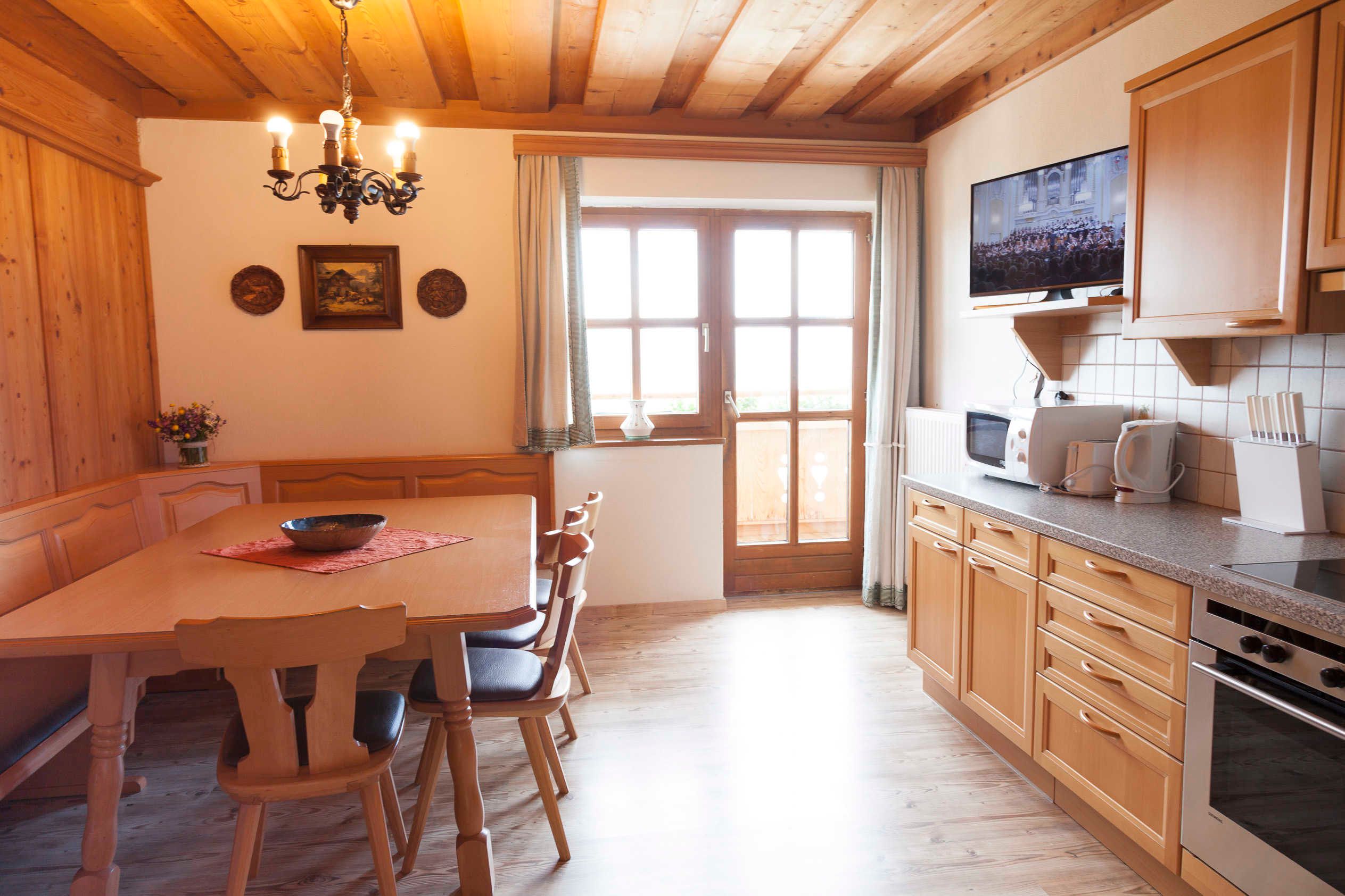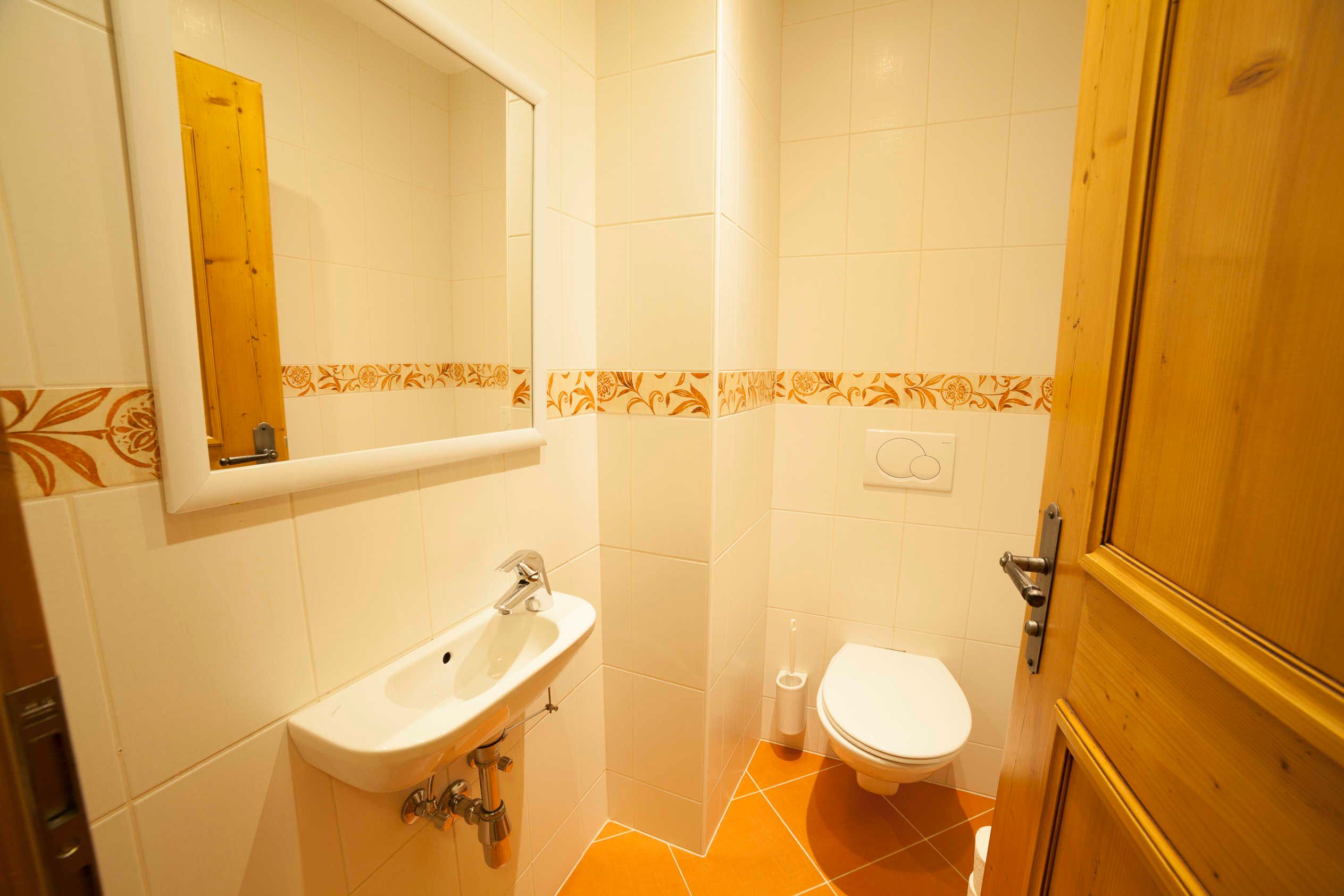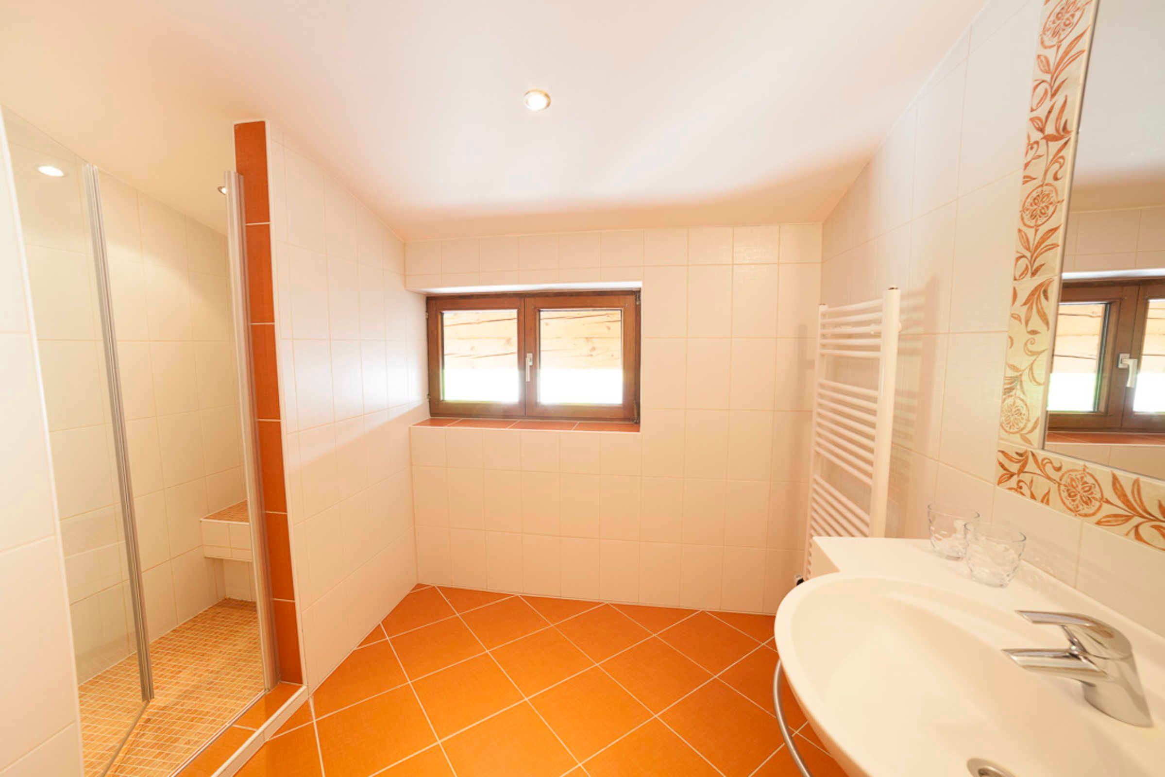 Eine Küche mit gemütlicher großer Sitzecke und 2 Balkone, davon einer mit Blick auf die Skipiste bzw. zum hauseigenen See und der andere mit Blick ins Tal. Ein Badezimmer mit Doppelwaschbecken und Dusche, WC ist extra.