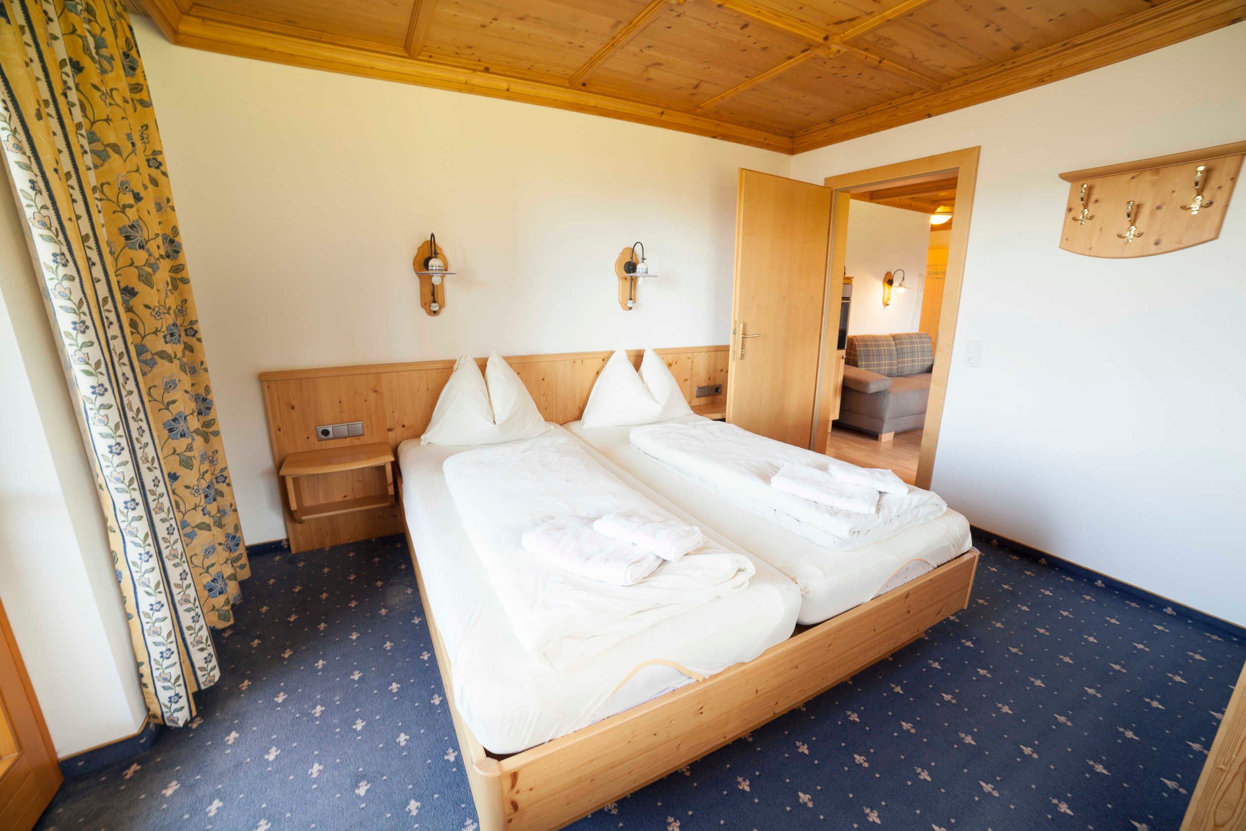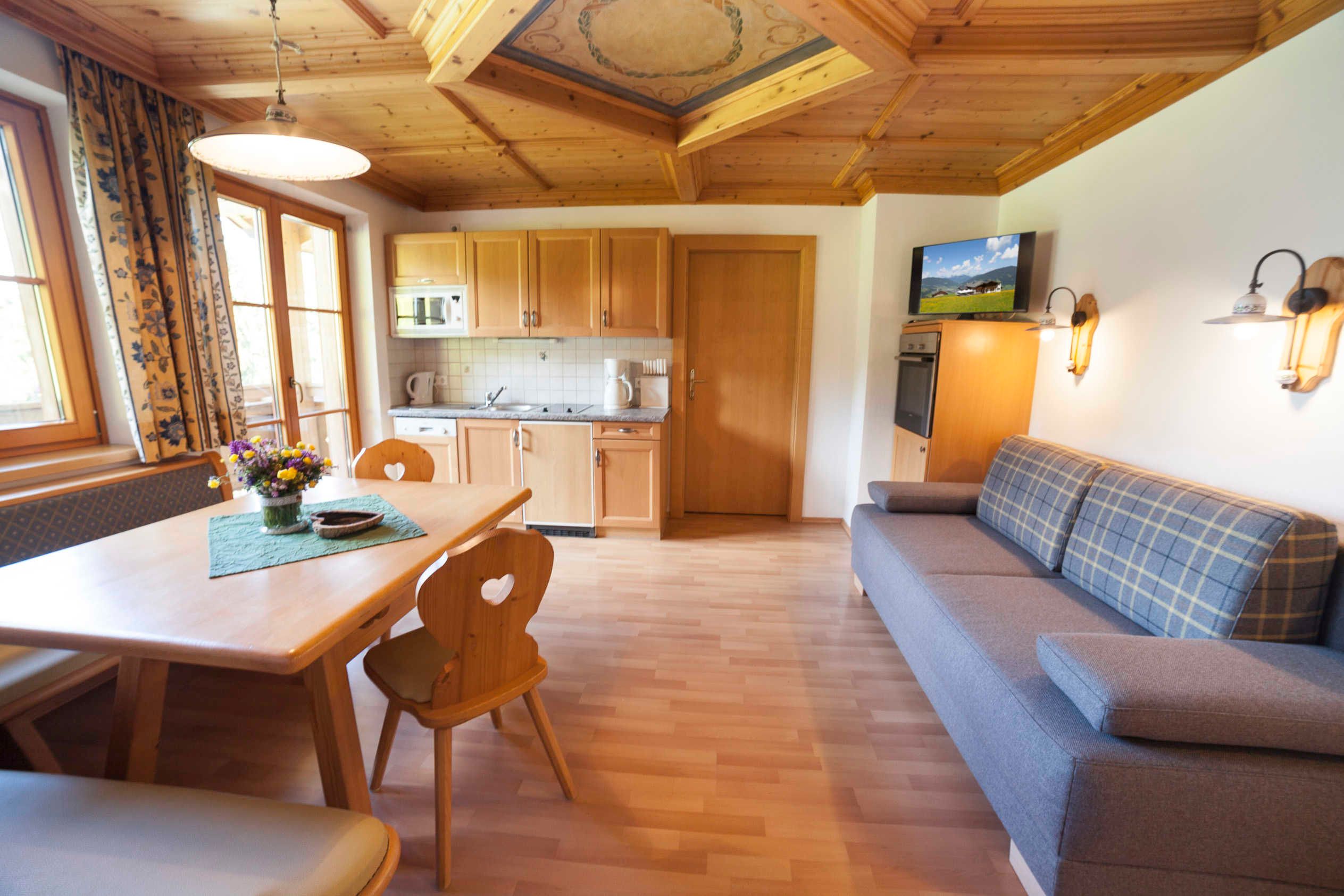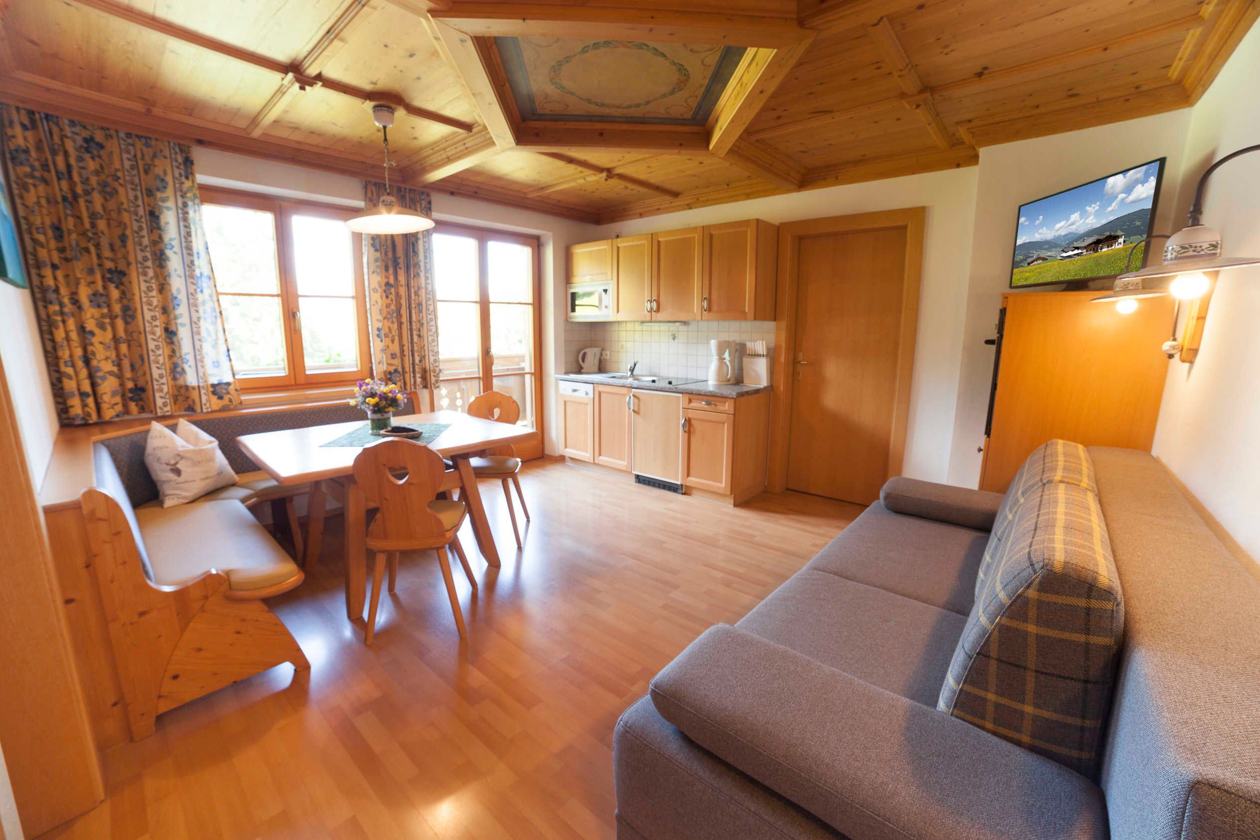 Das Appartement Lackenkogel für 4 bis 7 Personen ist ausgestattet mit 2 getrennten Schlafzimmern, davon eines mit 3 Betten und das andere mit 2 Betten; ein geräumiger Wohnschlafraum mit Doppelausziehcouch und voll ausgestatteter Kochecke.