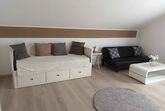 Das angrenzende Wohnzimmer ist vielseitig gestaltet und bietet nicht nur ein zusätzliches, ausziehbares Bett, das die Liegefläche auf komfortable 150-160 cm vergrößert, sondern auch eine Klappcouch, die für Erwachsene als auch Kinder geeignet ist. Ob für die ganze Familie oder den Besuch von Freunden – hier finden bis zu fünf Personen ausreichend Platz.