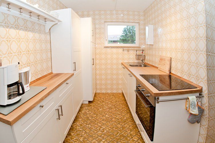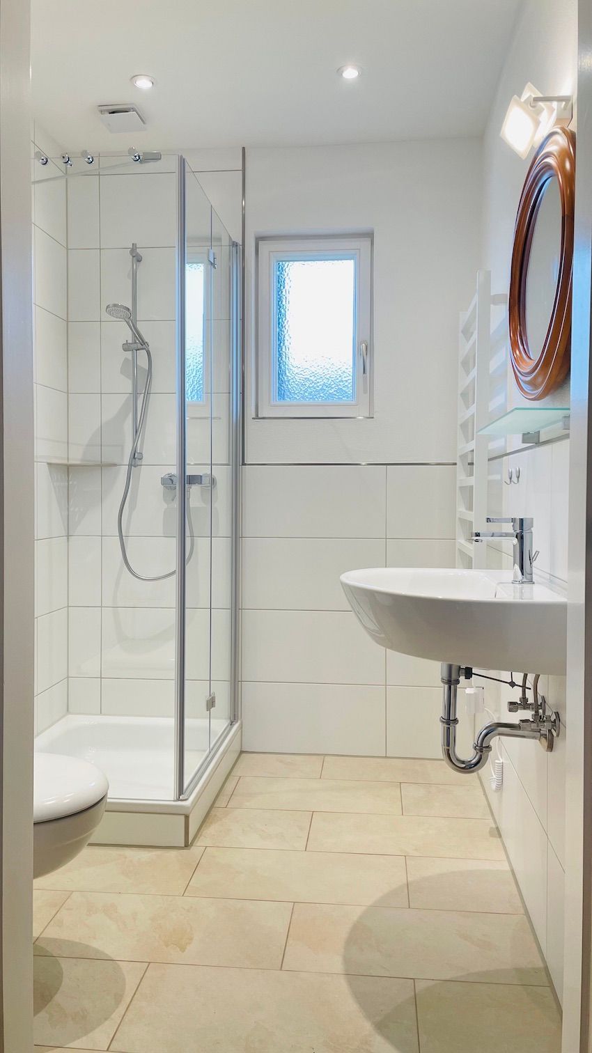 Die Küche ist voll ausgestattet mit Ceranherd, Backofen, Kaffeemaschine, Wasserkocher, Kühlschrank, Elektrogrill und weiteren Geräten. Das frisch renovierte Duschbad wird durch ein separates Gäste-WC ergänzt, in den Schlafzimmern befinden sich zusätzliche Waschbecken.