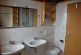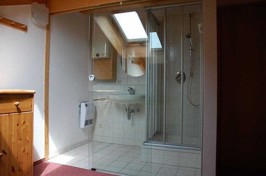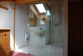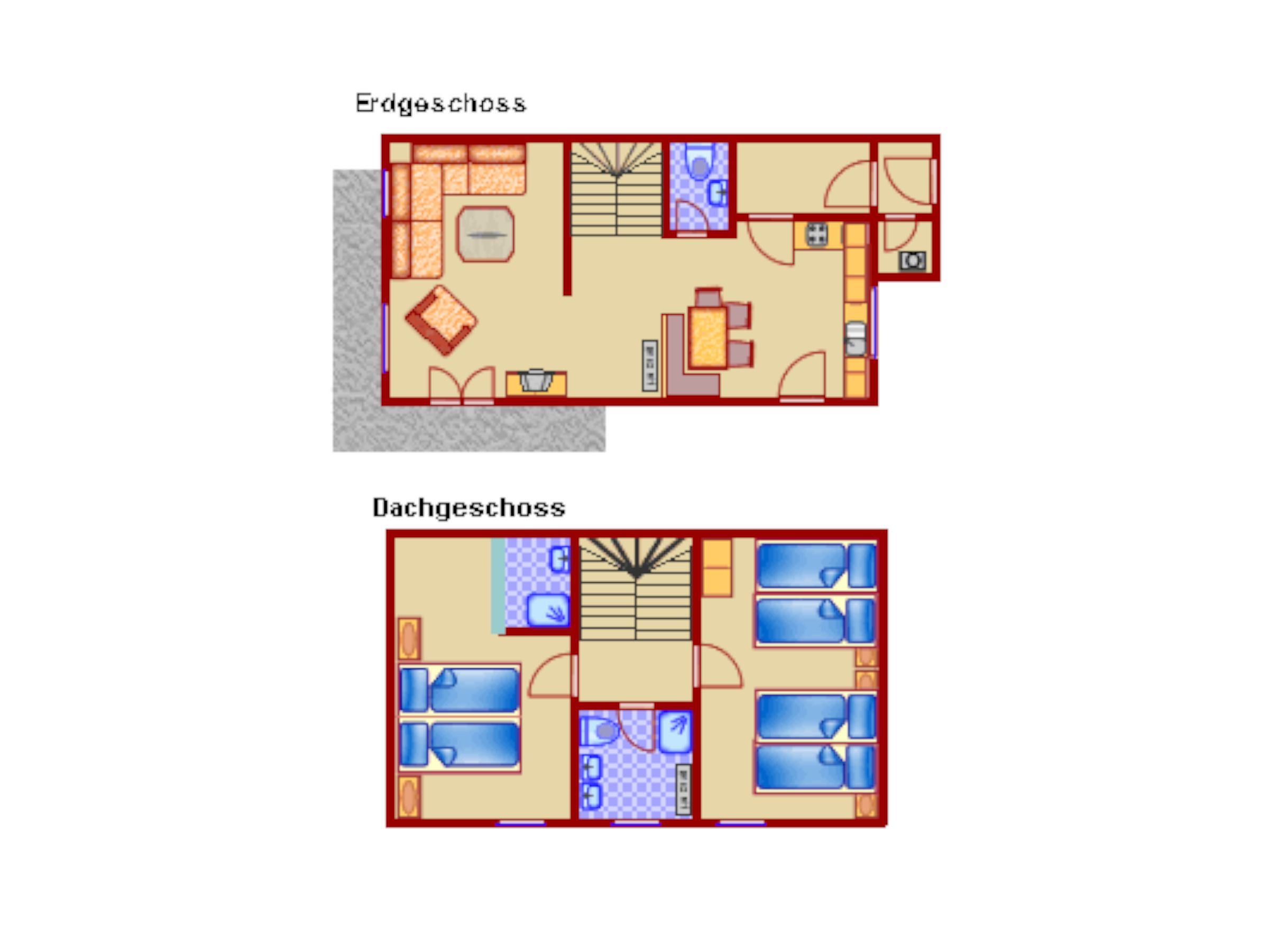 Im Obergeschoss liegen ein Schlafzimmer mit Doppelbett und integriertem Bad mit Dusche und Waschbecken, ein weiteres Schlafzimmer mit vier Einzelbetten sowie ein großzügiges Badezimmer mit Dusche, zwei Waschbecken und WC. Ein Kinderbett, eine Treppensicherung und ein Kinderhochstuhl sind ebenfalls vorhanden.
