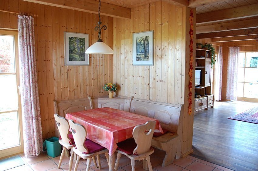 Das Haus wurde überwiegend aus naturbelassenen, heimischen Hölzern errichtet und kombiniert einen Innenausbau aus Holz mit Elementen aus Glas und Naturstein. Die Ausstattung ist umfassend und vollständig.
