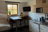 Die Küchenzeile ist mit einem Kochfeld, Wasserkocher, Kaffeemaschine und Toaster ausgestattet, ideal für selbsterstellte Mahlzeiten. Gemütliche Sitzgelegenheiten laden zum Verweilen ein.