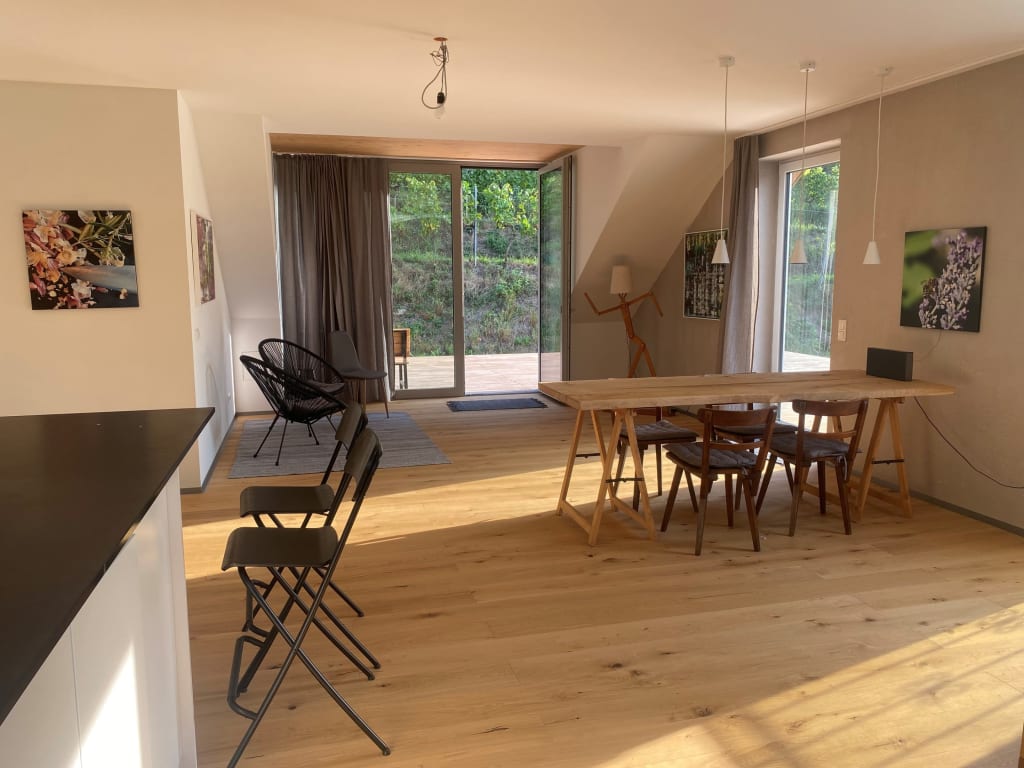 Neu gestaltete kleine Ferienwohnung mit eigenem Kochbereich – mit Nutzung der herrlichen Weinberg-Holzterrasse. Mit natürlichen Materielien gebaut und tollem Ausblick auf unsere einzigartigen Weinberg-Terrassen.