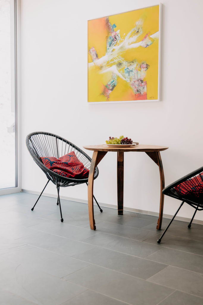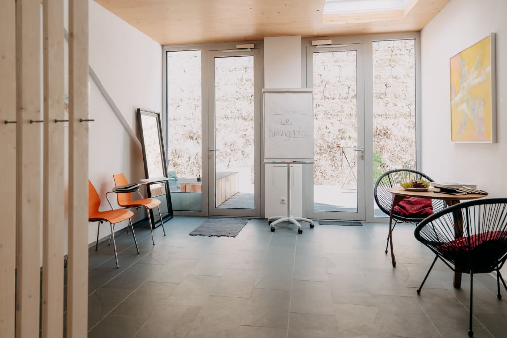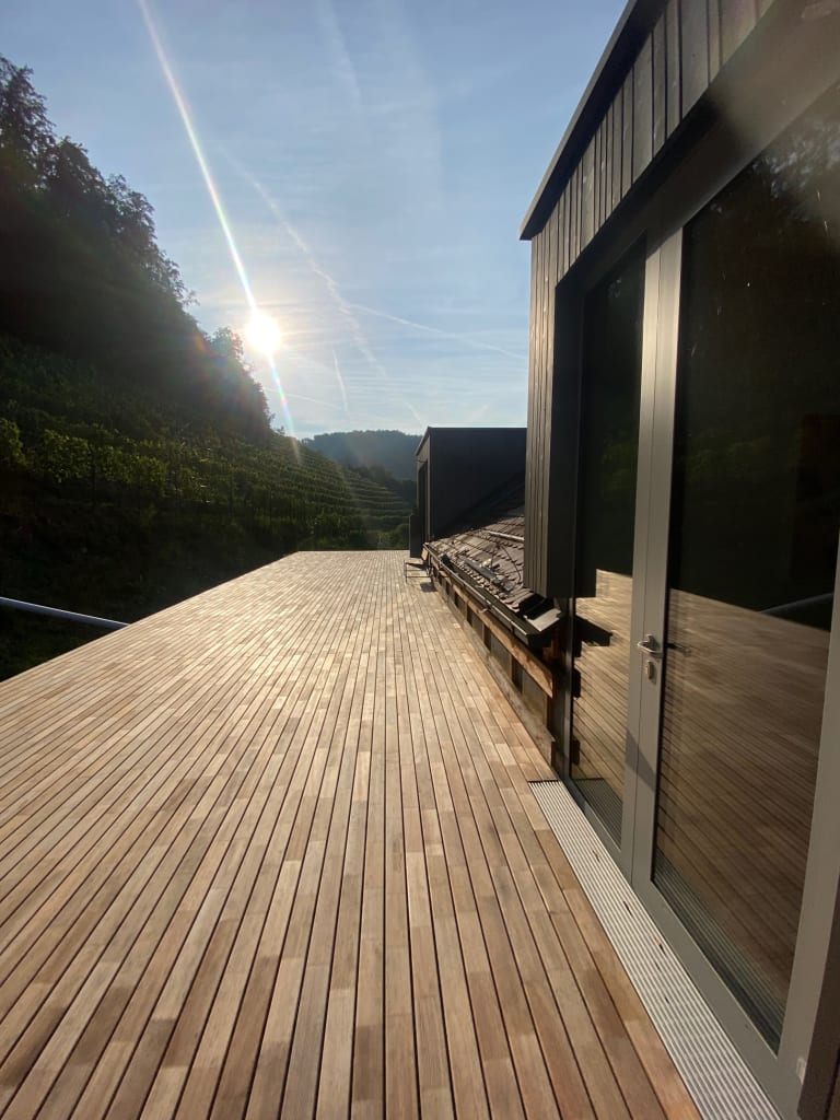 Natürliche, großzügige Erholungsräume, gestaltet mit Lehmputz, Naturstein-Schiefer, Eichenparkett und die Weinberg-Holzterrasse – so lässt es sich auf rund 500 m Seehöhe gut durchatmen.