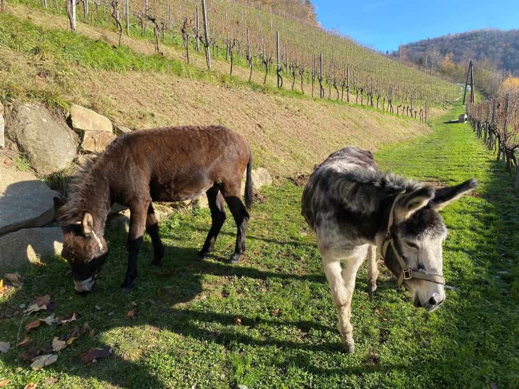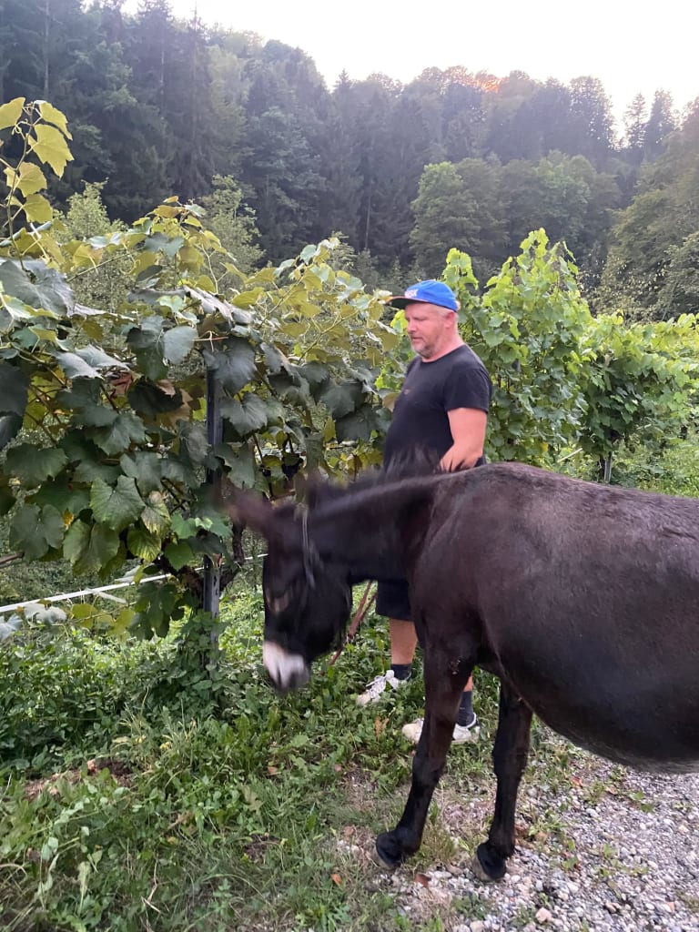 Manfred seine Zimmer baut die Ingrid. Urlaub im Weinberg. Wo sich Esel und Biene Guten Morgen sagen.