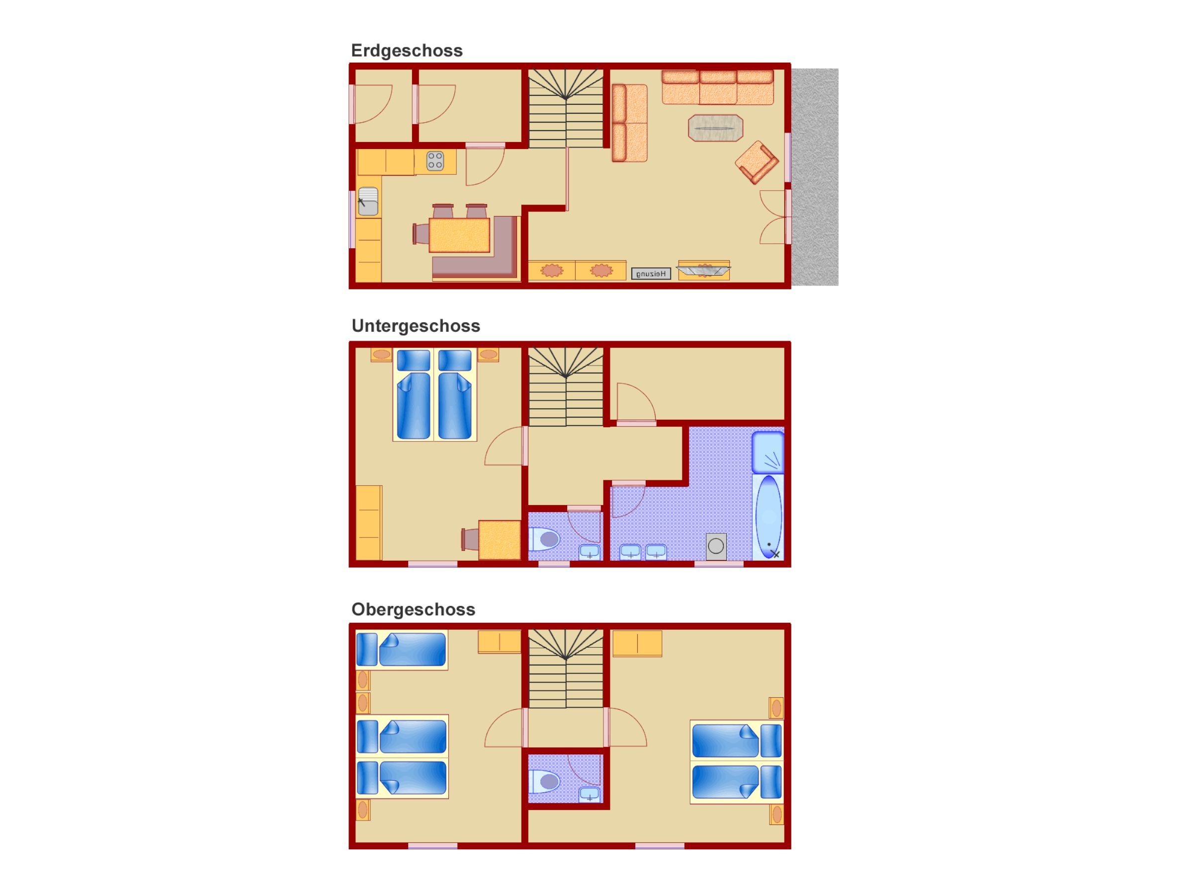 Das Ferienhaus bietet viel Platz auf drei Etagen und ist ideal für Familien oder Gruppen. Im Erdgeschoss befinden sich Wohnbereich, Küche und Esszimmer mit direktem Zugang zur überdachten Terrasse und zum geschützten Freisitz. Sonnenliegen und eine Feuerschale sorgen für entspannte Stunden im Freien.