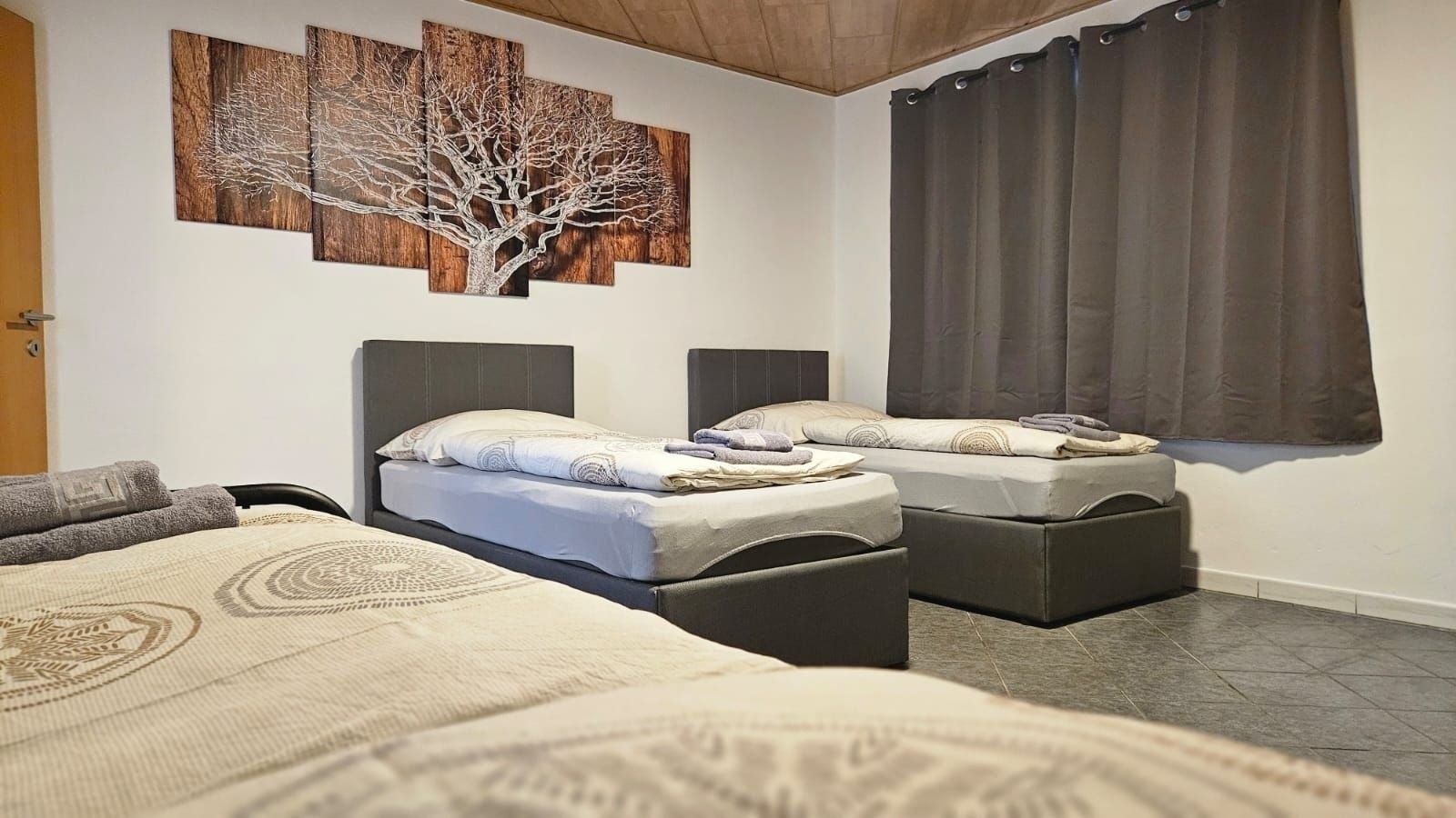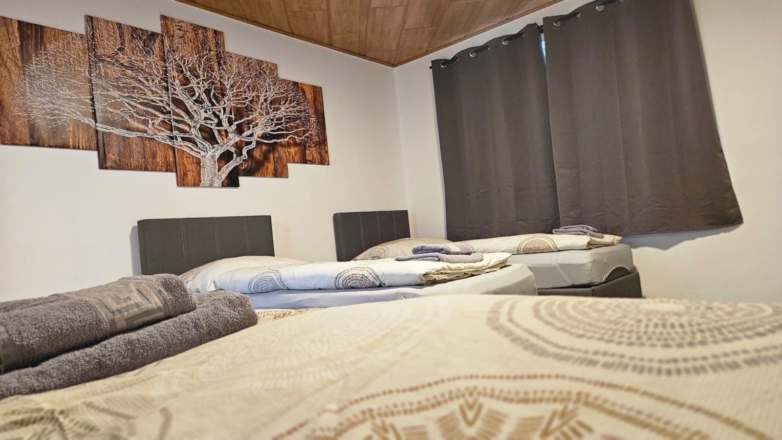 Im Apartment befinden sich 2 Boxspringbetten (90 x 200 cm), welche zusammengeschoben ein Kingsizebett von 180 x 200 cm ergibt ohne Besucherritze) sowie 2 stabile Gästebetten (90 x 200 cm) aus Metall.
