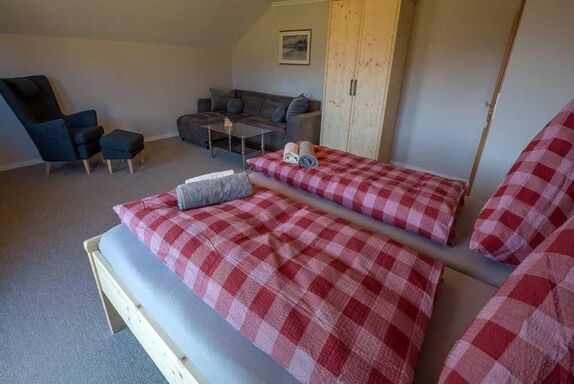 Zu dieser Wohnung kann ein weiteres Zimmer mit ca. 7 qm dazugebucht werden und zu einer Einheit für 5 Erwachsene erweitert werden.