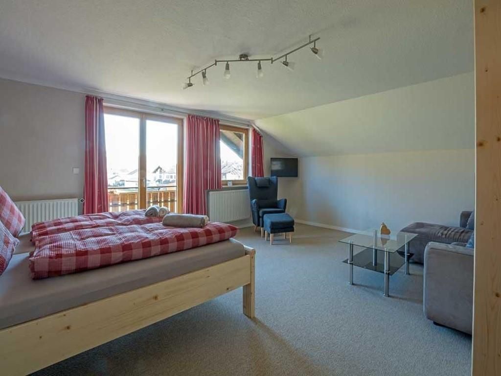 Gipfelblick pur ist in der ca. 80 qm großen Wohnung unterm Dach des Bauernhauses gewiss. Ein Wohn- und Schlafzimmer mit Tür zum Balkon, ein Schlafzimmer seperat, eine Wohnküche mit Ausgang zum Balkon, neues Dusch-und Wannenbad, Gäste-WC seperat.