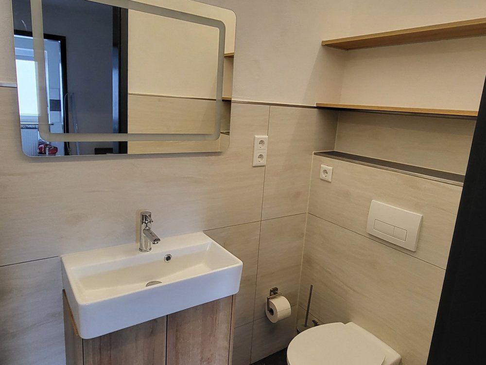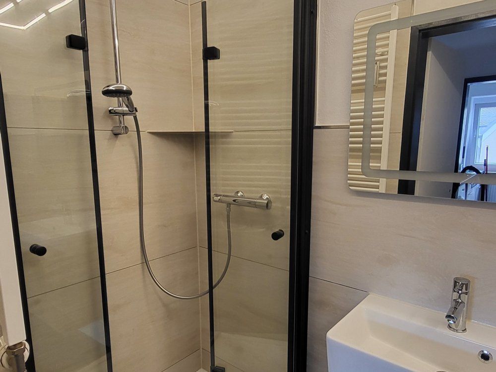 Das Badezimmer bietet eine moderne Dusche und ein WC.