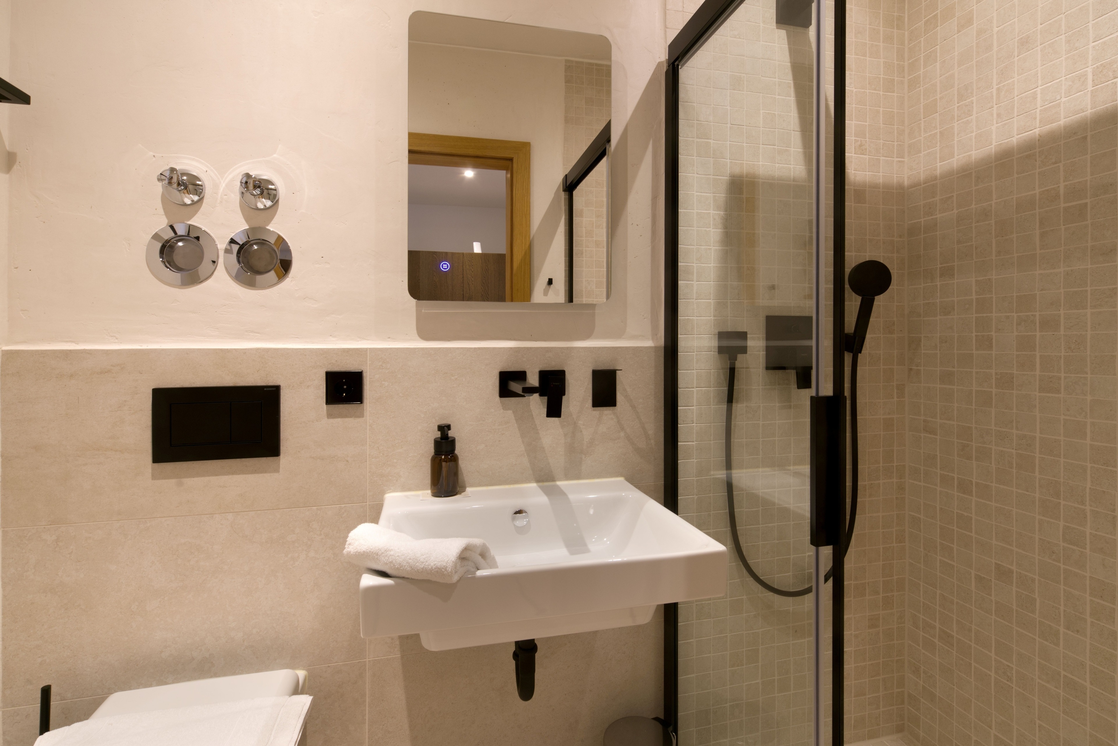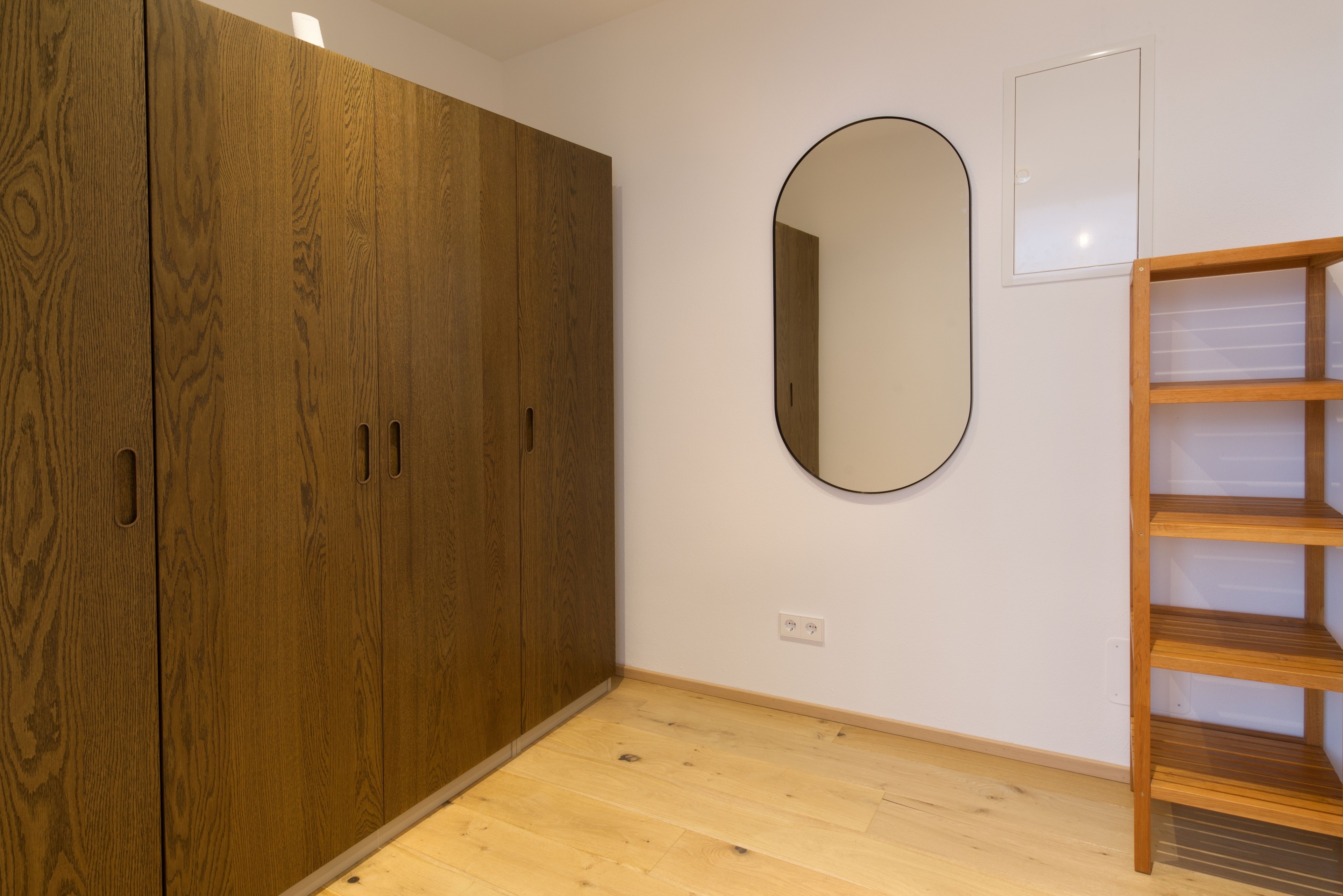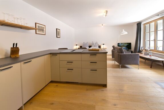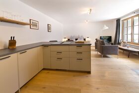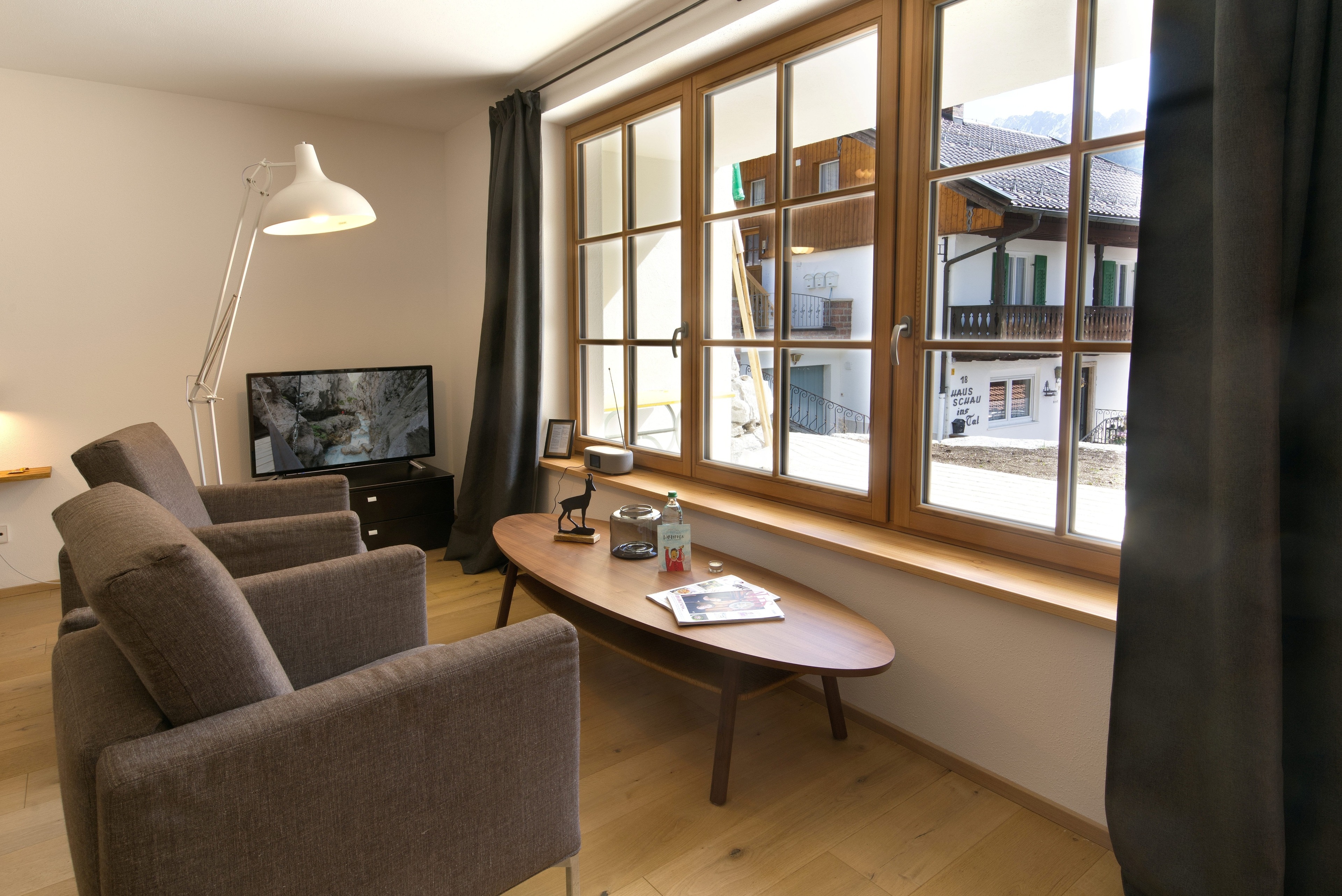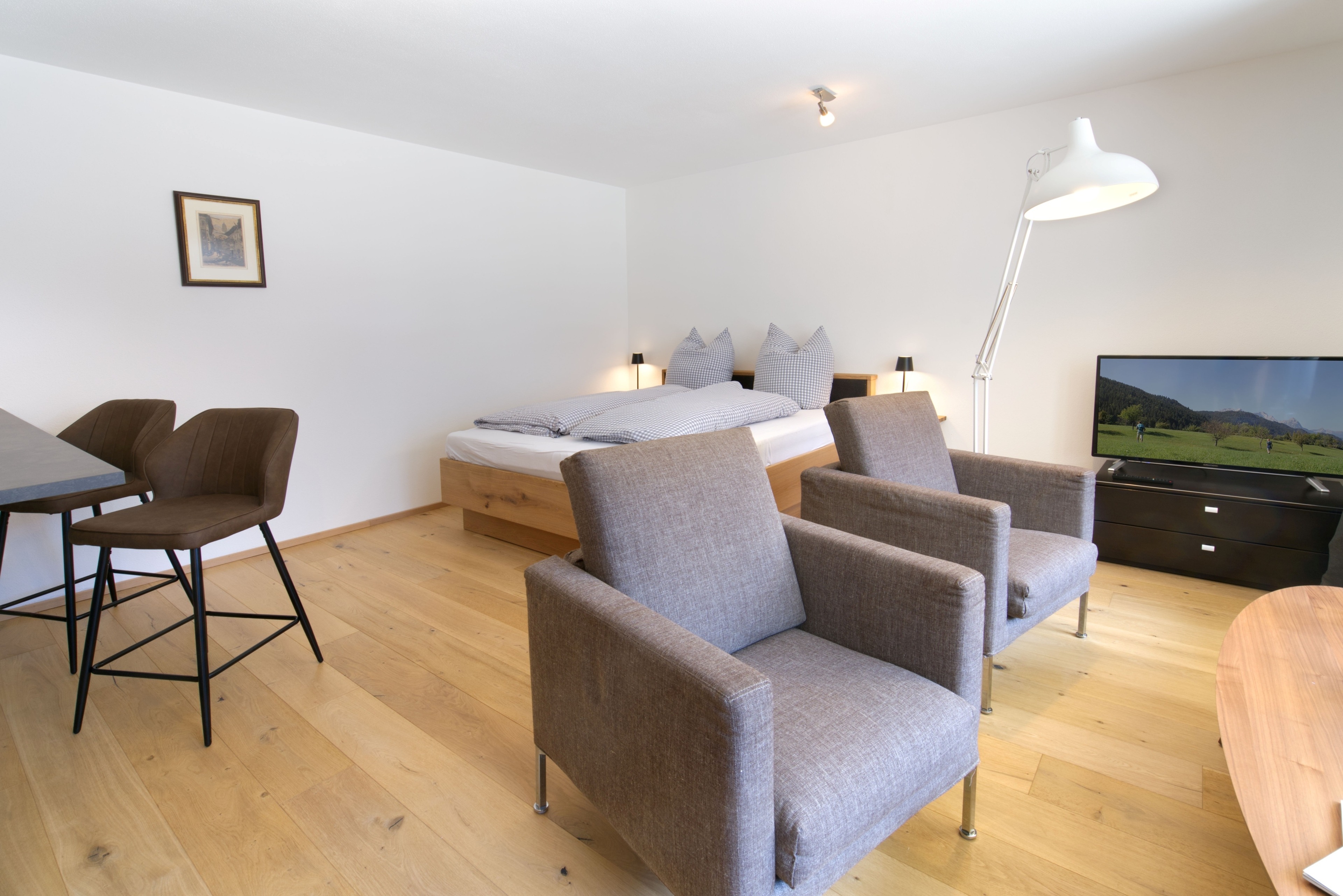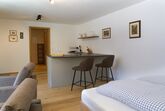 Die hochwertig im modernen Alpinstil eingerichtete Wohnung verfügt über einen offenen, großzügigen Wohn- Schlafraum mit Panoramafenster und zwei gemütlichen Sesseln für die Musestunden, sowie einen Flachbild-TV. Das Boxspringbett 180/200cm ergänzt das Angebot. Die gut ausgestatte Einbauküche mit Kühl-/ Gefrierkombination und Spülmaschine ist über Eck gebaut und umfasst somit auch den Essbereich mit Barstühlen. Der hochwertige Eichen- Dielenboden ist mit einer Fussbodenheizung bestückt. Über einen Vorraum mit Ablagemöglichkeiten und einen Kleiderschrank gelangt man zur Nasseinheit mit ebenerdiger Dusche/WC mit Waschbecken.
