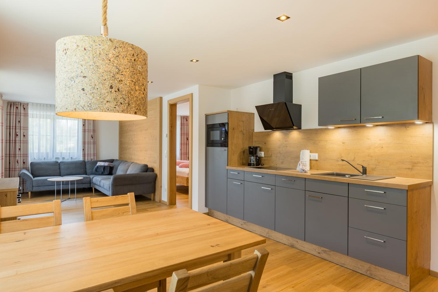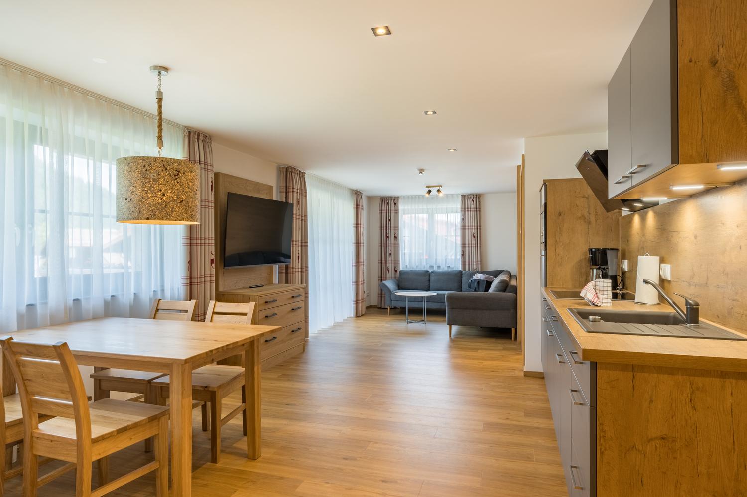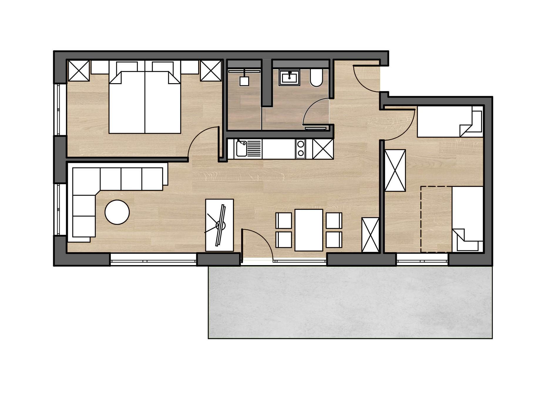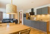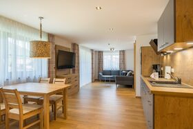 Geräumiges Appartement (62 m²) mit 2 getrennten Schlafzimmern für 4 Personen. Wohnzimmerecke und Küche mit Geschirrspüler. Alle Leistungen des Hotels inklusive (Frühstück, Schwimmbad, Sauna, Fitnessraum, Hobbyraum).