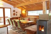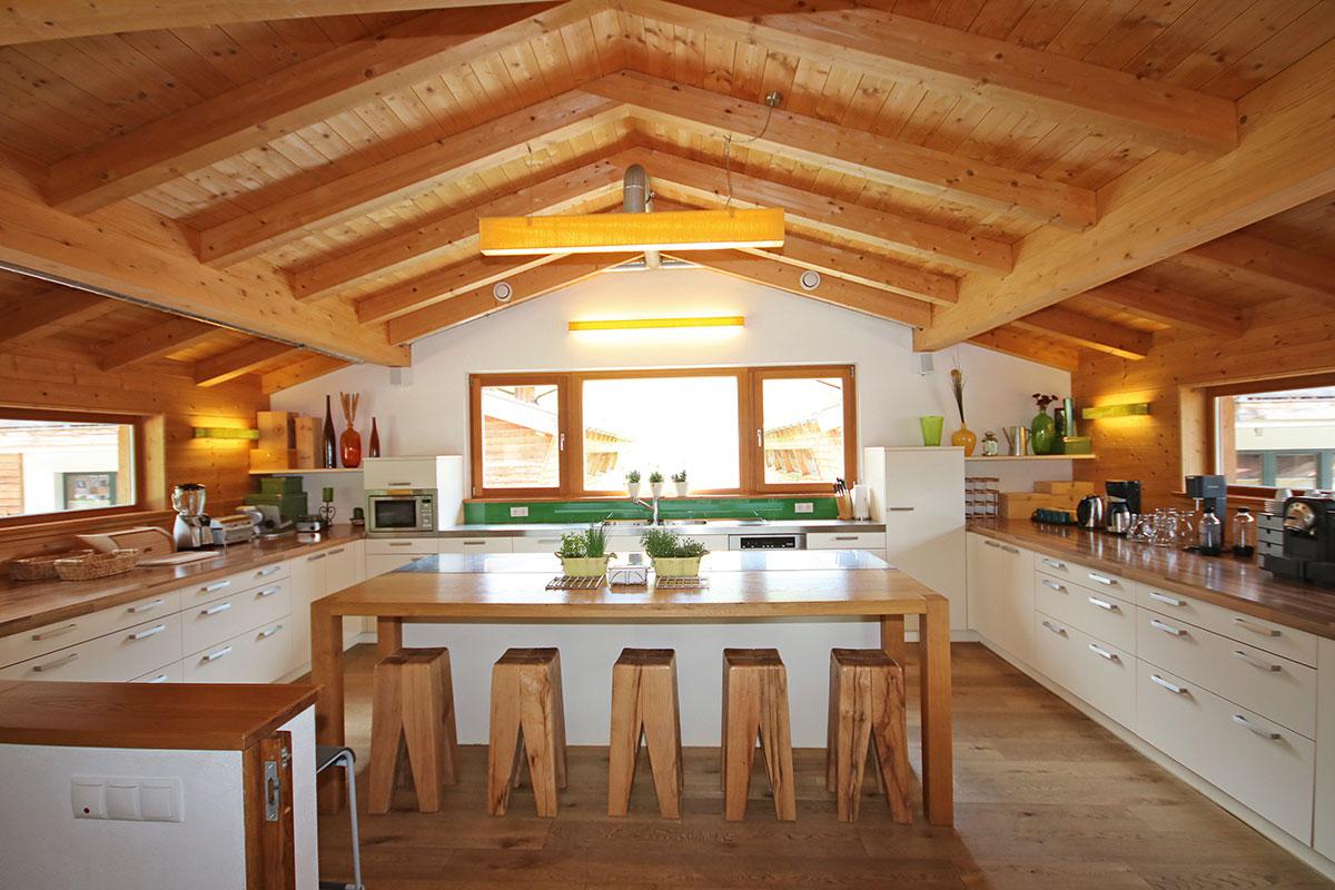 220m2, Alpin Loft mit Küche, Alpin Atrium, 4 Schlafnester mit Dusche/WC, Sonnenraum mit Sauna und Doppelbett. Basismietpreis bei Belegung bis 12 Personen, Maximalbelegung 18 Personen mit Extrazimmer bis 24 Personen. Die Küche ist großzügig mit Porzellan, Gläsern und Besteck für 24 Personen ausgestattet. Hobbyköche finden alles gängigen Küchengeräte und eine breite Palette an Pfannen und Töpfen.