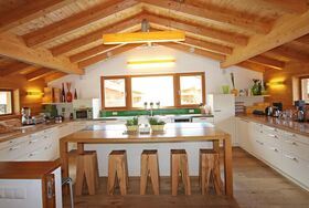 220m2, Alpin Loft mit Küche, Alpin Atrium, 4 Schlafnester mit Dusche/WC, Sonnenraum mit Sauna und Doppelbett. Basismietpreis bei Belegung bis 12 Personen, Maximalbelegung 18 Personen mit Extrazimmer bis 24 Personen. Die Küche ist großzügig mit Porzellan, Gläsern und Besteck für 24 Personen ausgestattet. Hobbyköche finden alles gängigen Küchengeräte und eine breite Palette an Pfannen und Töpfen.