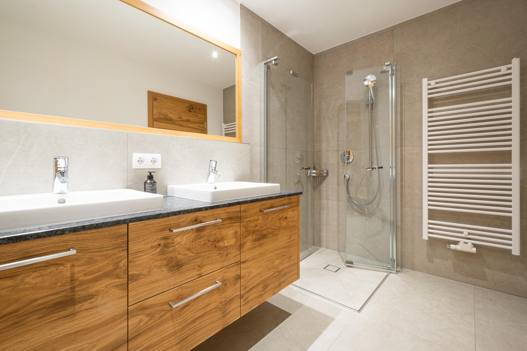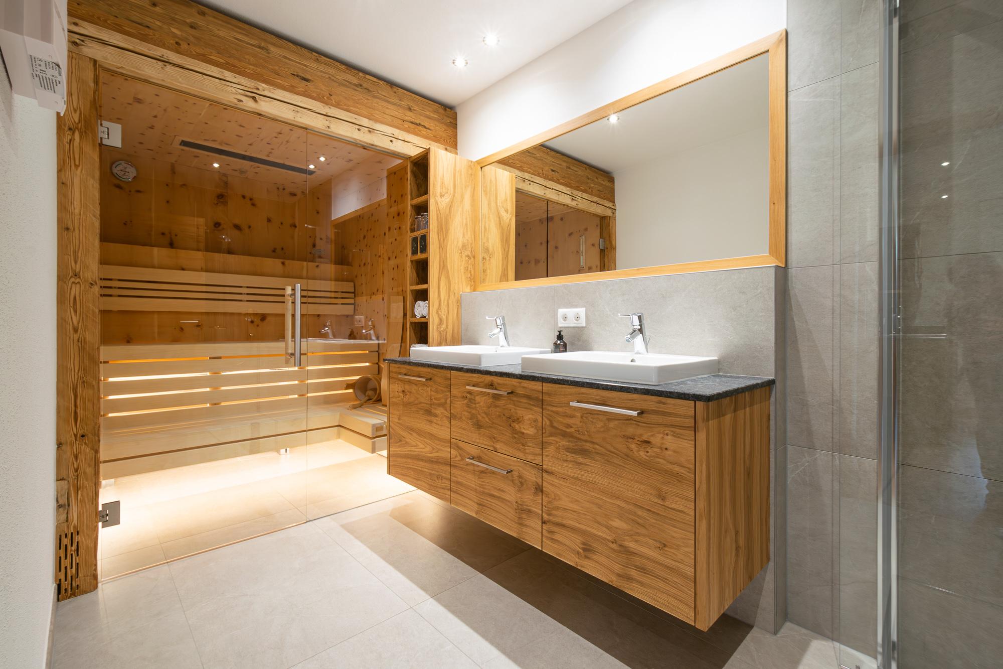 Die private Zirbensauna und Infrarotkabine im Badezimmer bieten entspannende Momente nach einem Spaziergang durch den Schnee – oder nach einem Besuch am Adventmarkt.