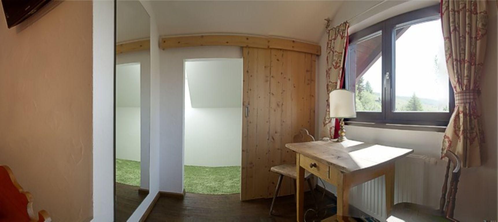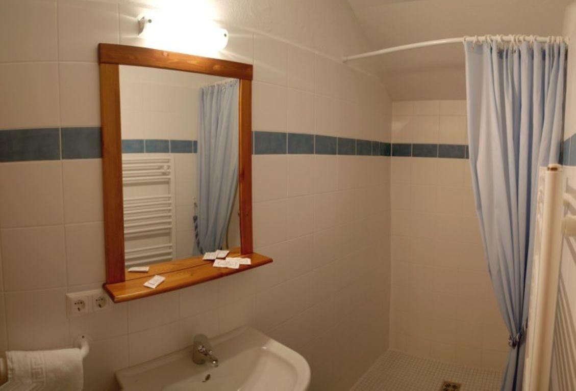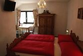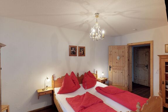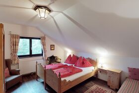 Vom Vorraum gelangt man außerdem in den 1. Stock, wo sich 2 sehr geräumige Schlafzimmer (1x mit einem Doppelbett und einem extra Bett und 1x mit einem Doppelbett und SAT-TV.) Diese beiden Räume sind nach Osten gerichtet. Die Doppelbetten wurden aus altem Holz (nur mit Holznägel) gefertigt und haben als Matratze ein „HÜSLER NATURNEST“, das sich dem Körper optimal anpasst. Ein weiteres kleines Dachzimmer mit 2 extra Betten befindet sich gleich neben dem Schlafzimmer mit dem SAT-TV.